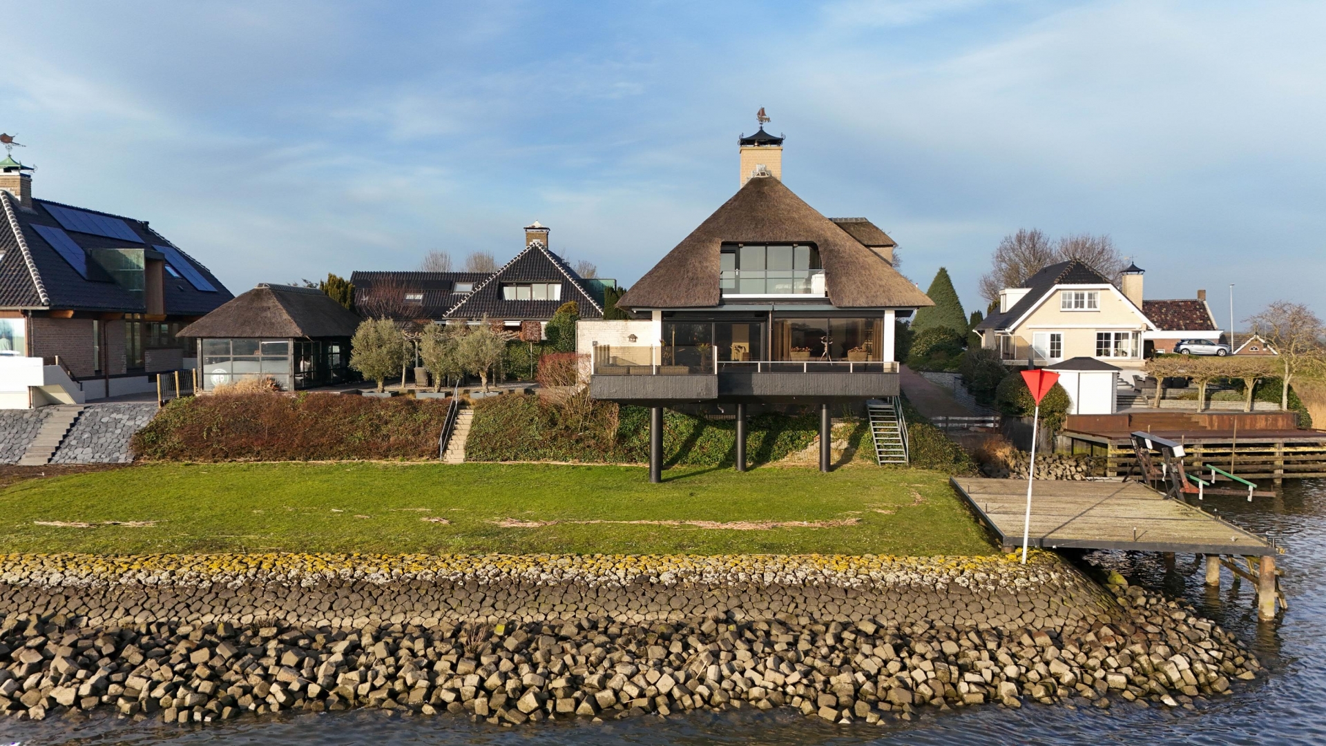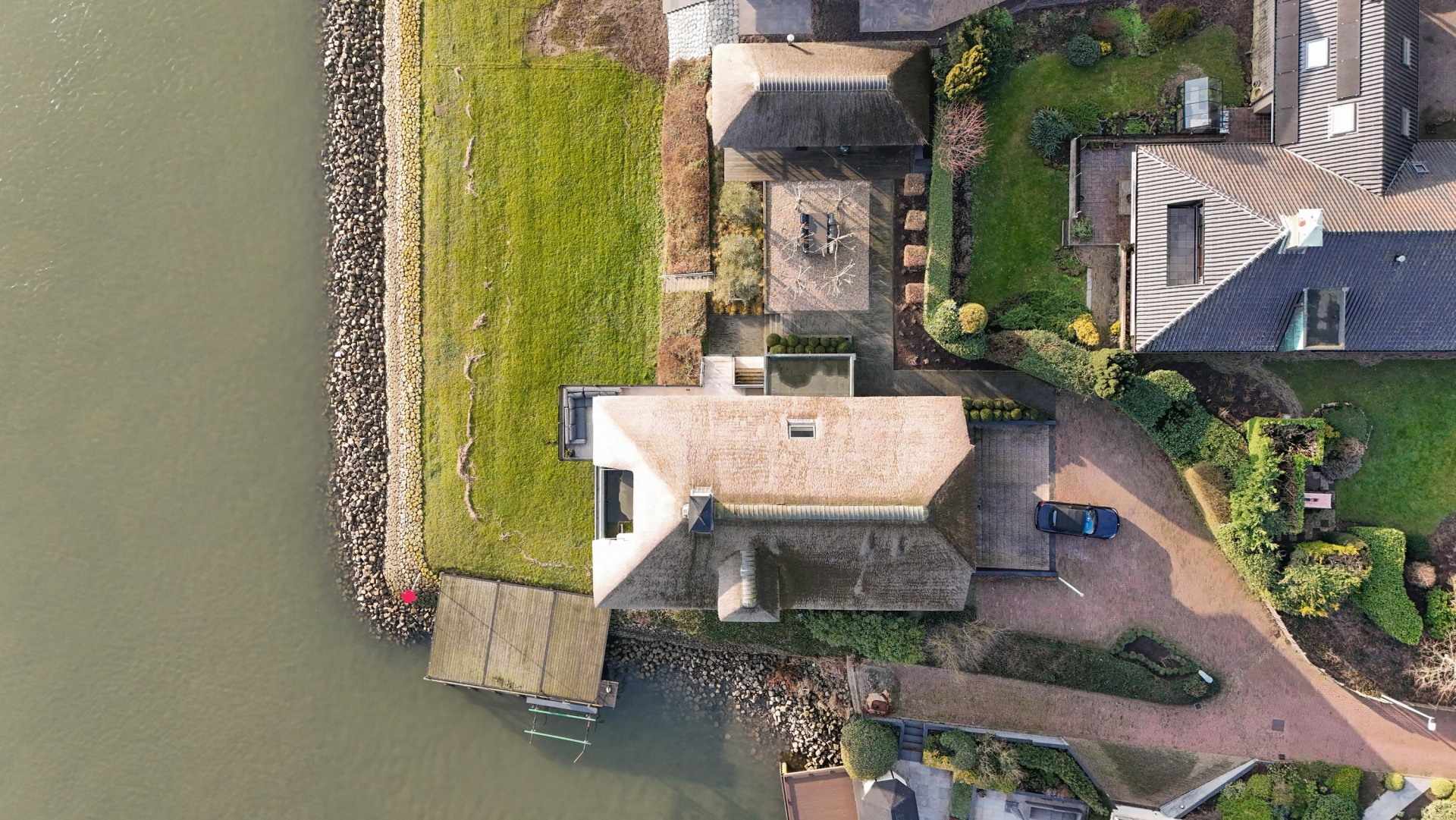 De villa staat op een royaal perceel van 1.342 m² eigen grond en is gebouwd in 1989, met hoogwaardige verbouwingen van recente datum. Het rieten dak is in 2024 nog volledig gerenoveerd en kan weer jaren mee. De architectuur past perfect bij de omgeving: stijlvol, tijdloos en met een sterke verbinding tussen binnen en buiten. Dankzij de ligging aan de rivier geniet je vanuit vrijwel iedere leefruimte van een panoramisch uitzicht over het water en het voorbijtrekkende scheepvaartverkeer.