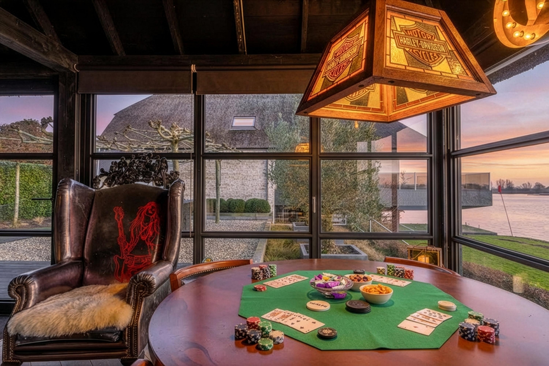 Aan de waterzijde bevindt zich de eigen aanlegsteiger met bootlift. Voor booteigenaren is dit een droom: geen gedoe met havens of wachttijden, maar direct varen wanneer jij dat wilt. De combinatie van het water, de tuin en het buitenverblijf maakt deze plek uniek in zijn soort.