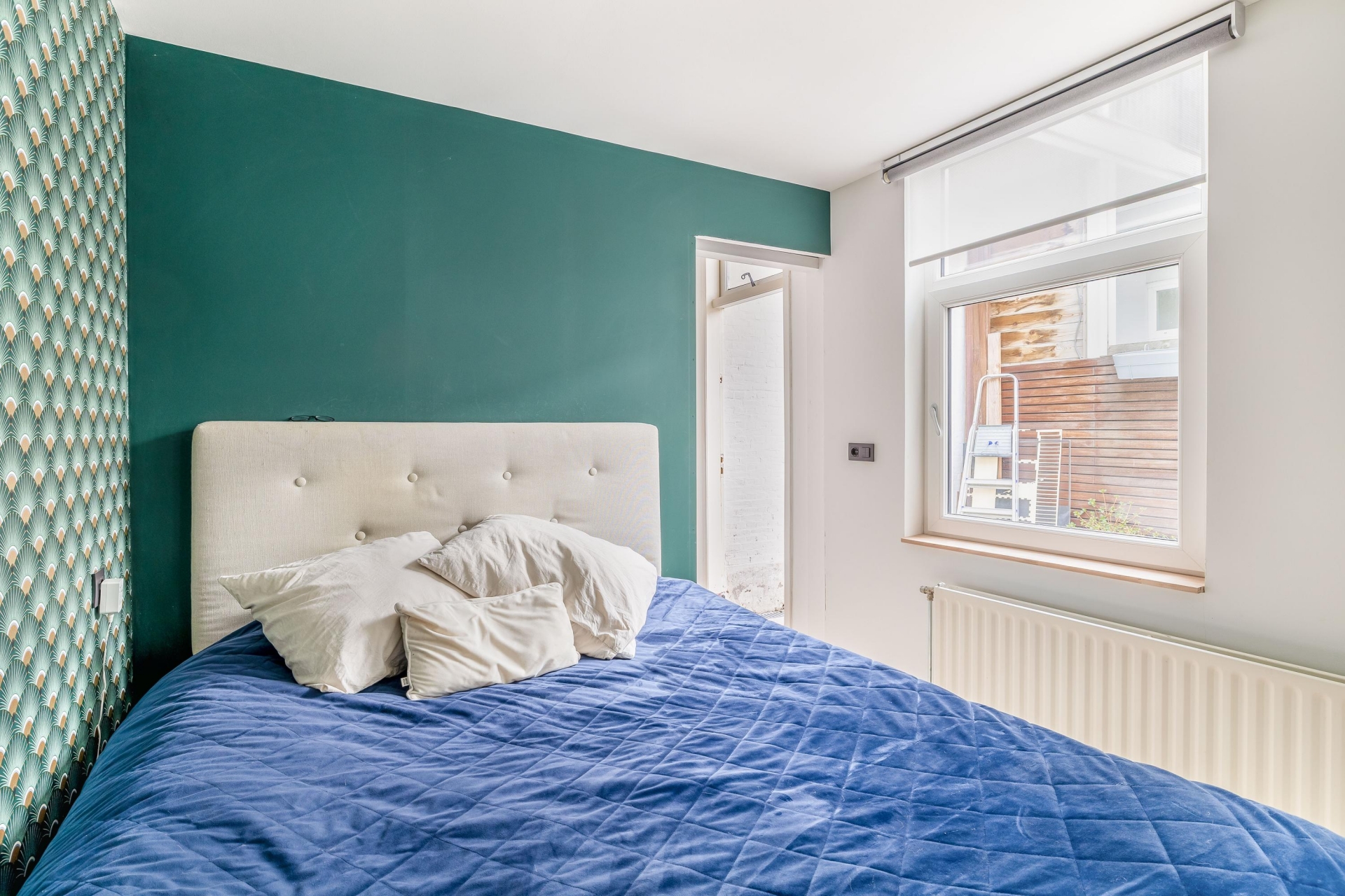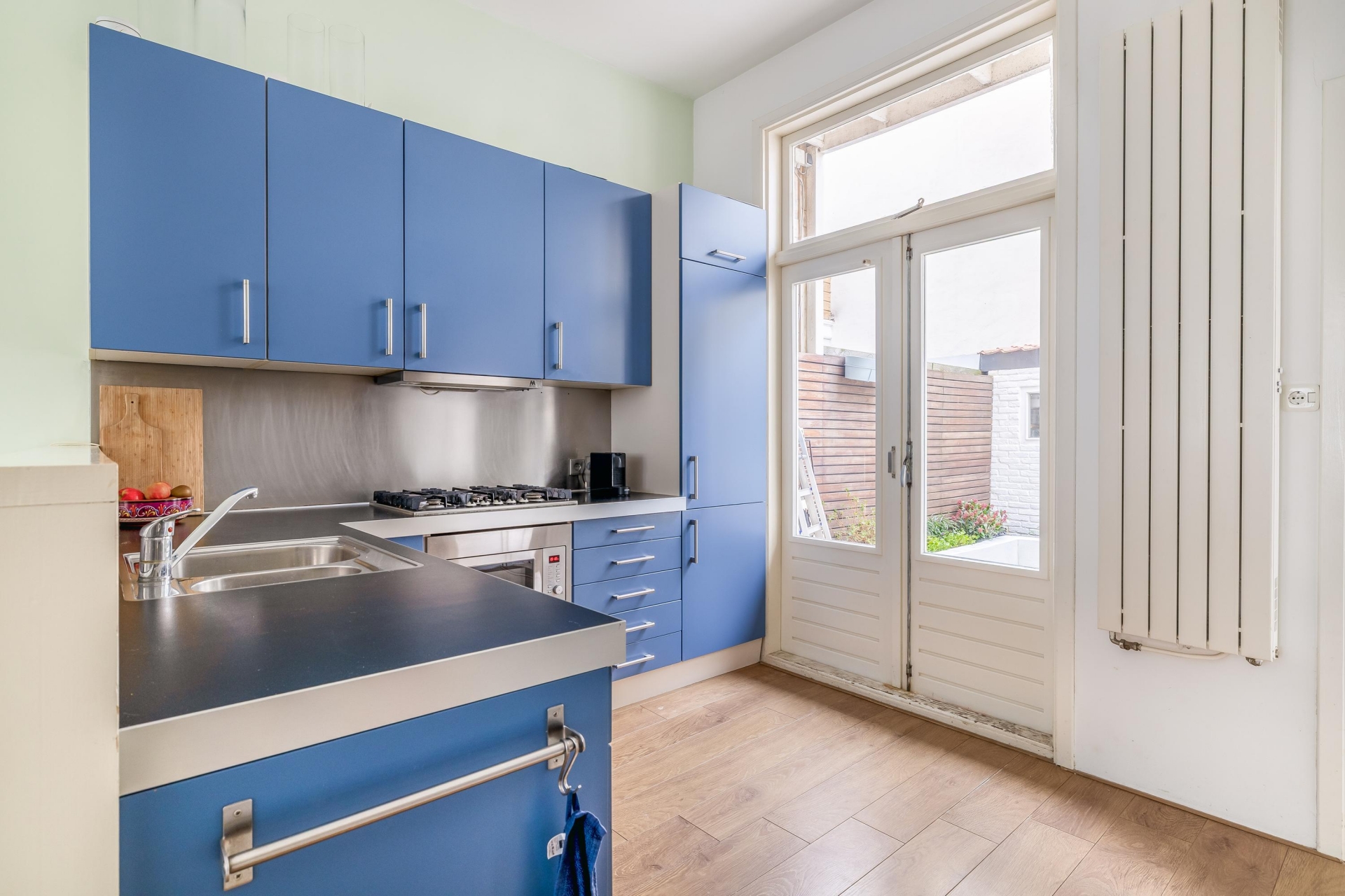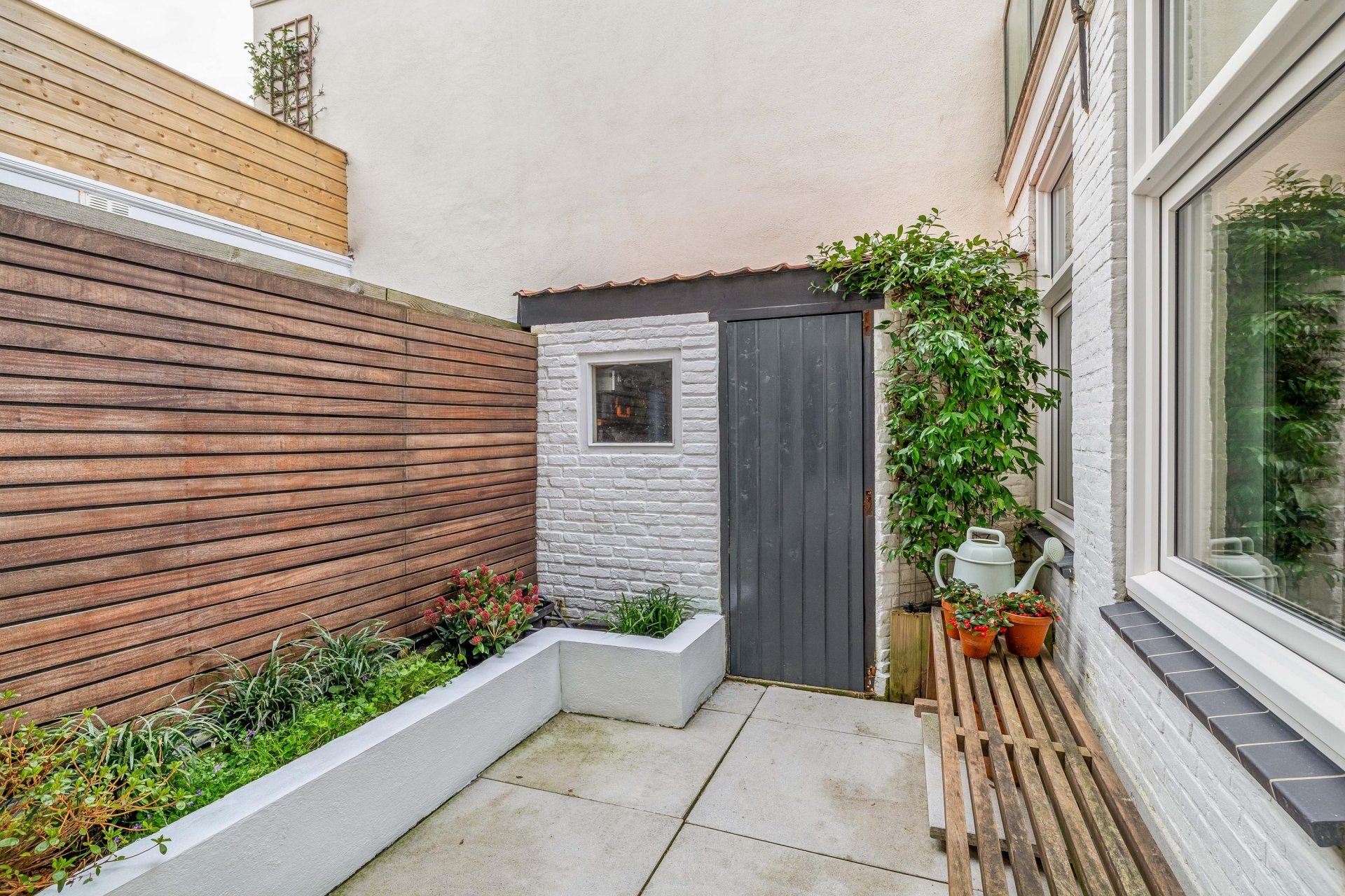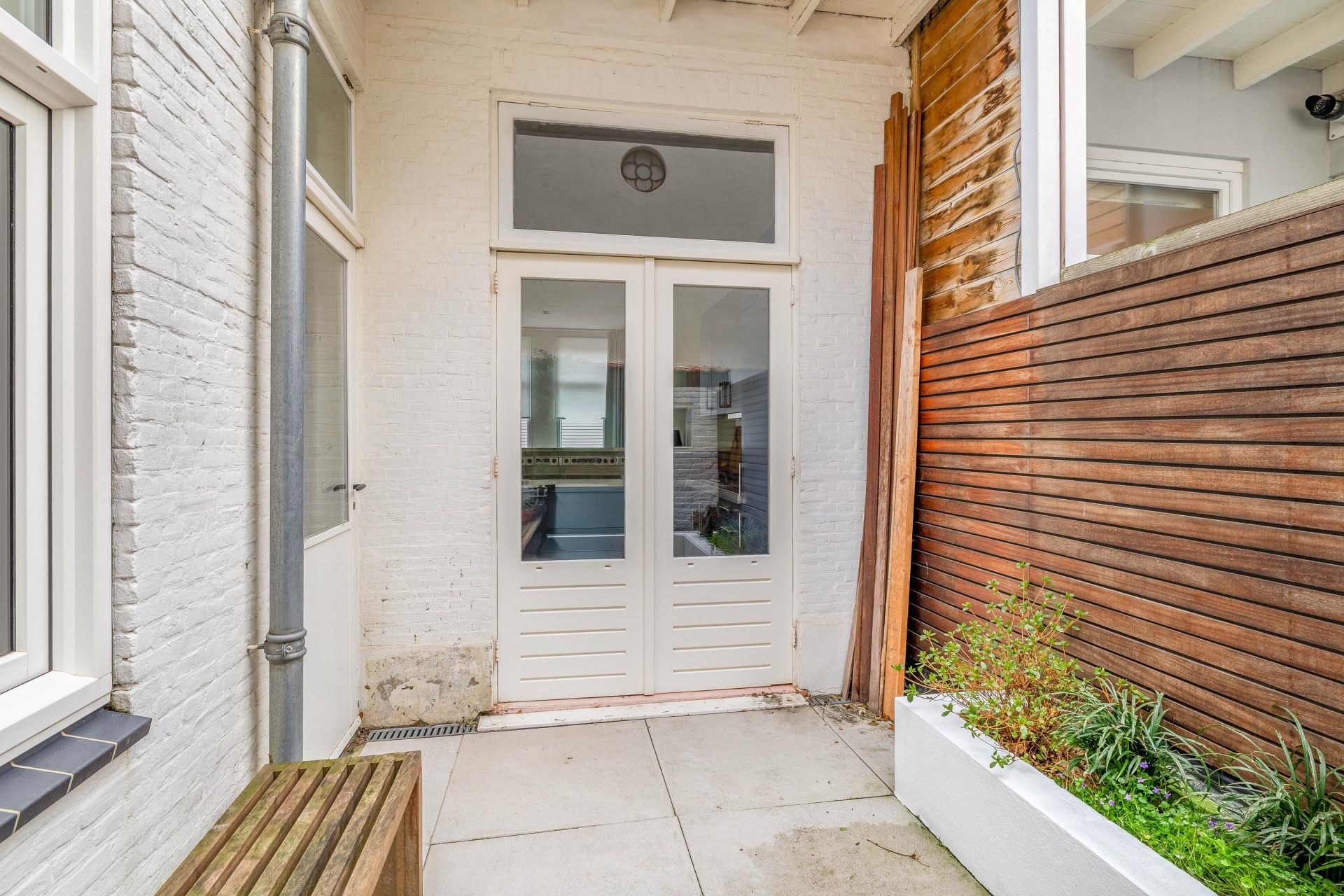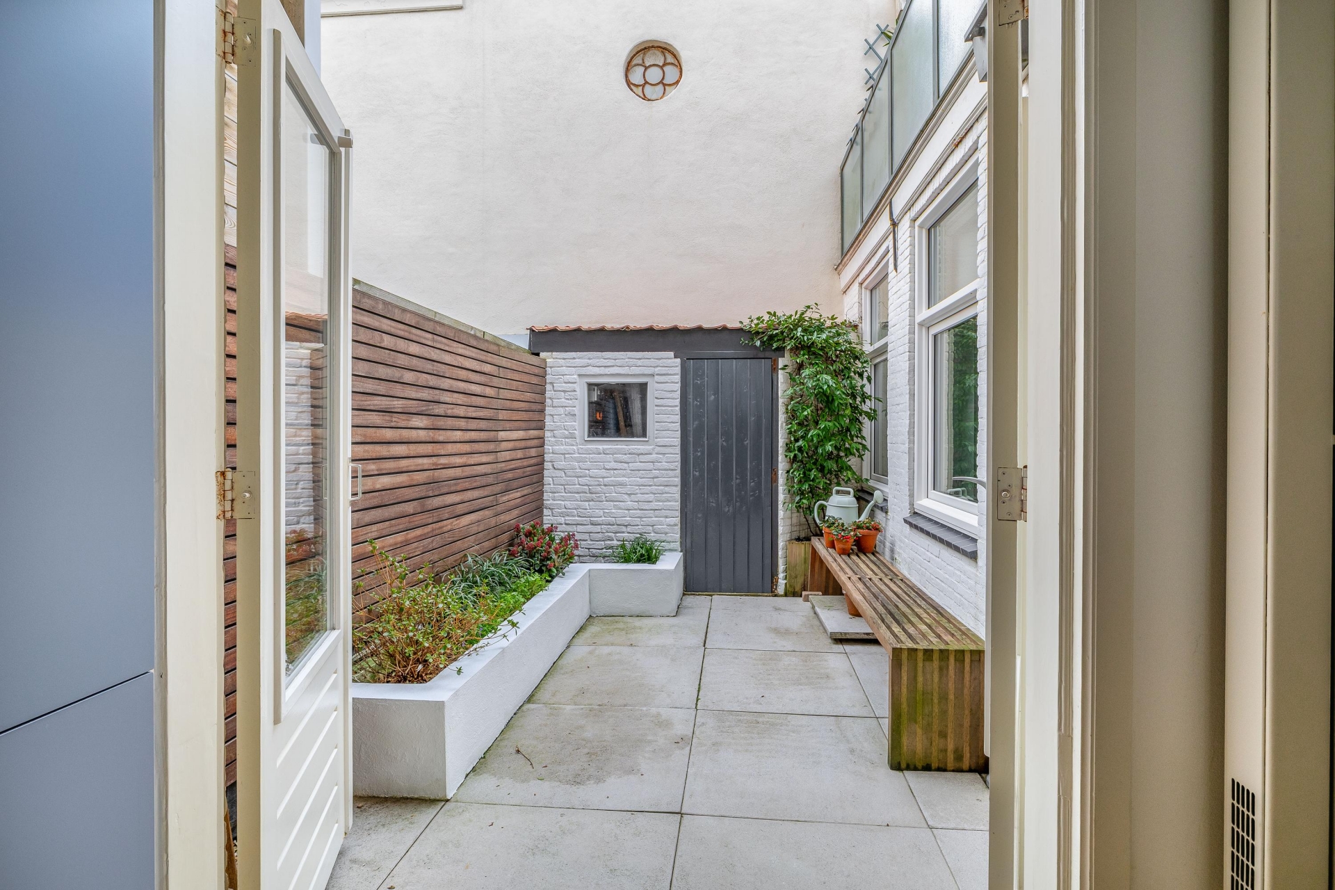 Achterplaats gelegen op het Westen, met middagzon en schuur met aansluiting wasmachine en droger.