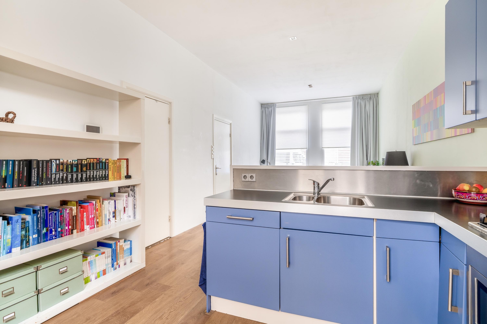 entree via de hal, voorzien van laminaat; ruime woon/eetkamer met open keuken, voorzien van L-vormig blok met combi-oven, kookplaat, afzuigkap, vaatwasser en koel-/vriescombinatie. De woon/eetkamer heeft een plafondhoogte van 3.20m, waardoor een ruimtelijk effect ontstaat.