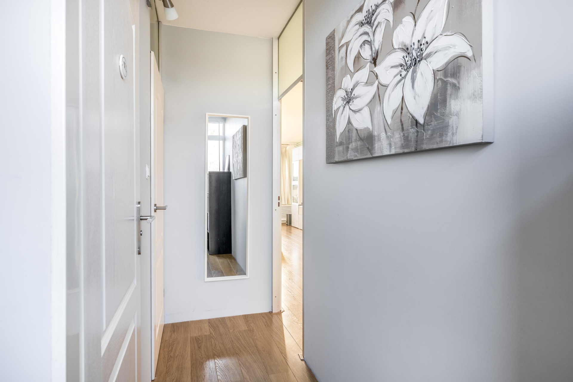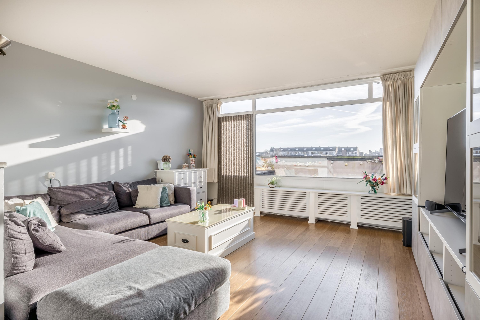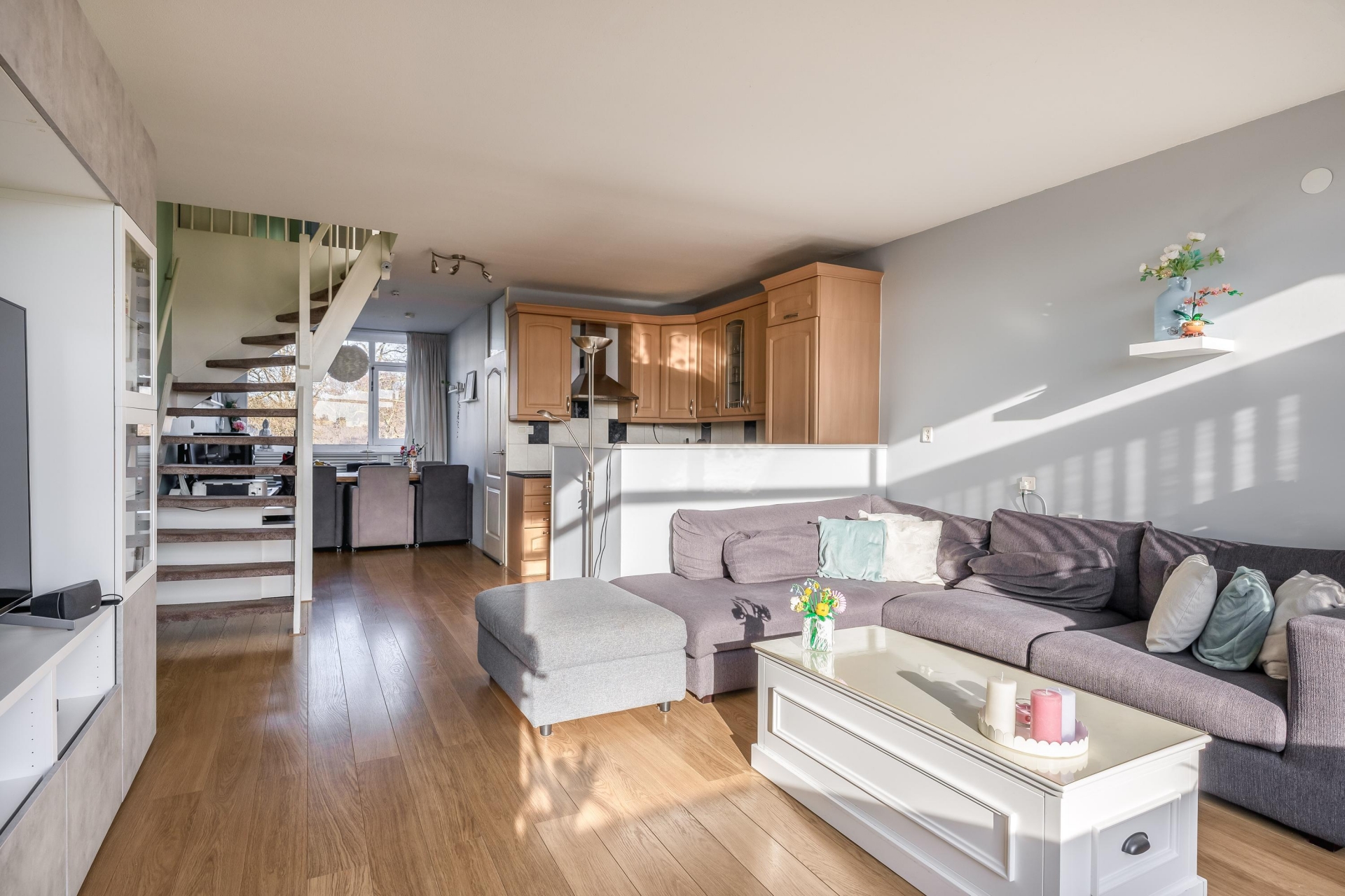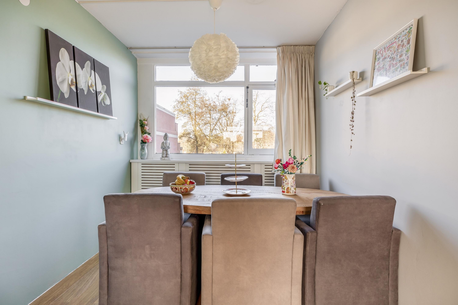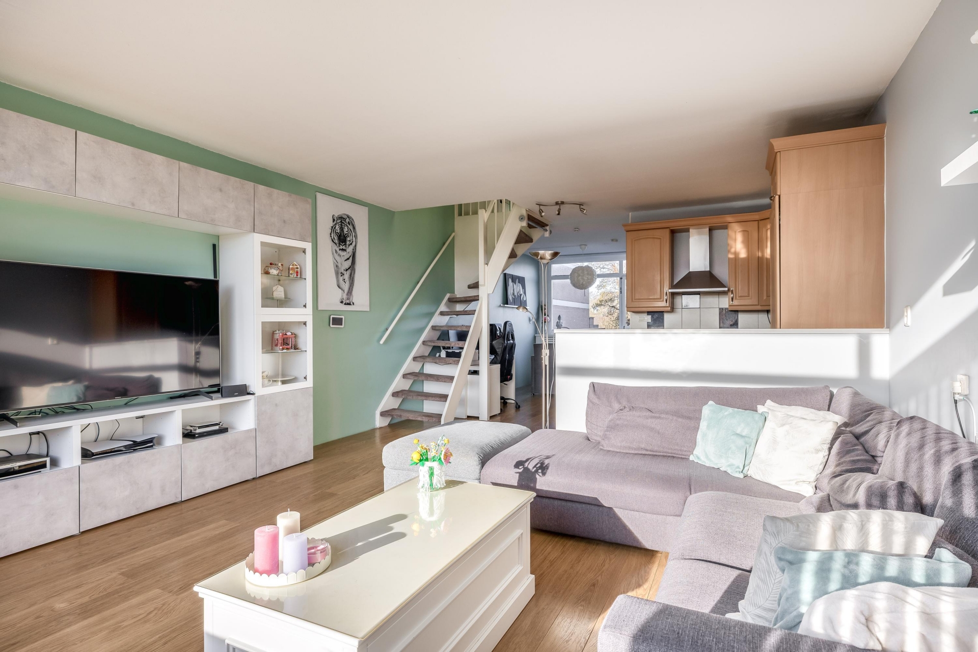De woonkamer is een prettige en lichte leefruimte. Dankzij de grote raampartij aan de balkonzijde komt er veel daglicht naar binnen, wat zorgt voor een open en ruimtelijk gevoel. Er is voldoende plek voor een comfortabele zithoek en een eettafel waar je gezellig kunt eten met vrienden of familie.
