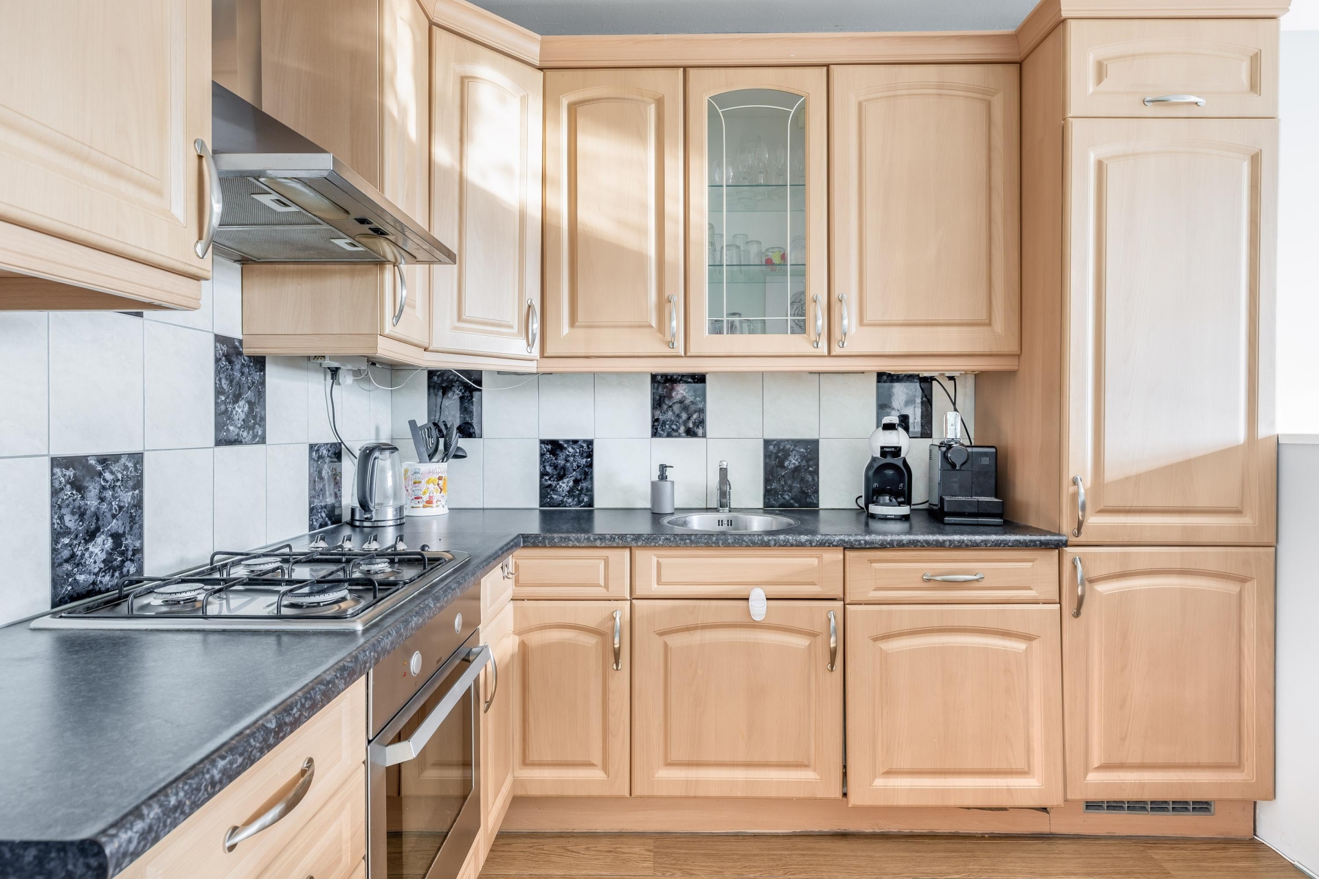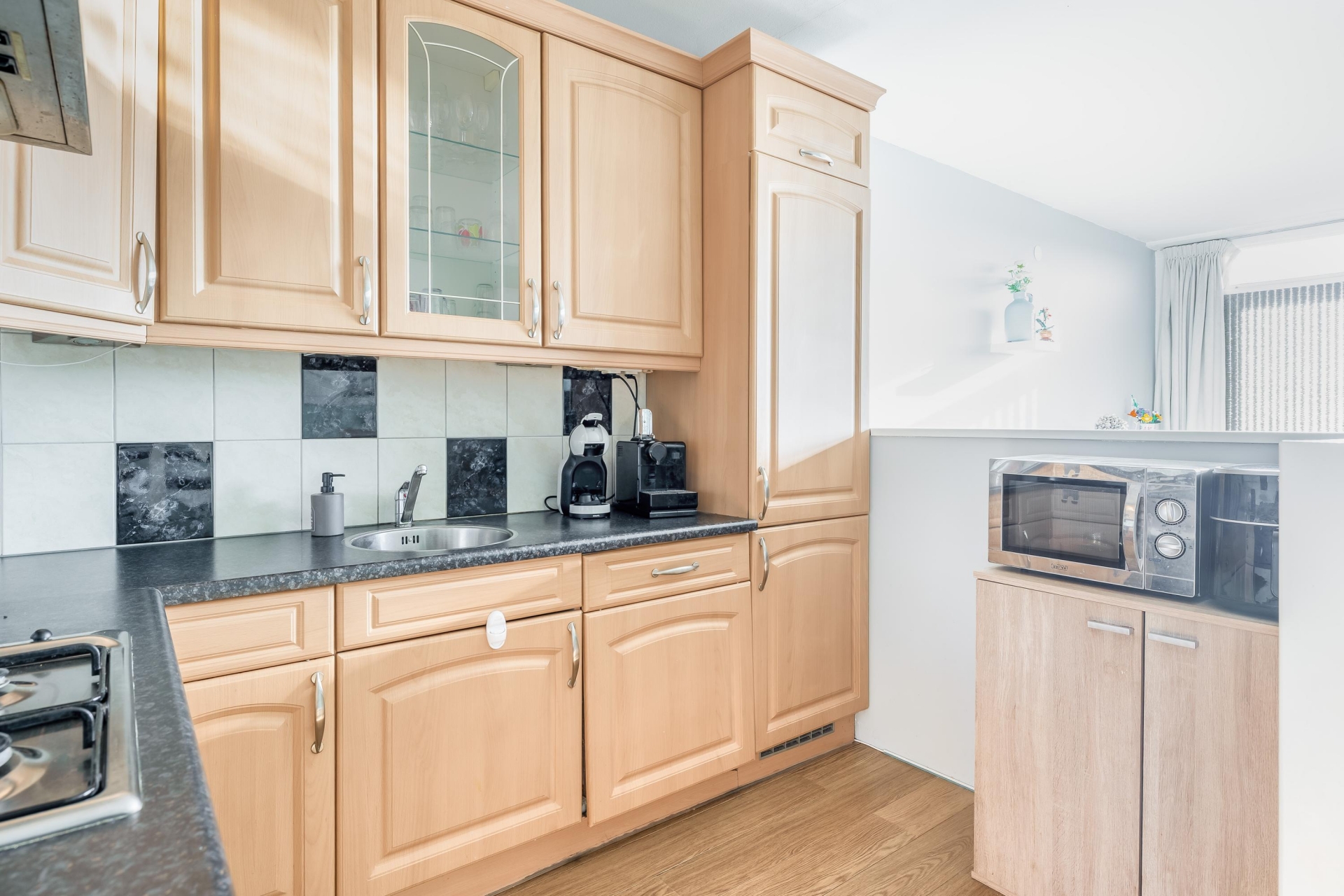 De keuken is praktisch ingericht en voorzien van diverse inbouwapparatuur. Er is voldoende werkruimte en kastruimte aanwezig, waardoor koken hier prettig en overzichtelijk blijft. De indeling maakt het een functionele plek waar je gemakkelijk een maaltijd bereidt.