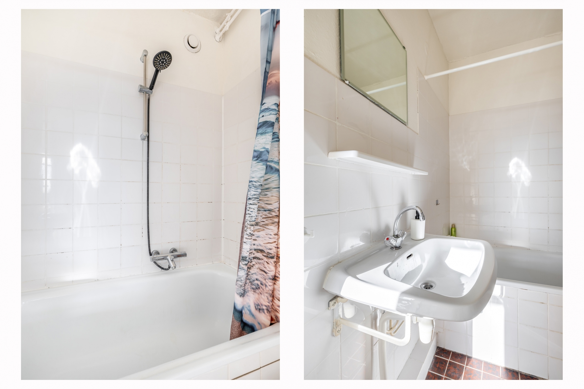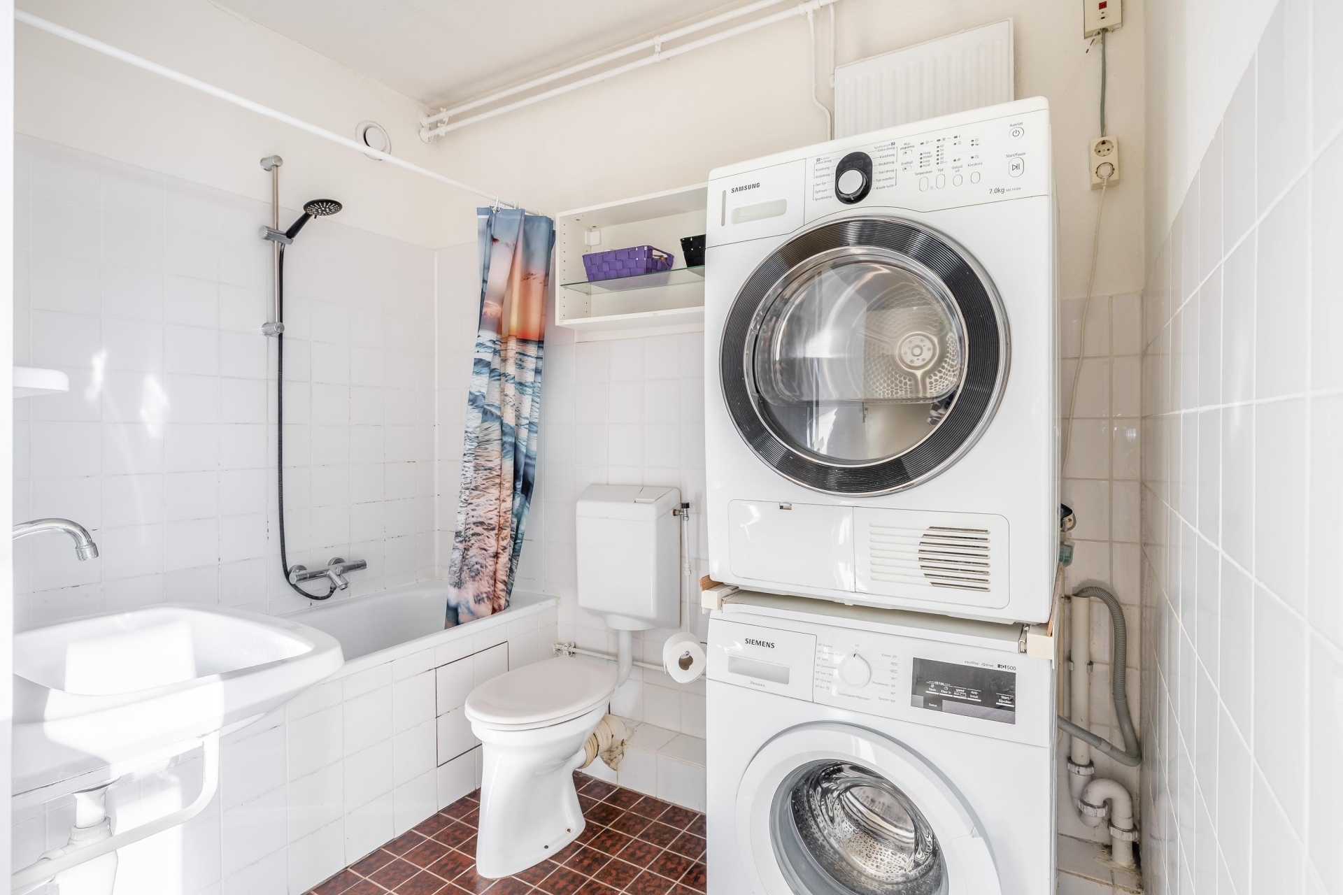 De badkamer is praktisch ingericht met een ligbad met douche, een wastafel en ruimte voor de wasmachine en droger. Dat maakt deze ruimte functioneel voor dagelijks gebruik.
