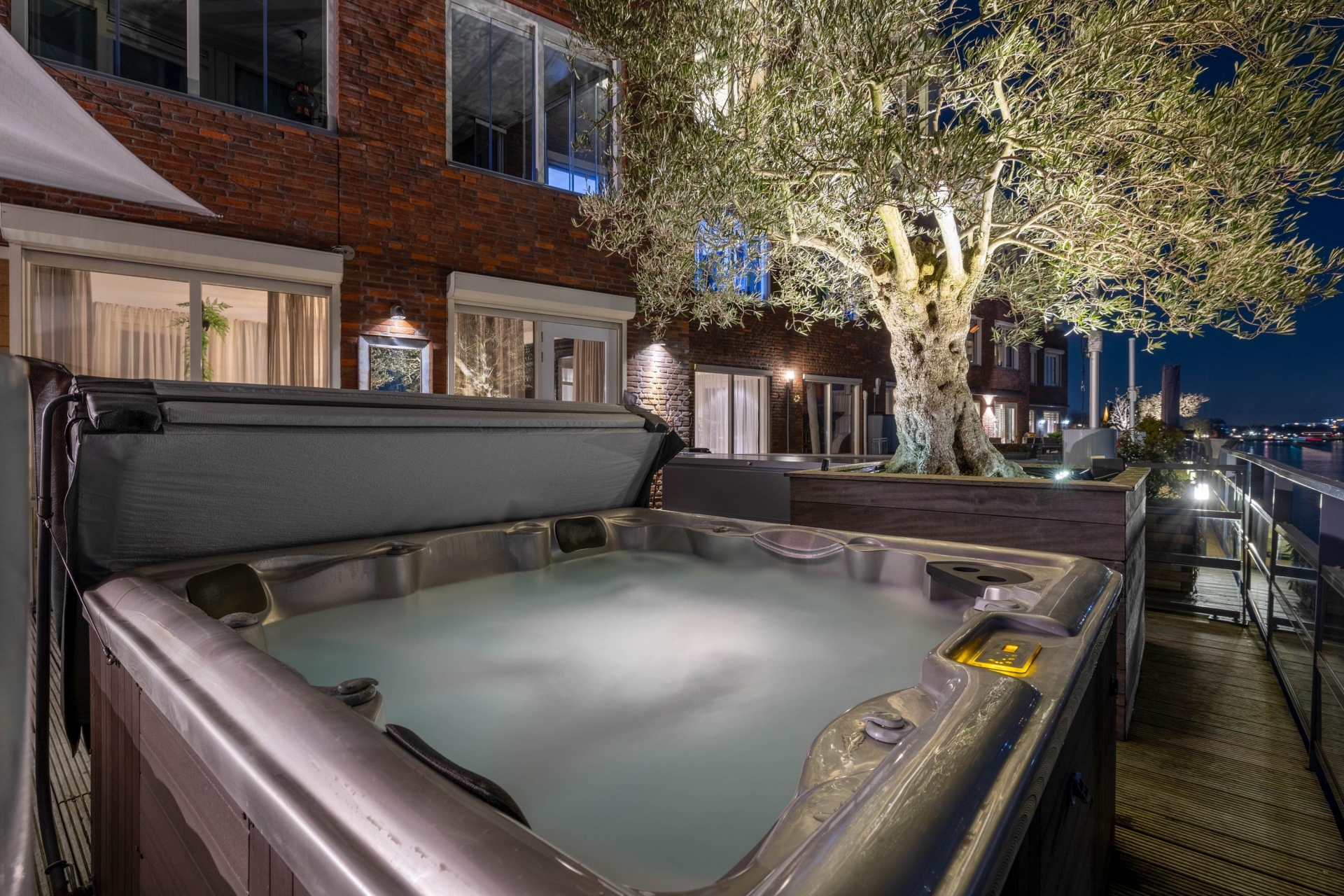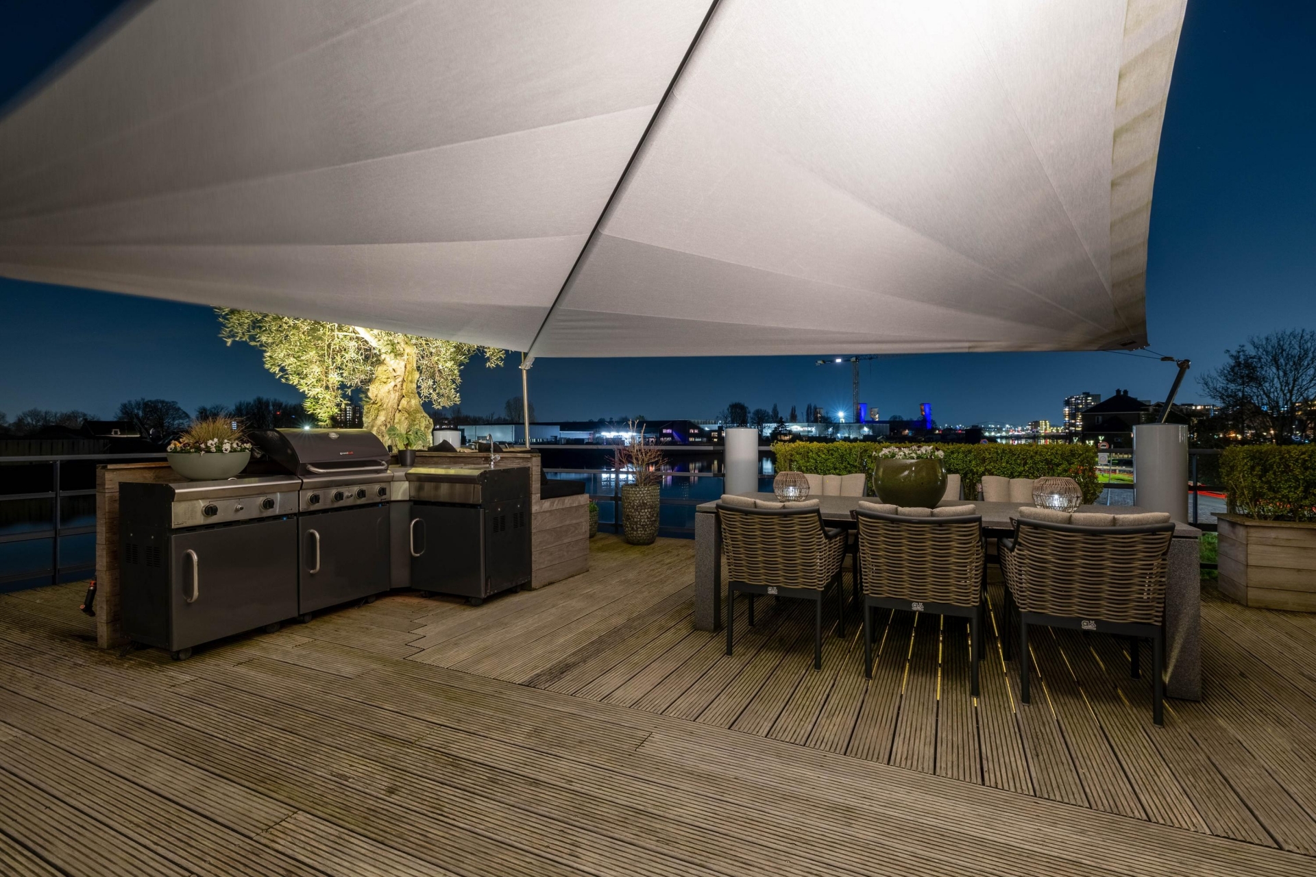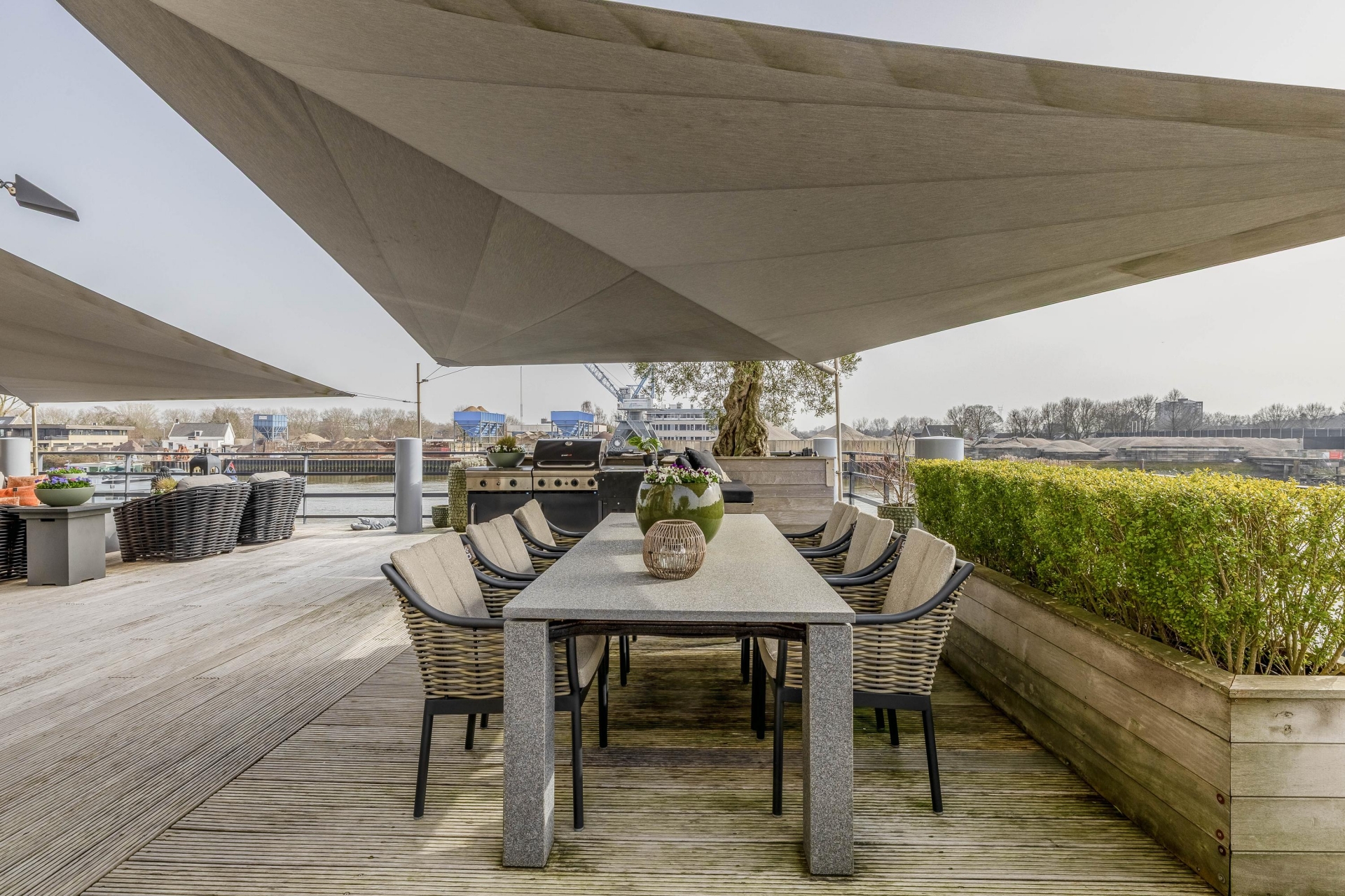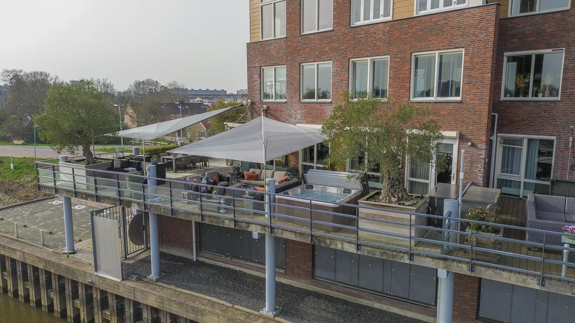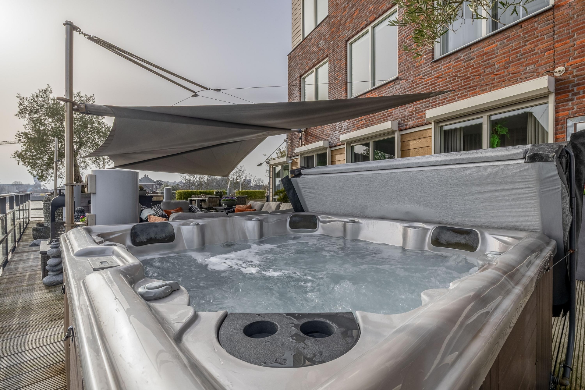 Maar de echte eyecatcher is toch wel het gigantische zonneterras (gelegen op het zuidoosten) met vrij uitzicht op de Hollandsche IJssel. Hier waan je je in mediterrane sferen. Allereerst zijn alle raampartijen, grenzend aan het terras voorzien van volautomatische zonwering. Het gehele terras is voorzien van een prachtig houten vlonderdek. Twee maatwerk zonnedoeken overlappen een groot deel van het terras, waaronder plaats is voor een riante loungehoek, een grote eettafel voor 6 personen en een zeer complete, luxe buitenkeuken. En alsof het nog niet gekker kan, staat er ook nog een heerlijke jacuzzi. Om het terras helemaal af te maken zijn er 3 gigantische houten plantenbakken geplaatst met daarin 3 prachtige olijfbomen van imposant formaat in de plantenbakken zit ook een bewatering systeem . Hoeveel luxer kan je het hebben ?!
