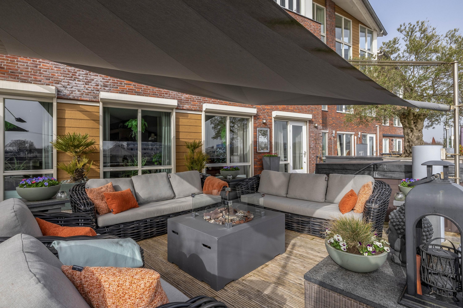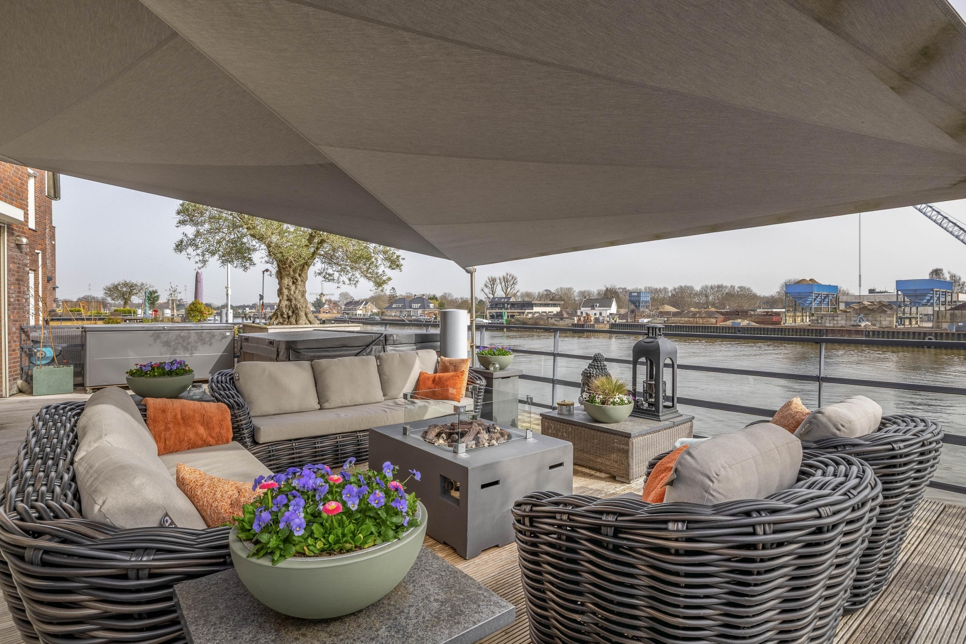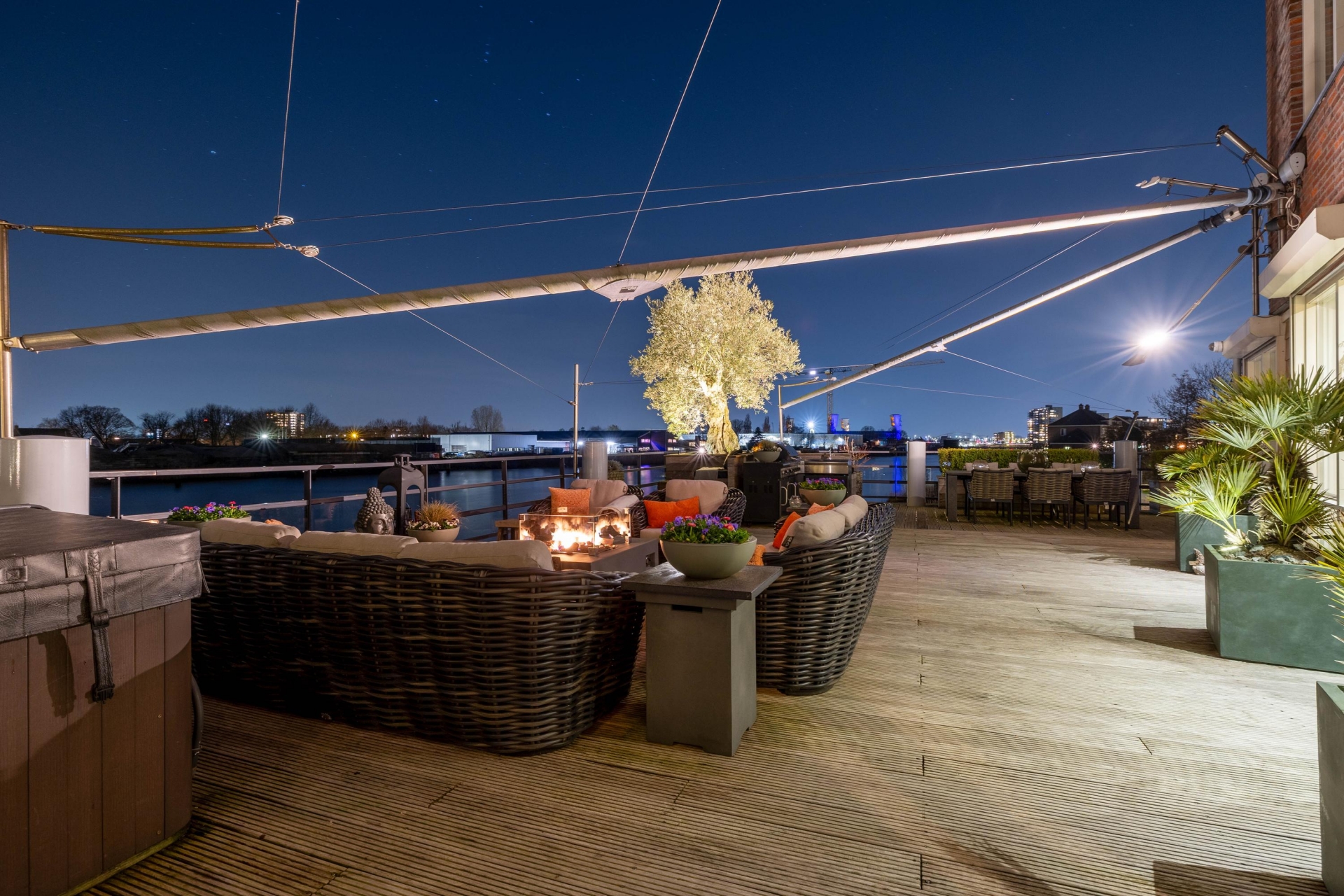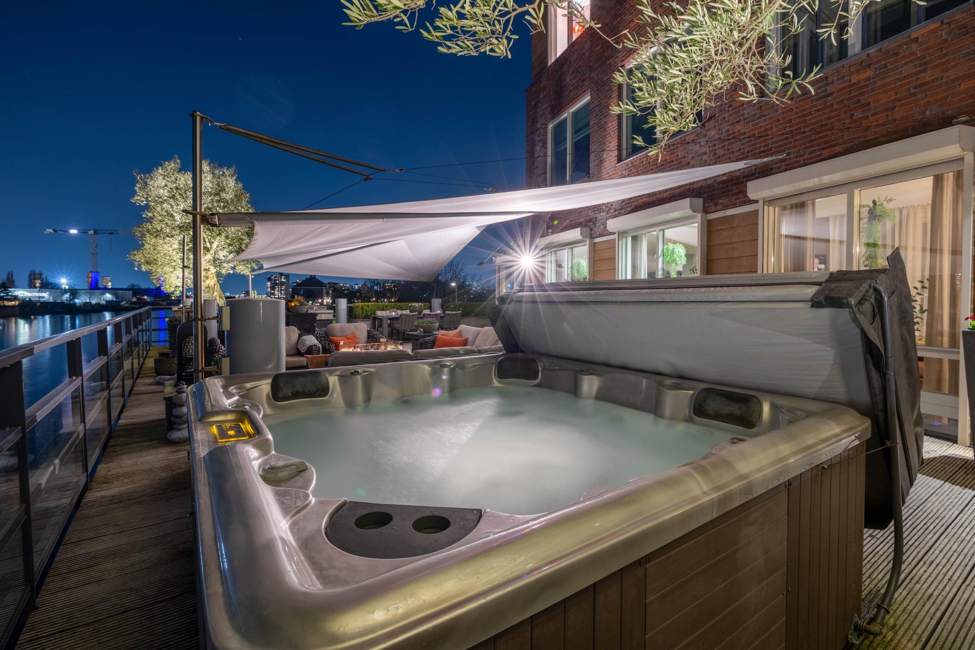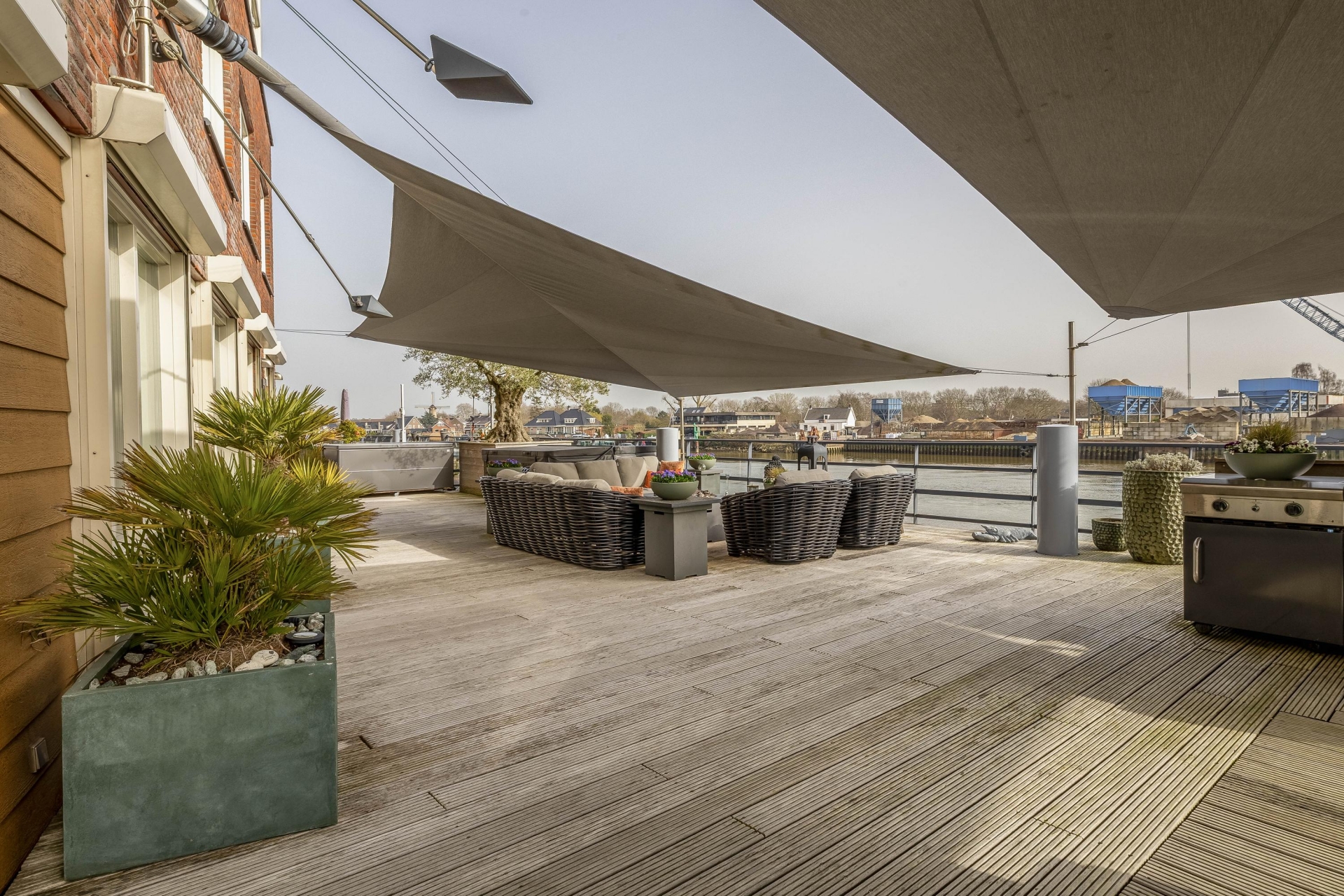Maar de echte eyecatcher is toch wel het gigantische zonneterras (gelegen op het zuidoosten) met vrij uitzicht op de Hollandsche IJssel. Hier waan je je in mediterrane sferen. Allereerst zijn alle raampartijen, grenzend aan het terras voorzien van volautomatische zonwering. Het gehele terras is voorzien van een prachtig houten vlonderdek. Twee maatwerk zonnedoeken overlappen een groot deel van het terras, waaronder plaats is voor een riante loungehoek, een grote eettafel voor 6 personen en een zeer complete, luxe buitenkeuken. En alsof het nog niet gekker kan, staat er ook nog een heerlijke jacuzzi. Om het terras helemaal af te maken zijn er 3 gigantische houten plantenbakken geplaatst met daarin 3 prachtige olijfbomen van imposant formaat in de plantenbakken zit ook een bewatering systeem . Hoeveel luxer kan je het hebben ?!