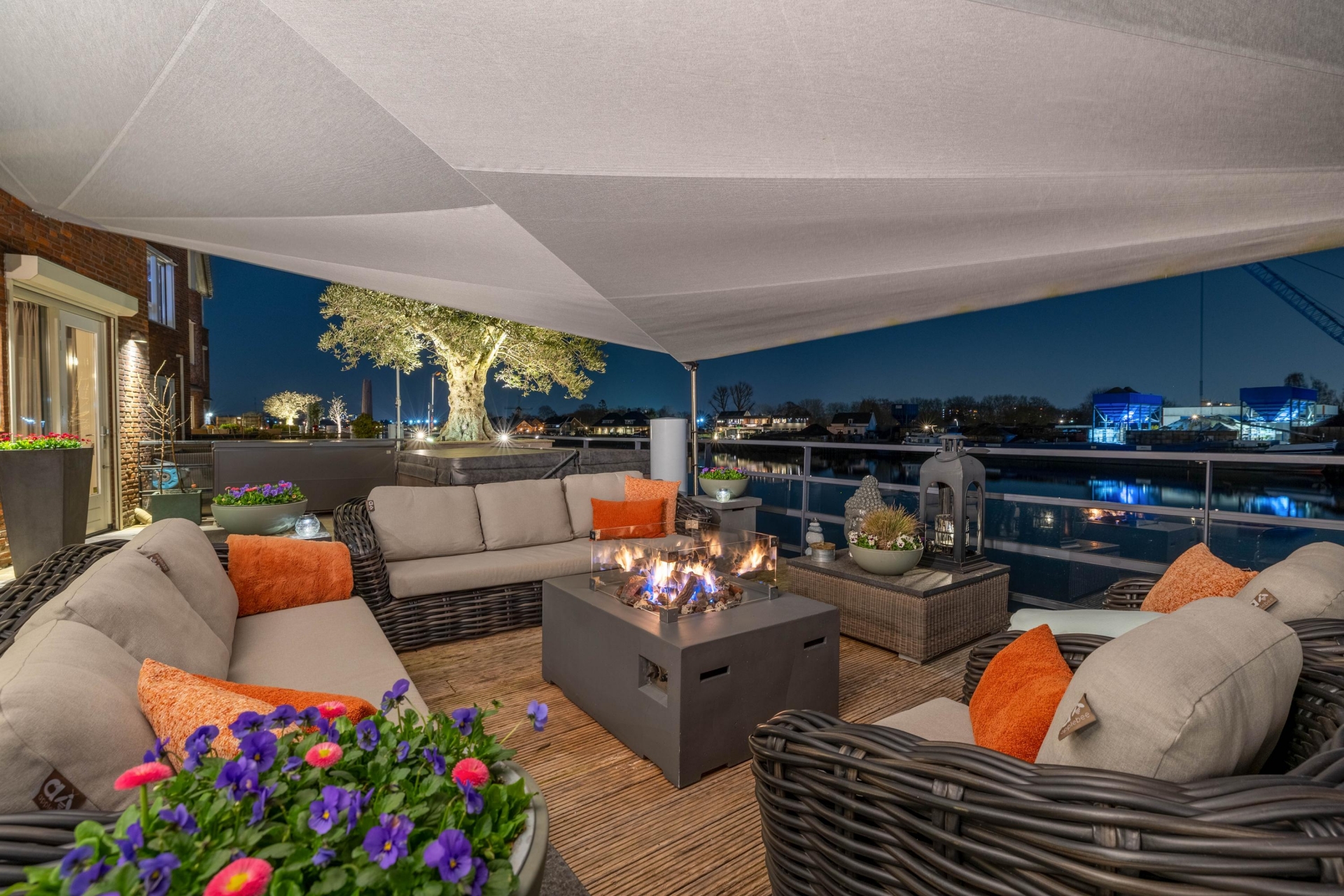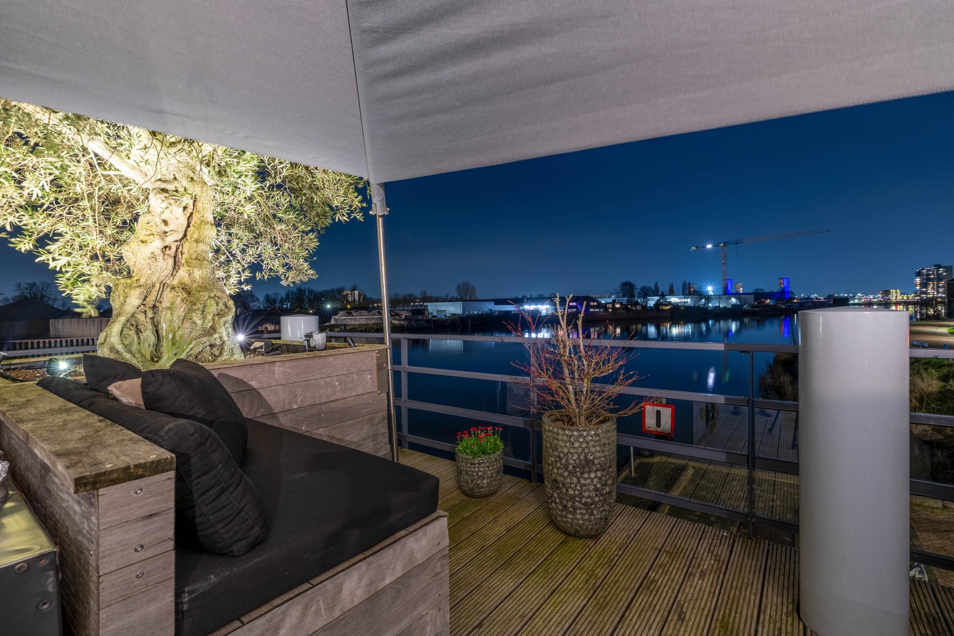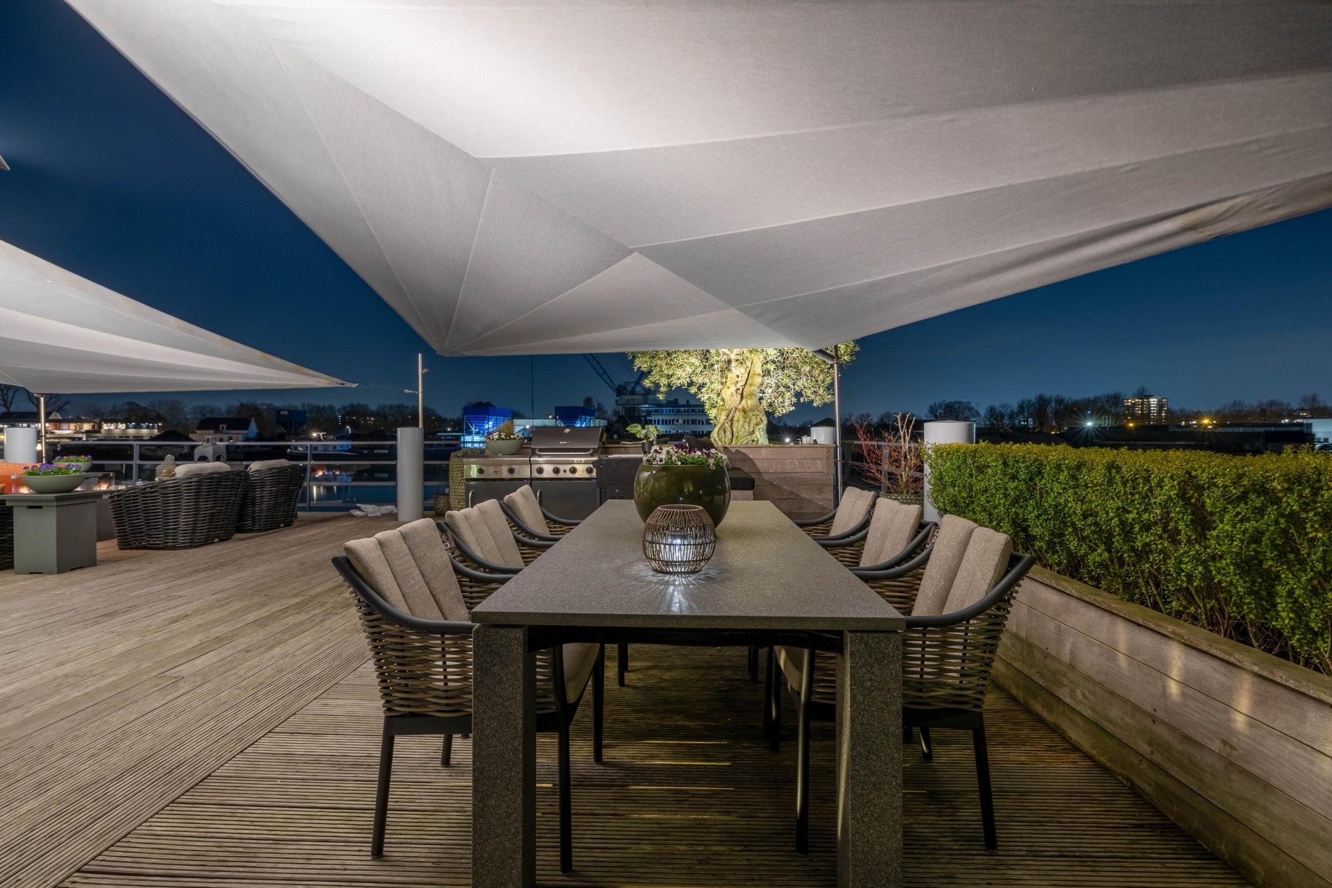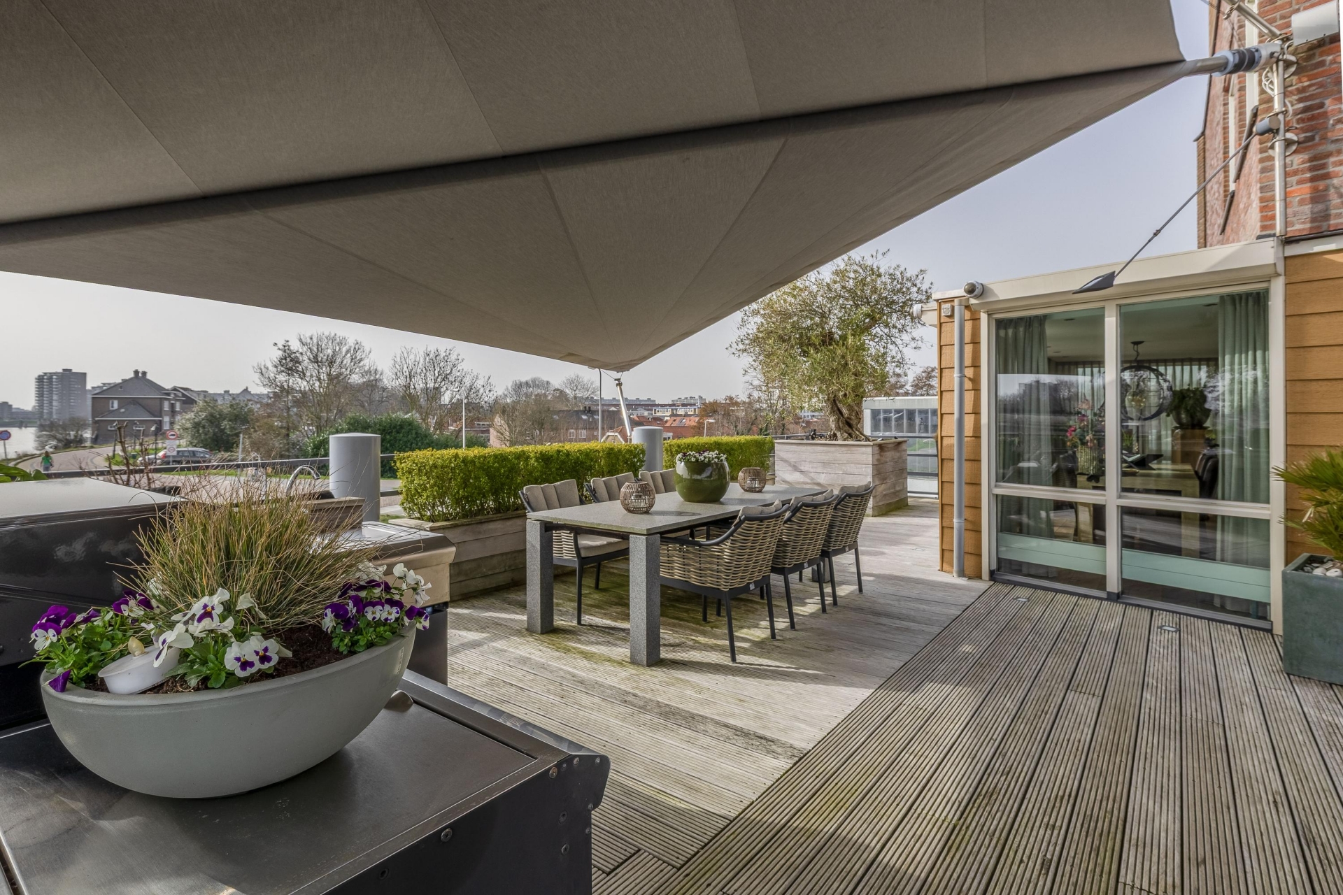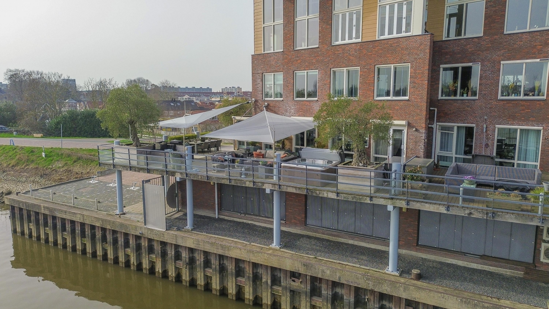 Maar de echte eyecatcher is toch wel het gigantische zonneterras (gelegen op het zuidoosten) met vrij uitzicht op de Hollandsche IJssel. Hier waan je je in mediterrane sferen. Allereerst zijn alle raampartijen, grenzend aan het terras voorzien van volautomatische zonwering. Het gehele terras is voorzien van een prachtig houten vlonderdek. Twee maatwerk zonnedoeken overlappen een groot deel van het terras, waaronder plaats is voor een riante loungehoek, een grote eettafel voor 6 personen en een zeer complete, luxe buitenkeuken. En alsof het nog niet gekker kan, staat er ook nog een heerlijke jacuzzi. Om het terras helemaal af te maken zijn er 3 gigantische houten plantenbakken geplaatst met daarin 3 prachtige olijfbomen van imposant formaat in de plantenbakken zit ook een bewatering systeem . Hoeveel luxer kan je het hebben ?!