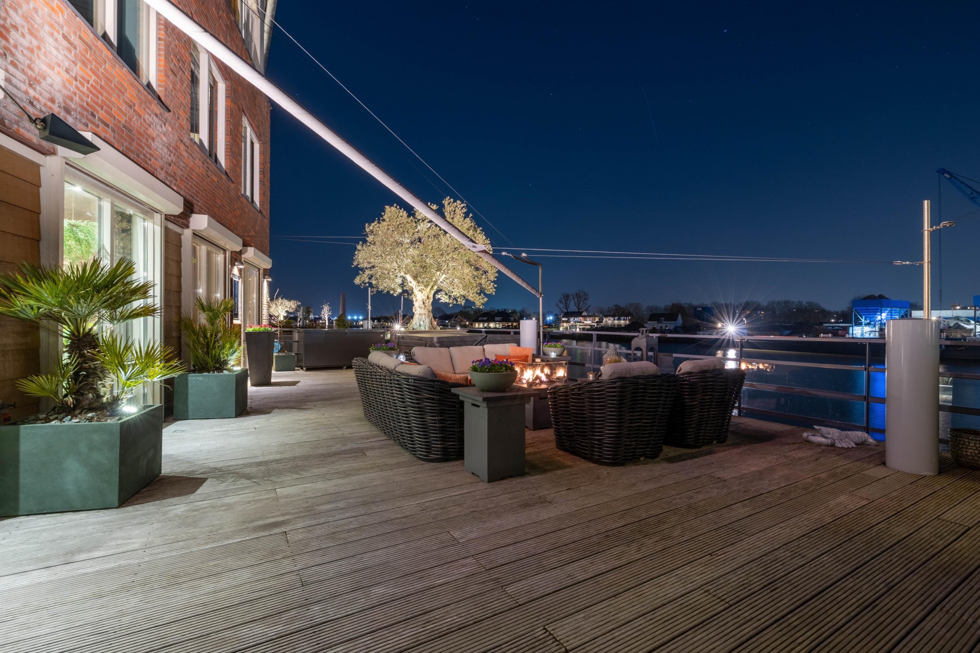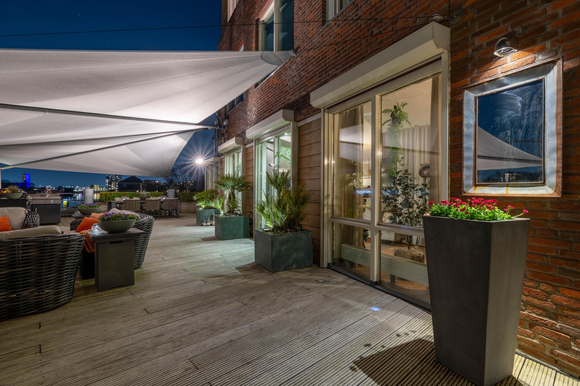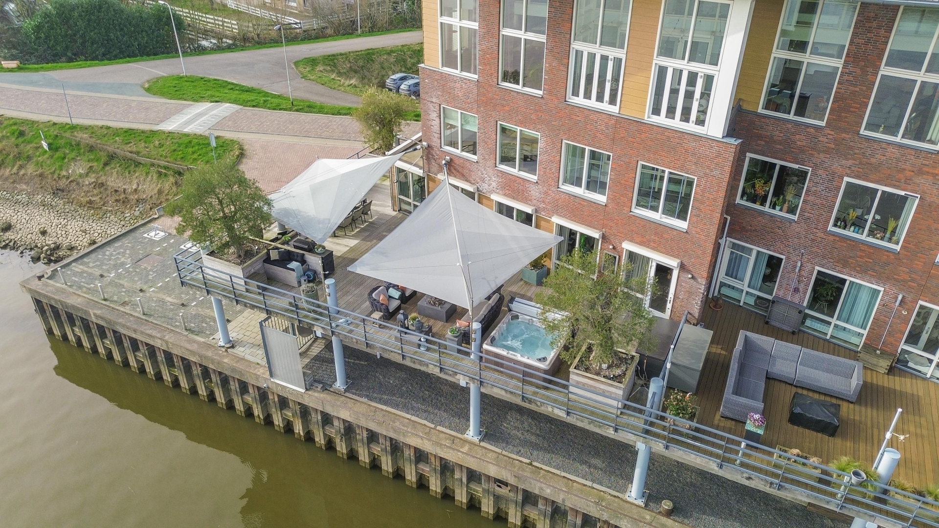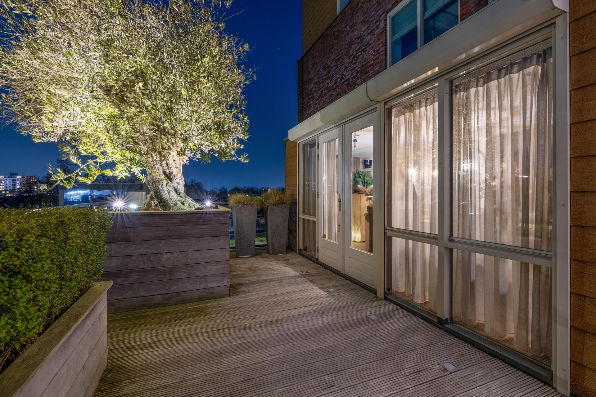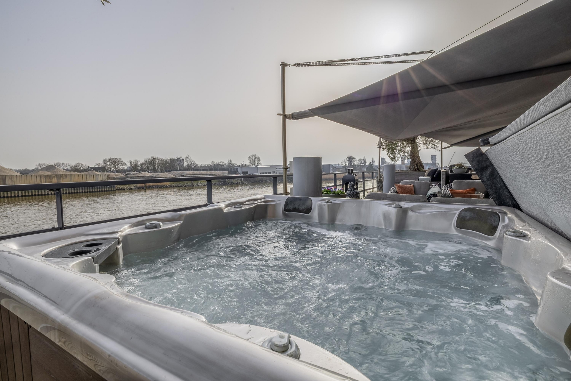 Maar de echte eyecatcher is toch wel het gigantische zonneterras (gelegen op het zuidoosten) met vrij uitzicht op de Hollandsche IJssel. Hier waan je je in mediterrane sferen. Allereerst zijn alle raampartijen, grenzend aan het terras voorzien van volautomatische zonwering. Het gehele terras is voorzien van een prachtig houten vlonderdek. Twee maatwerk zonnedoeken overlappen een groot deel van het terras, waaronder plaats is voor een riante loungehoek, een grote eettafel voor 6 personen en een zeer complete, luxe buitenkeuken. En alsof het nog niet gekker kan, staat er ook nog een heerlijke jacuzzi. Om het terras helemaal af te maken zijn er 3 gigantische houten plantenbakken geplaatst met daarin 3 prachtige olijfbomen van imposant formaat in de plantenbakken zit ook een bewatering systeem . Hoeveel luxer kan je het hebben ?!