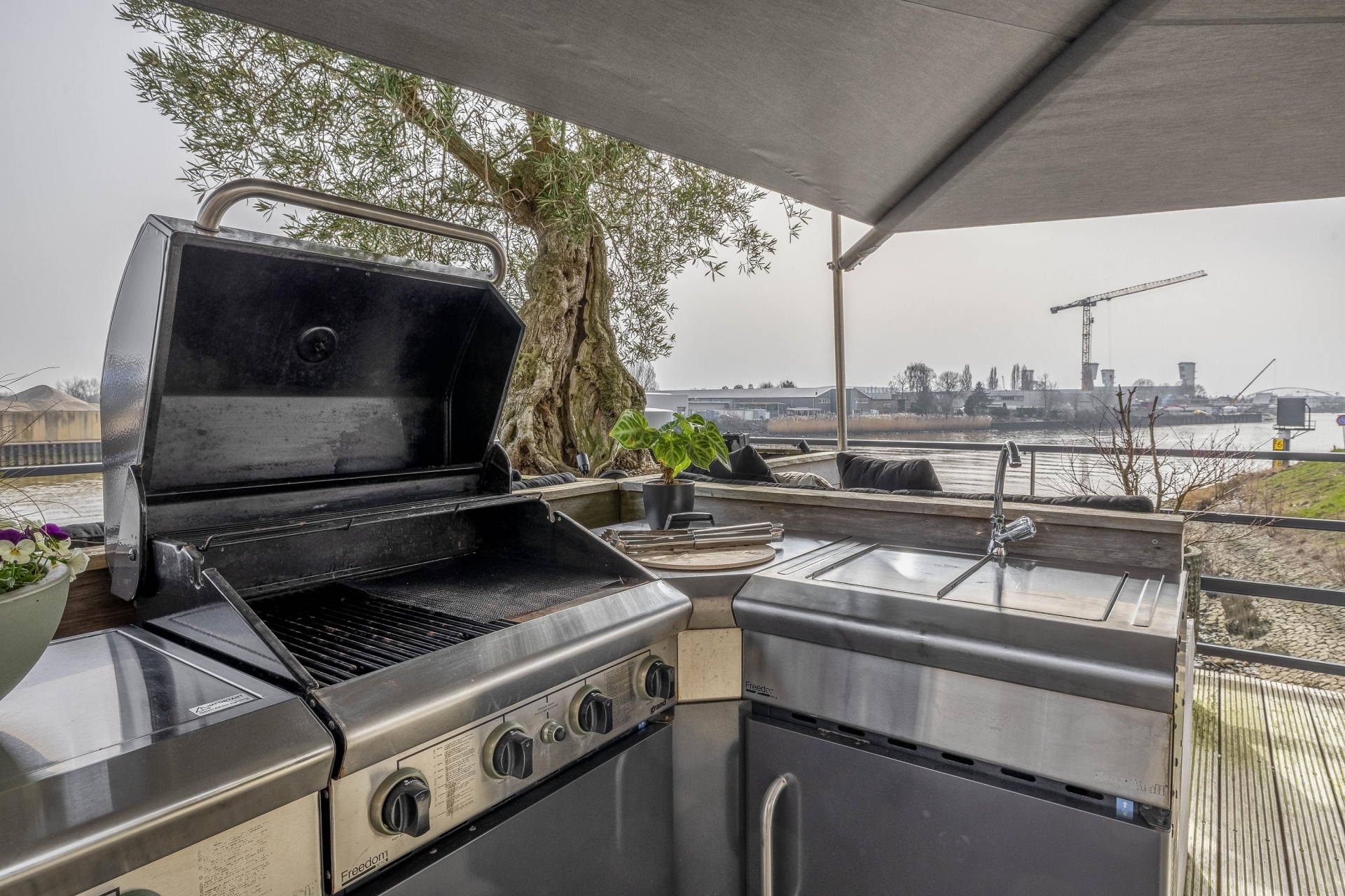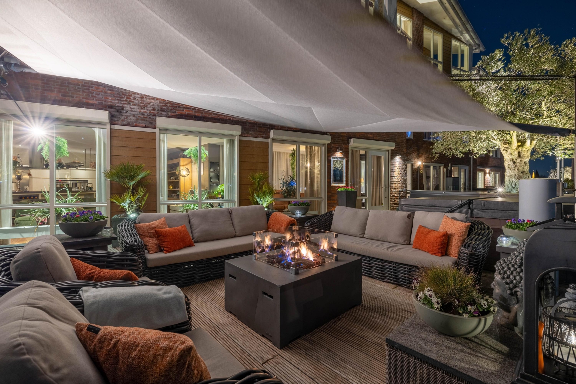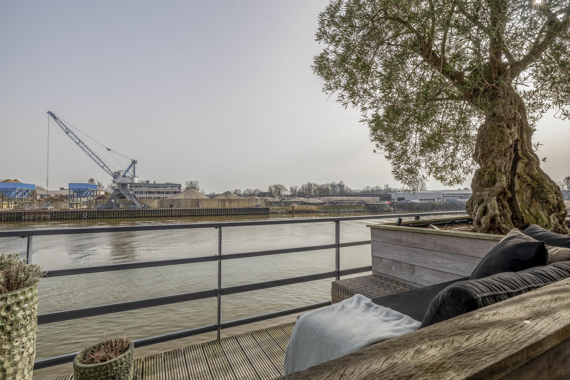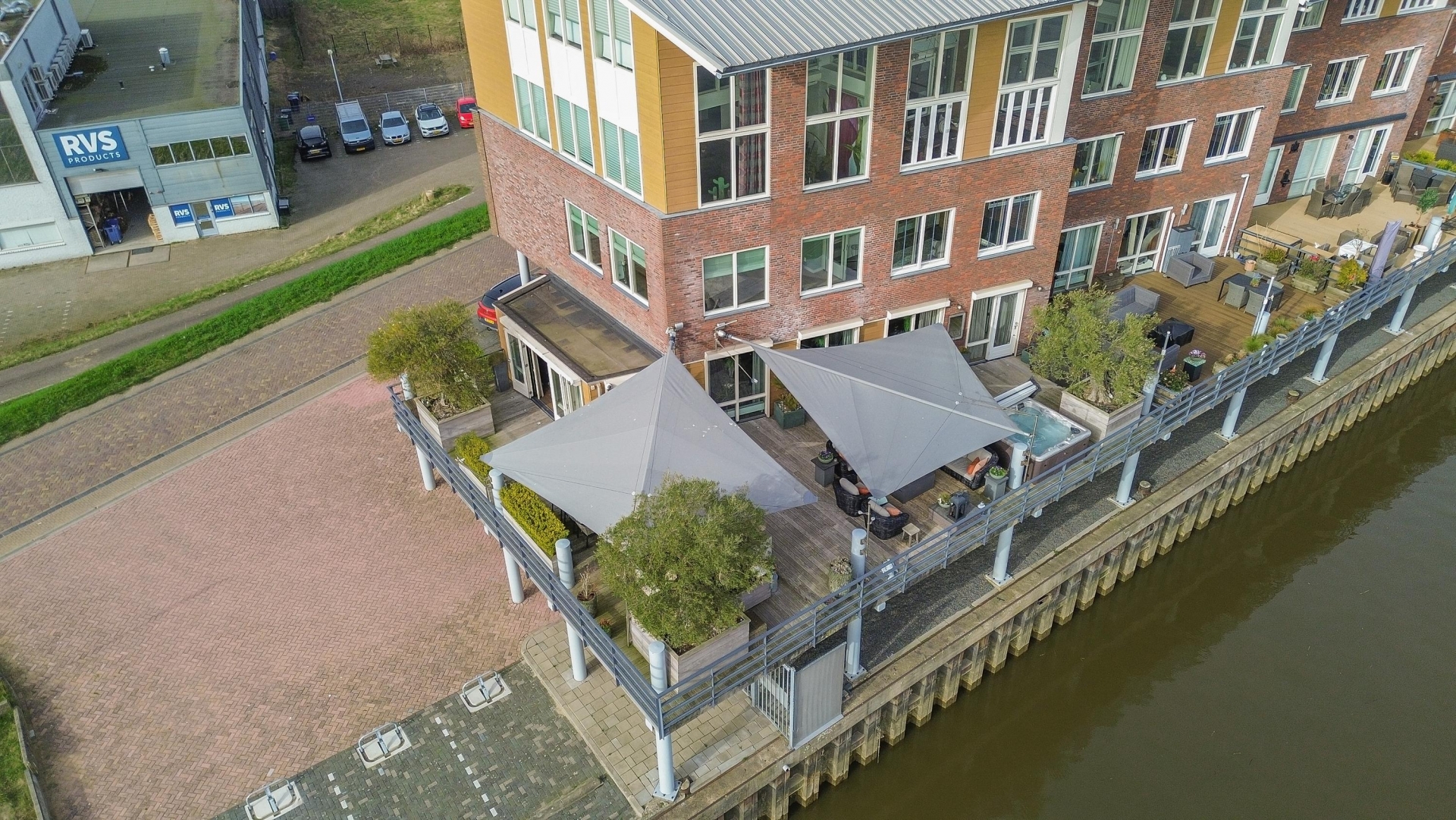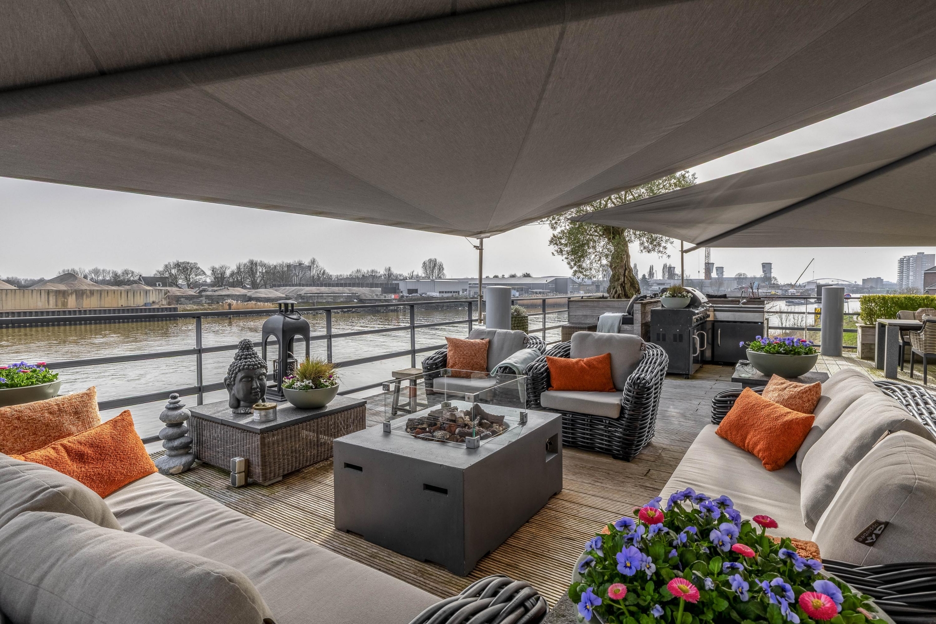 Maar de echte eyecatcher is toch wel het gigantische zonneterras (gelegen op het zuidoosten) met vrij uitzicht op de Hollandsche IJssel. Hier waan je je in mediterrane sferen. Allereerst zijn alle raampartijen, grenzend aan het terras voorzien van volautomatische zonwering. Het gehele terras is voorzien van een prachtig houten vlonderdek. Twee maatwerk zonnedoeken overlappen een groot deel van het terras, waaronder plaats is voor een riante loungehoek, een grote eettafel voor 6 personen en een zeer complete, luxe buitenkeuken. En alsof het nog niet gekker kan, staat er ook nog een heerlijke jacuzzi. Om het terras helemaal af te maken zijn er 3 gigantische houten plantenbakken geplaatst met daarin 3 prachtige olijfbomen van imposant formaat in de plantenbakken zit ook een bewatering systeem . Hoeveel luxer kan je het hebben ?!