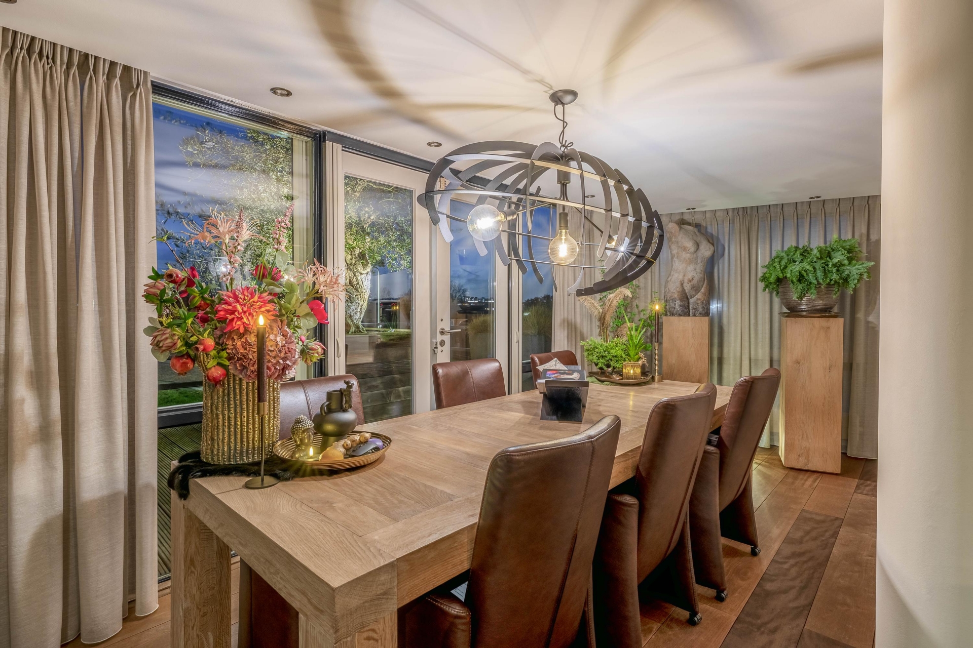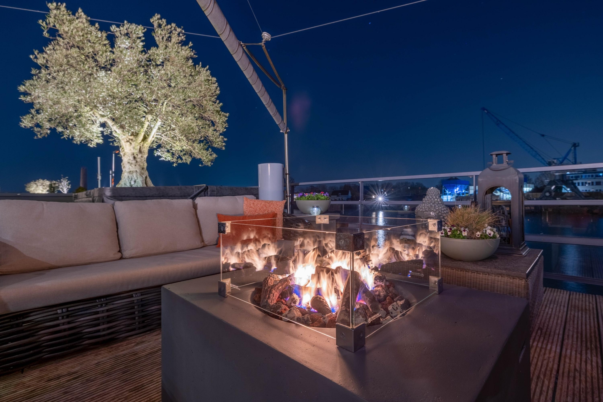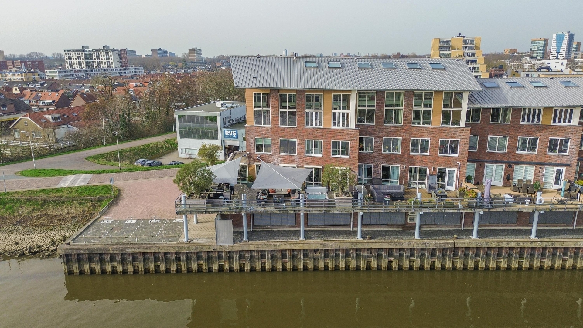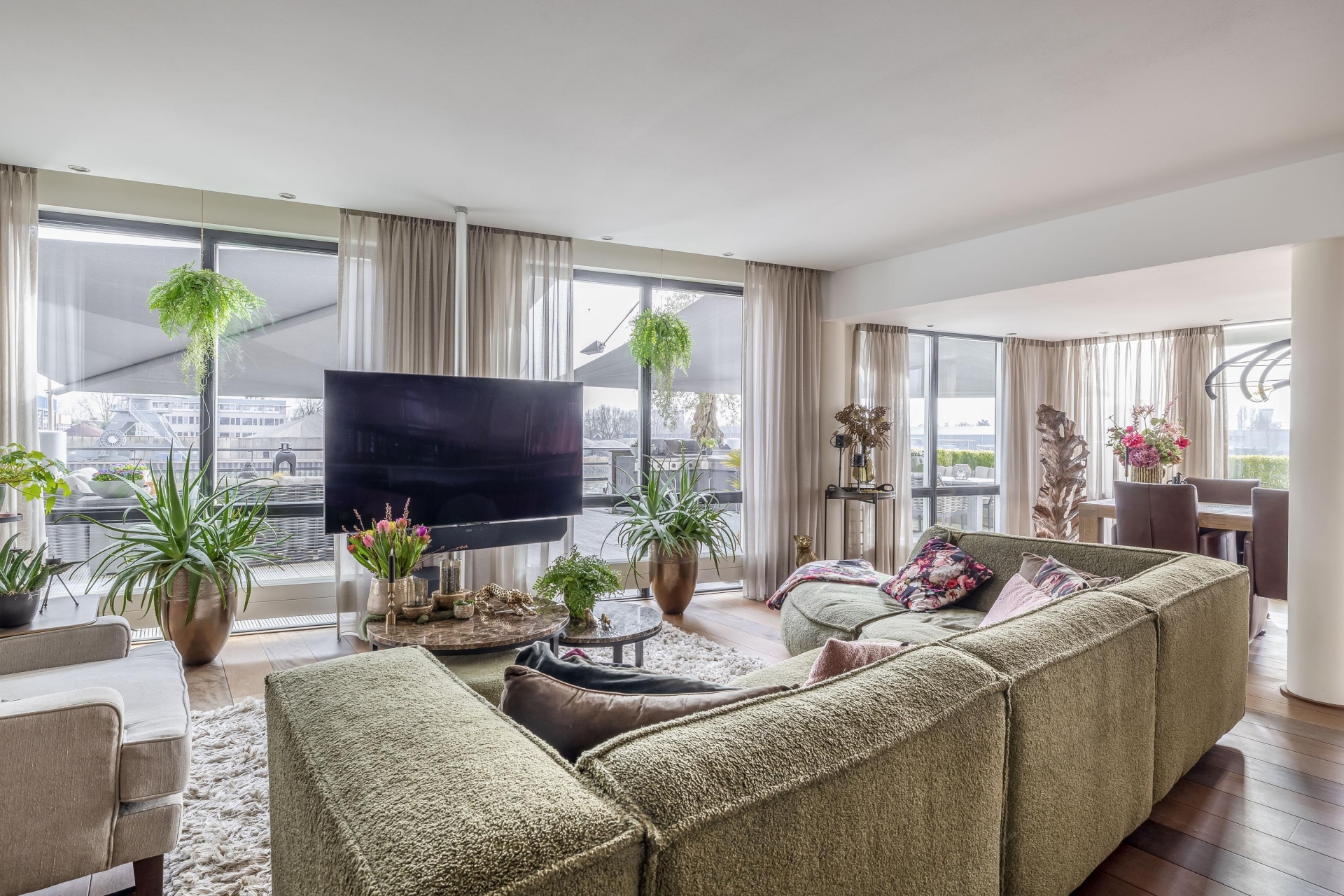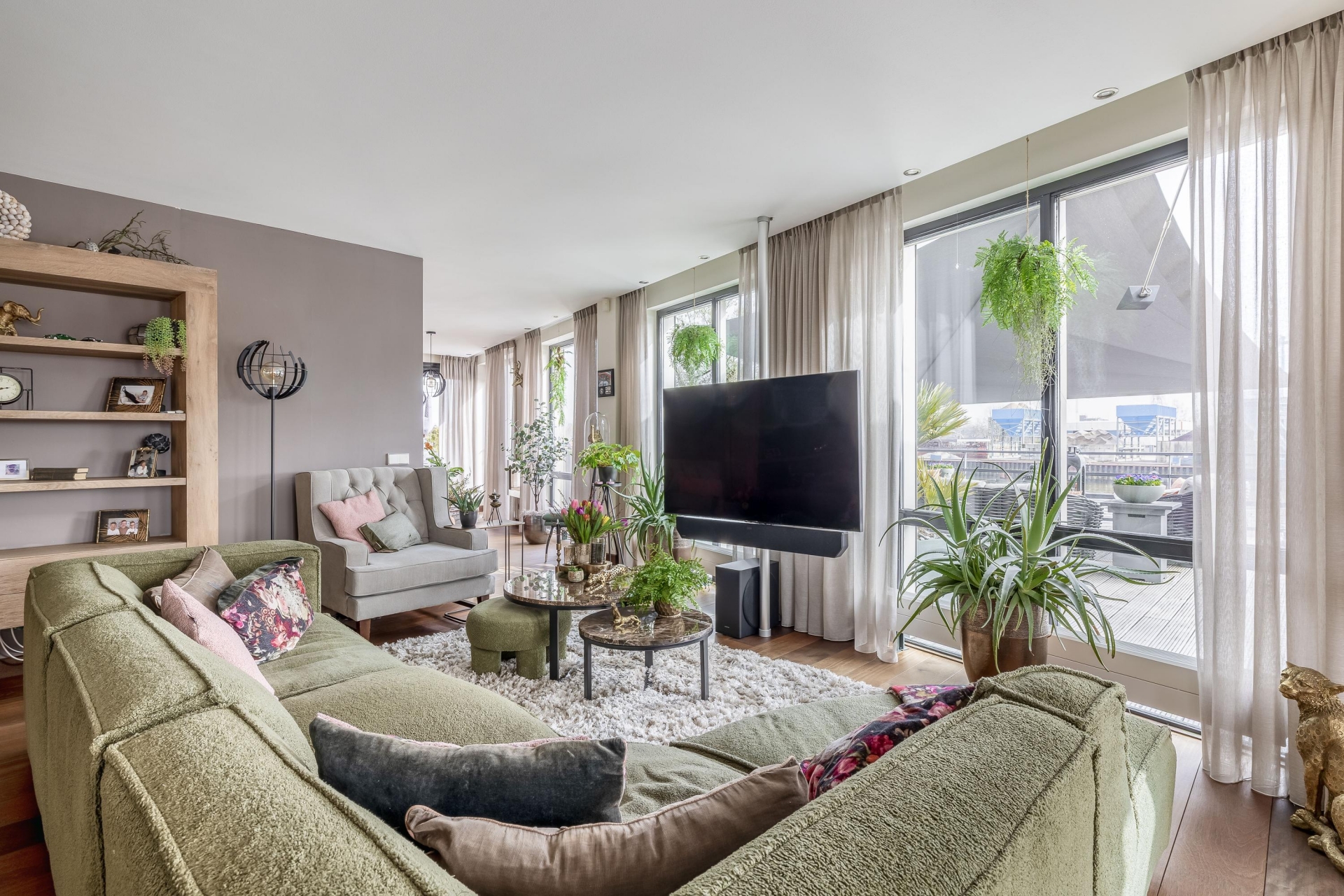Maar de echte eyecatcher is toch wel het gigantische zonneterras (gelegen op het zuidoosten) met vrij uitzicht op de Hollandsche IJssel. Hier waan je je in mediterrane sferen. Allereerst zijn alle raampartijen, grenzend aan het terras voorzien van volautomatische zonwering. Het gehele terras is voorzien van een prachtig houten vlonderdek. Twee maatwerk zonnedoeken overlappen een groot deel van het terras, waaronder plaats is voor een riante loungehoek, een grote eettafel voor 6 personen en een zeer complete, luxe buitenkeuken. En alsof het nog niet gekker kan, staat er ook nog een heerlijke jacuzzi. Om het terras helemaal af te maken zijn er 3 gigantische houten plantenbakken geplaatst met daarin 3 prachtige olijfbomen van imposant formaat in de plantenbakken zit ook een bewatering systeem . Hoeveel luxer kan je het hebben ?!