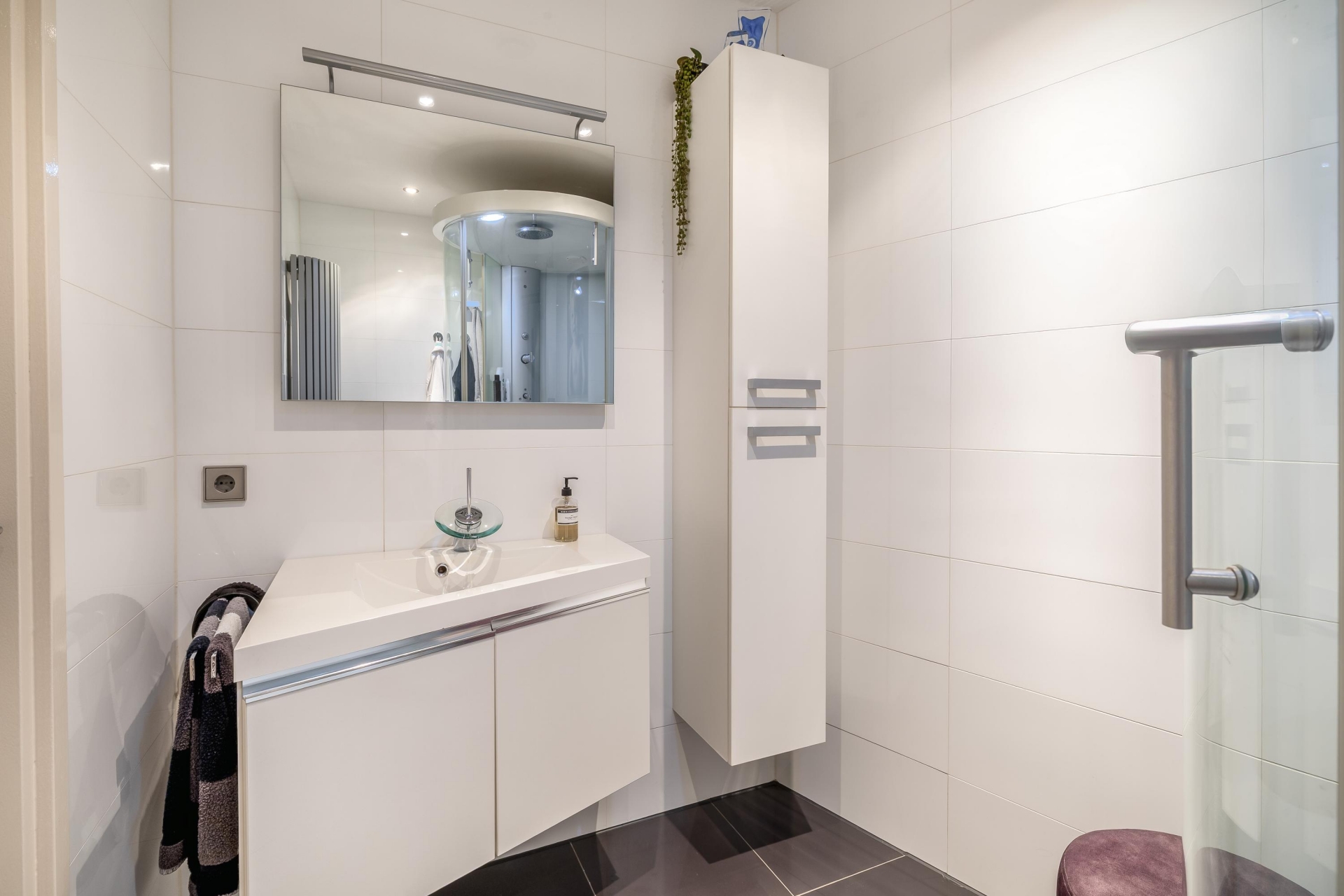 -Geheel betegelde badkamer met wastafelmeubel, stoomdouche, vloerverwarming en designradiator.