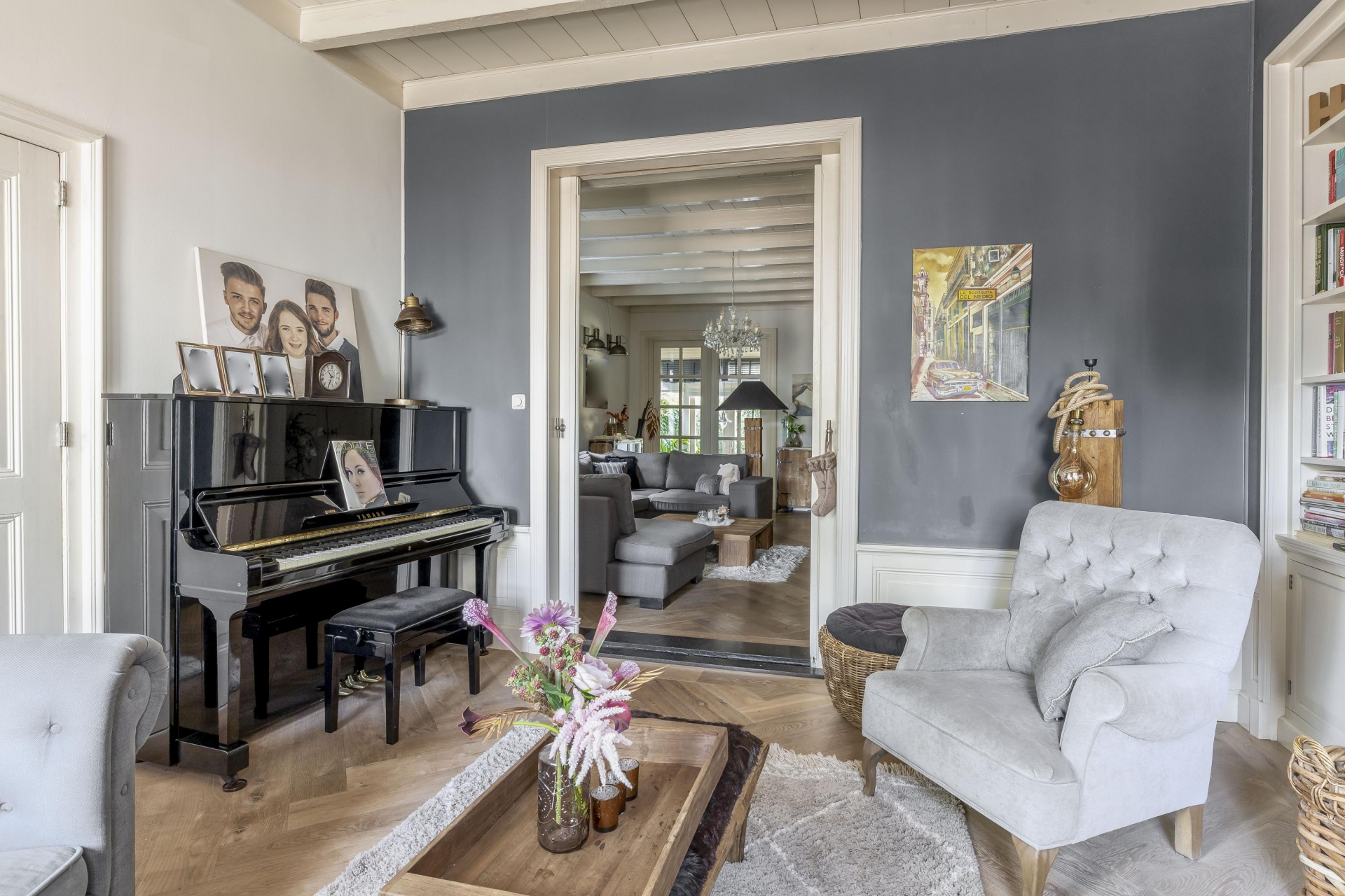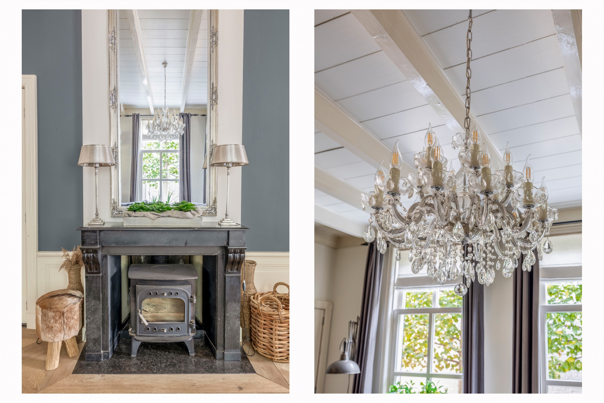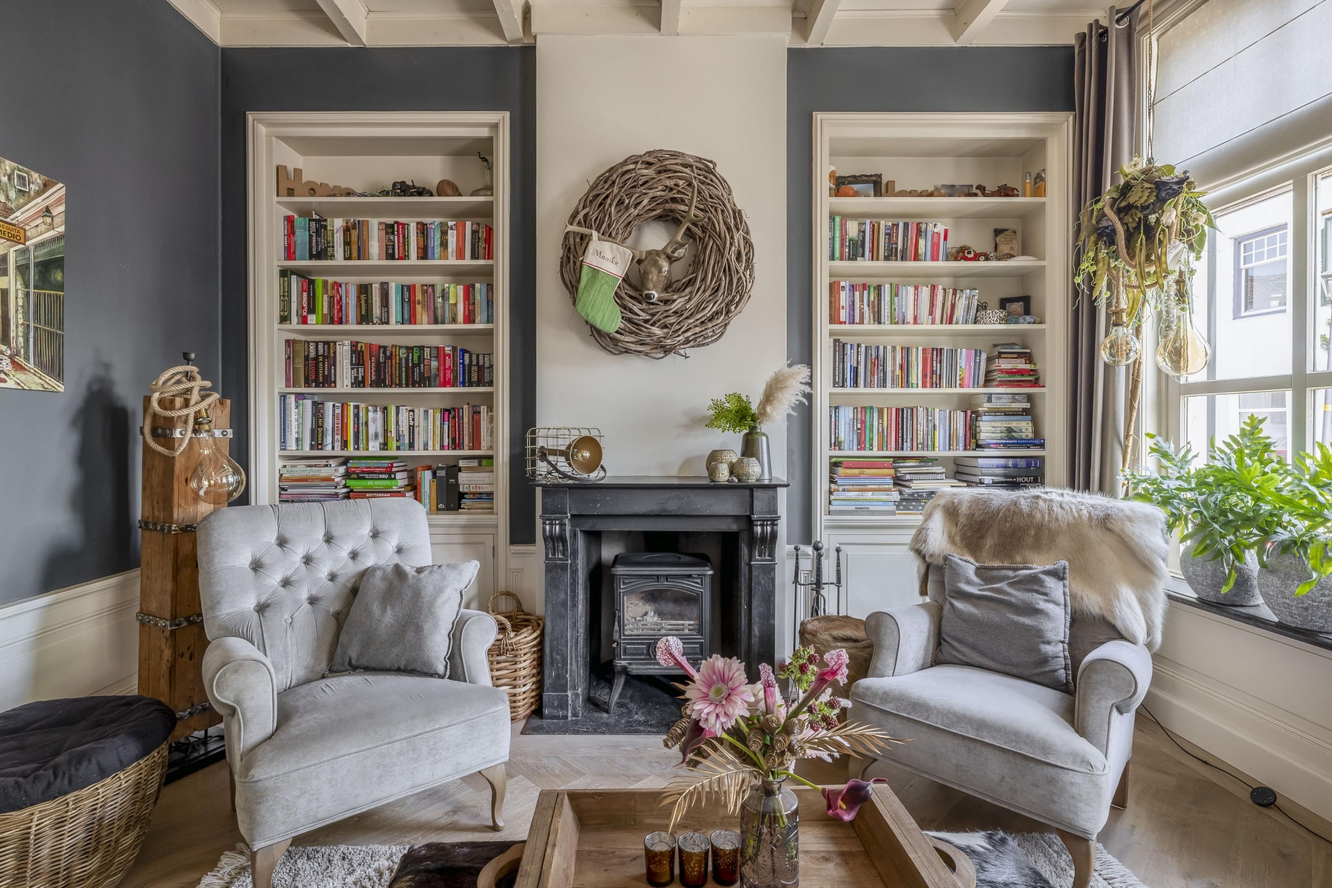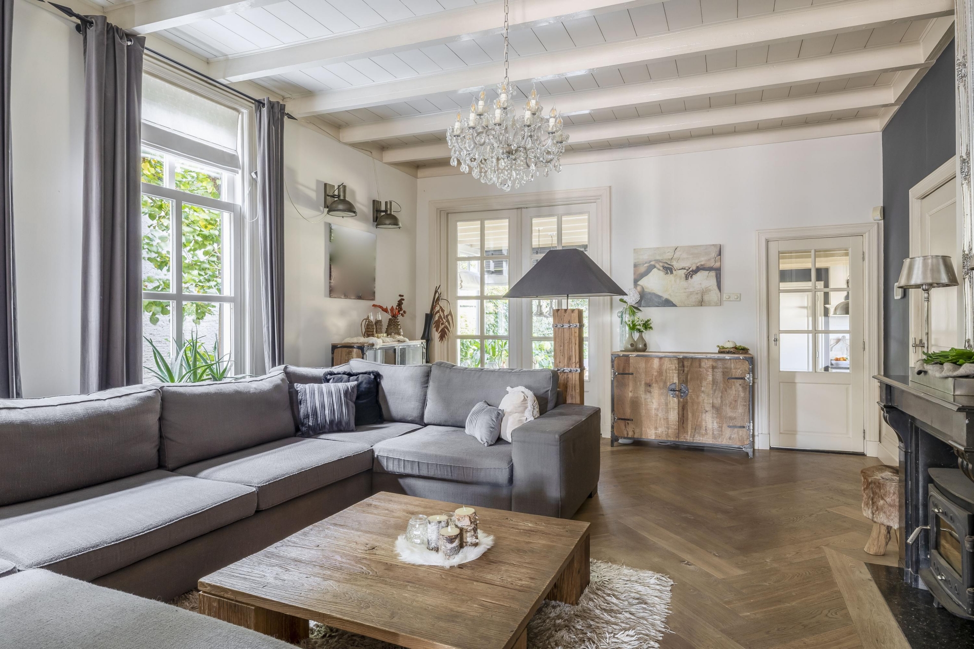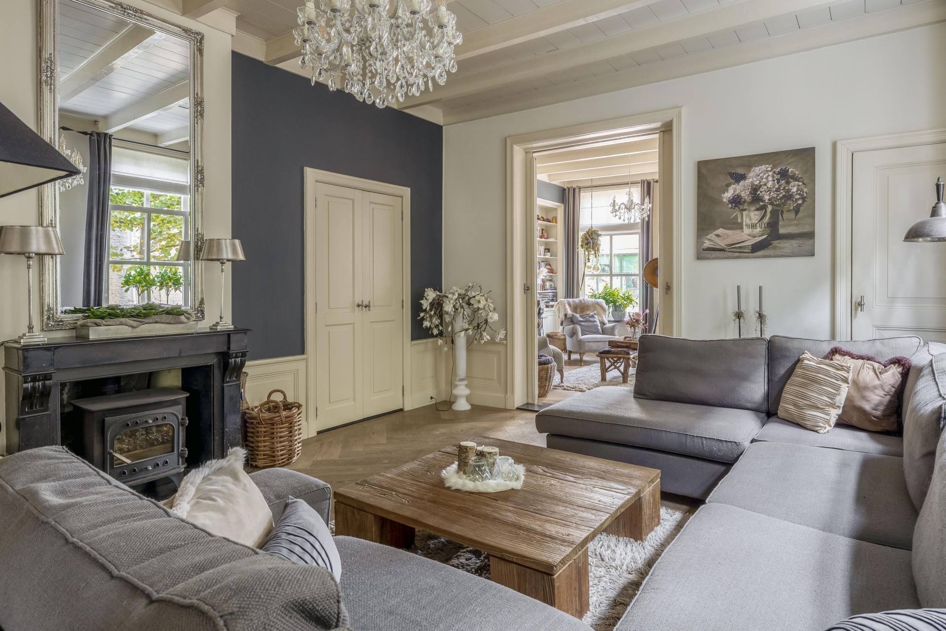 Binnenkomen voelt direct warm en huiselijk. De originele details springen eruit: paneeldeuren, lambrisering, hoge plafonds met zichtbare balken en een klassieke kamer-en-suite-indeling zorgen voor een authentieke sfeer. De voorkamer was vroeger een winkel en nu een heerlijke plek om muziek te maken of een boek te lezen. In de woonkamer geeft de schouw met houtkachel een knus middelpunt, terwijl de visgraatvloer en grote raampartijen zorgen voor een elegante en lichte uitstraling. De bedsteehoek valt op – een nostalgisch detail dat perfect past bij de sfeer van het huis. De woonkamer is royaal en geeft toegang tot de keuken en de serre aan de achterzijde van het huis.