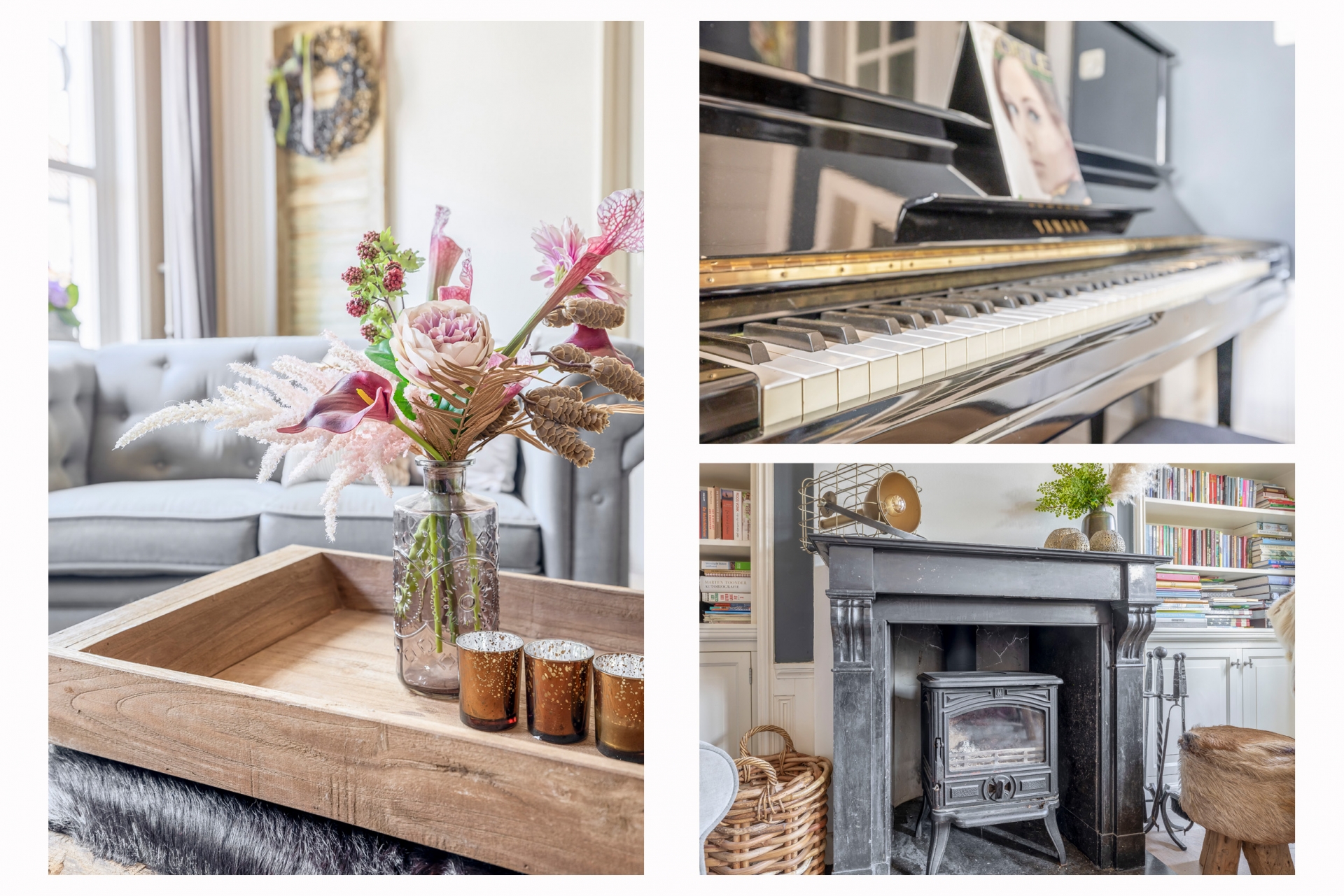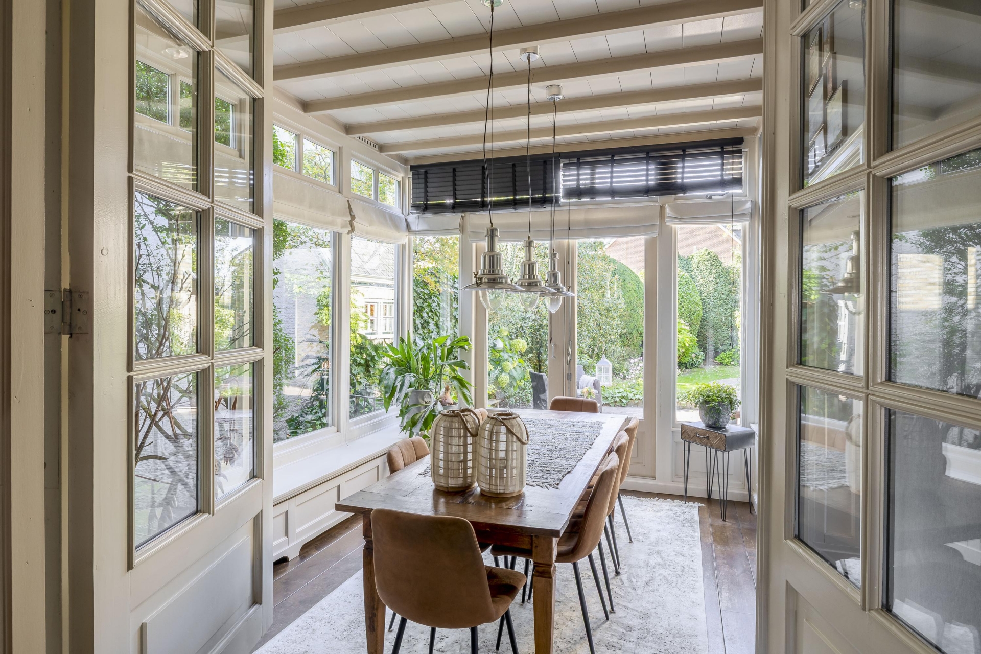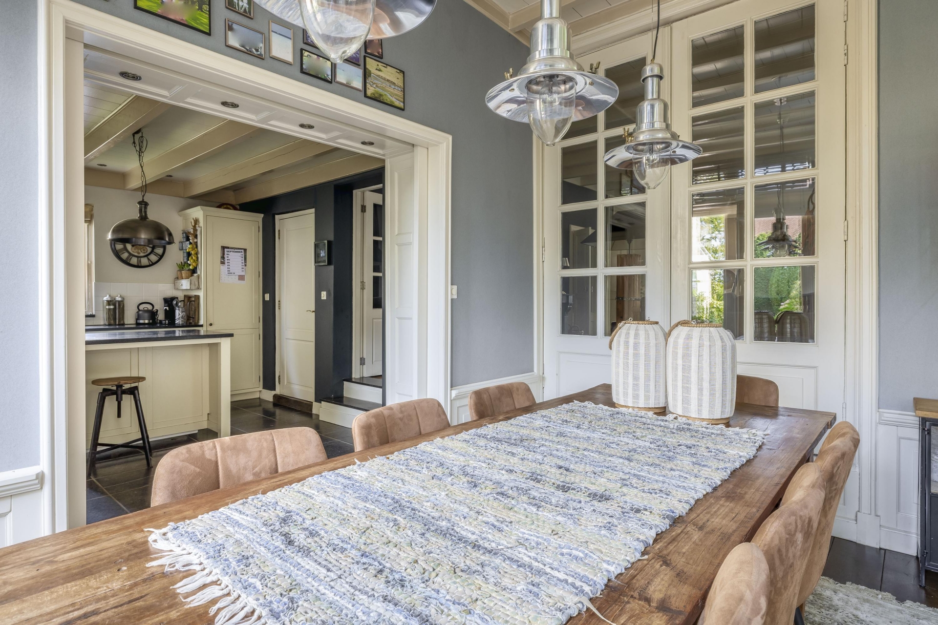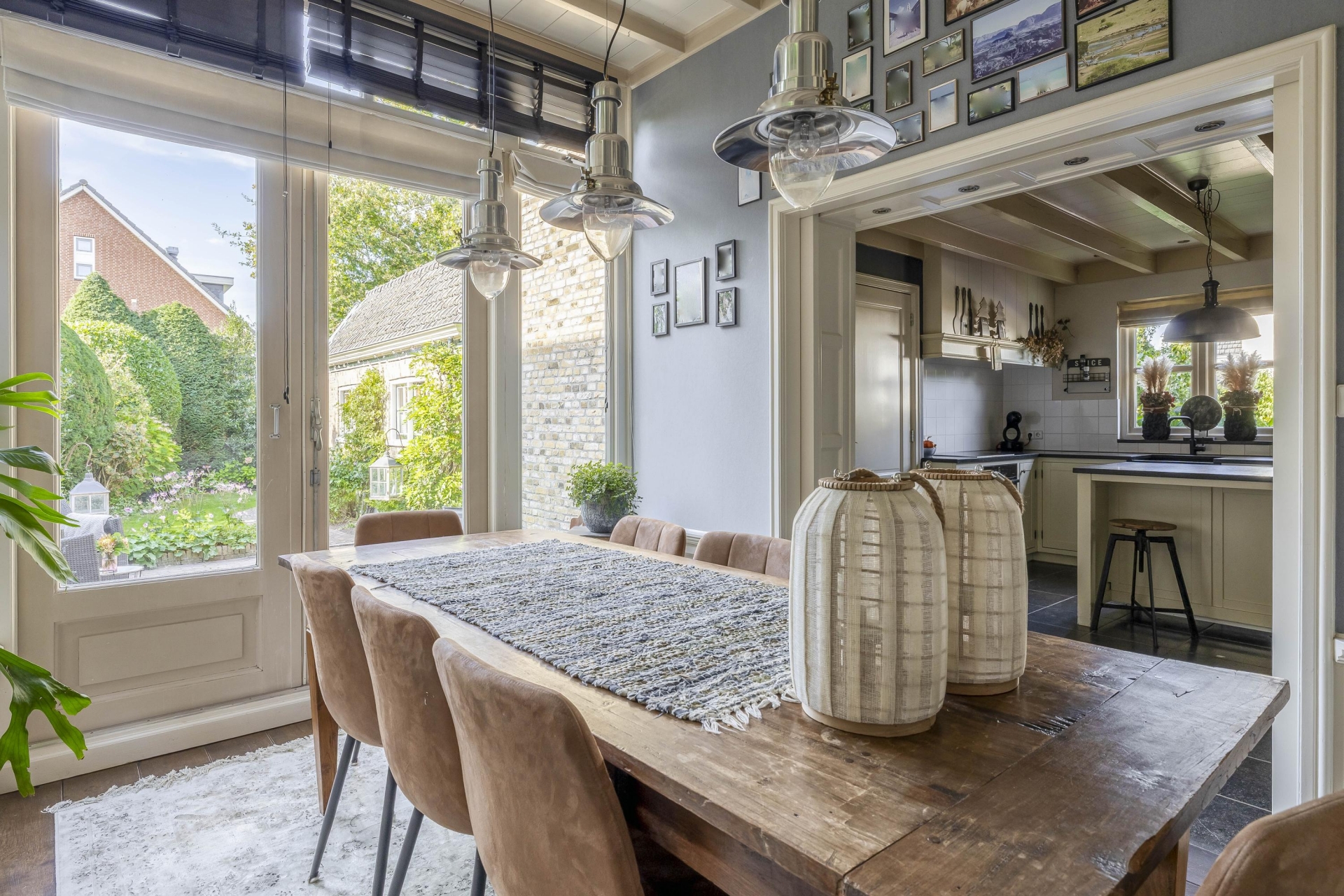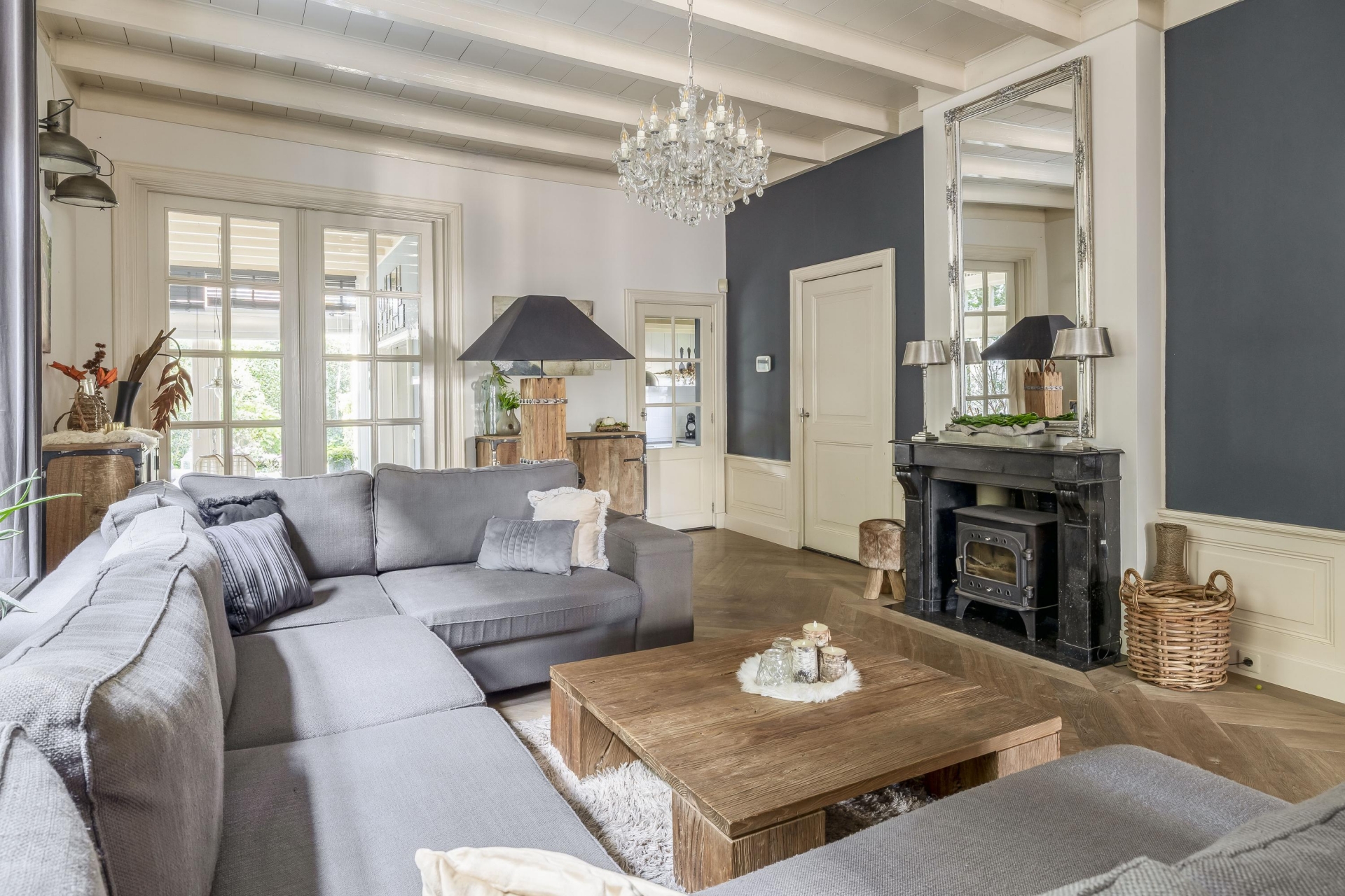 Binnenkomen voelt direct warm en huiselijk. De originele details springen eruit: paneeldeuren, lambrisering, hoge plafonds met zichtbare balken en een klassieke kamer-en-suite-indeling zorgen voor een authentieke sfeer. De voorkamer was vroeger een winkel en nu een heerlijke plek om muziek te maken of een boek te lezen. In de woonkamer geeft de schouw met houtkachel een knus middelpunt, terwijl de visgraatvloer en grote raampartijen zorgen voor een elegante en lichte uitstraling. De bedsteehoek valt op – een nostalgisch detail dat perfect past bij de sfeer van het huis. De woonkamer is royaal en geeft toegang tot de keuken en de serre aan de achterzijde van het huis.
