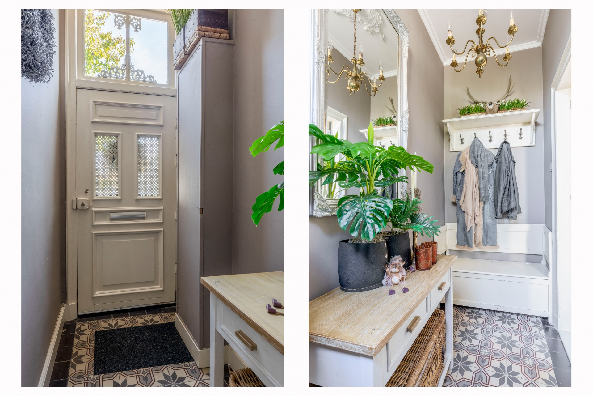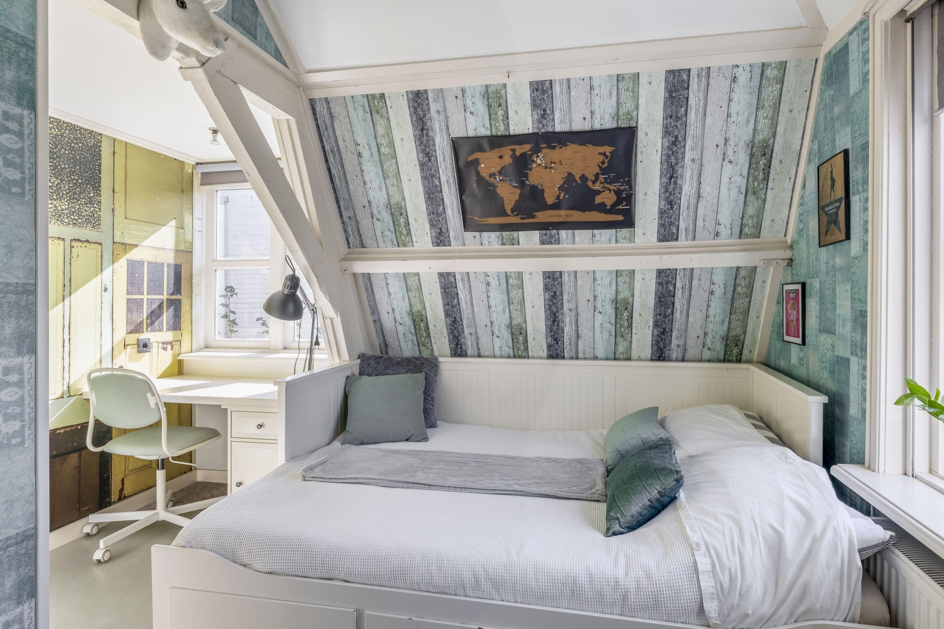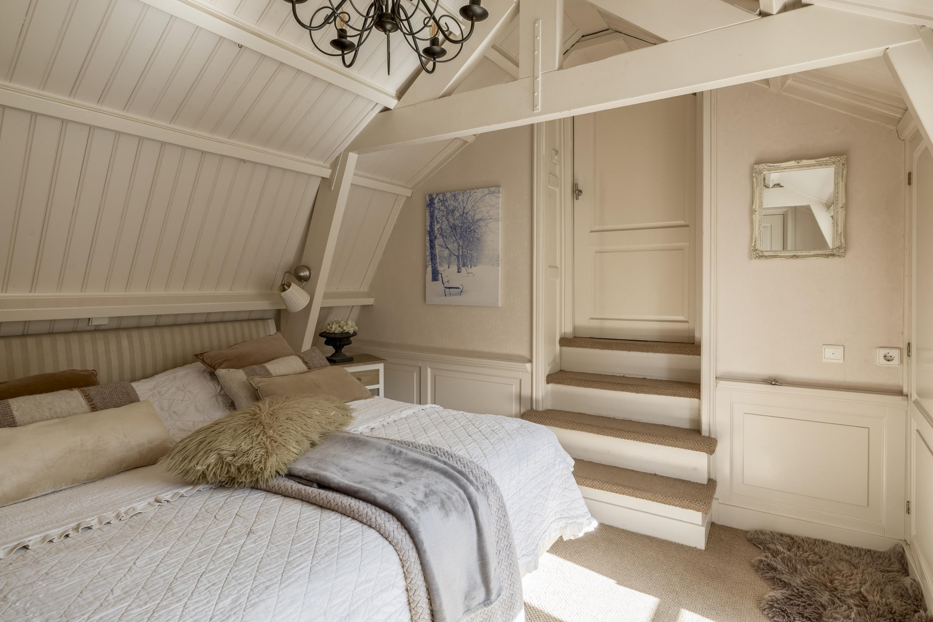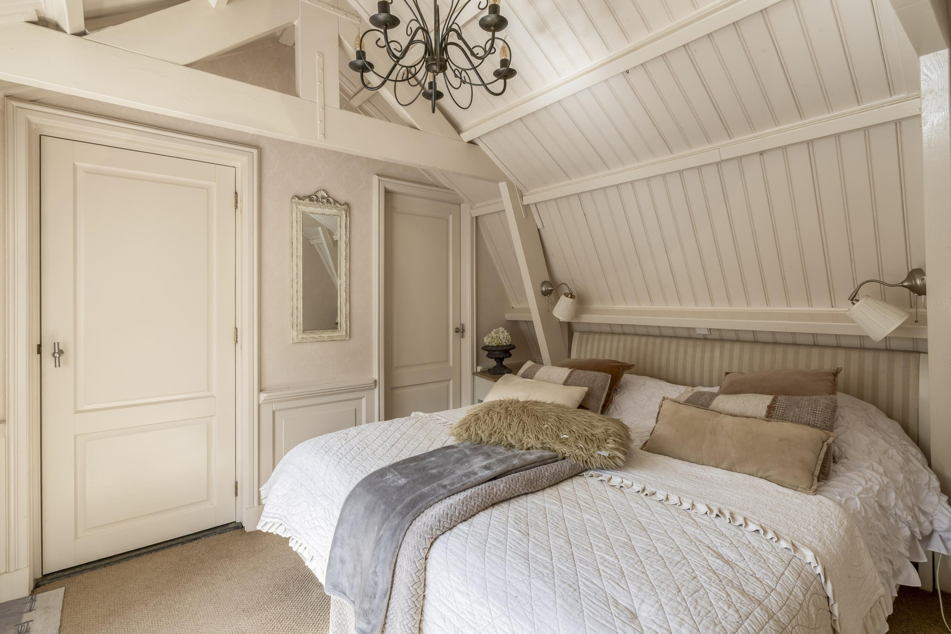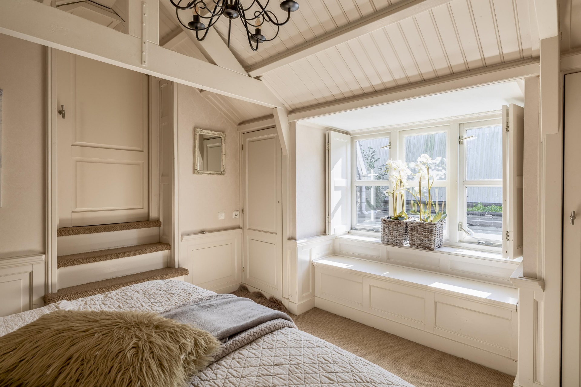 Binnenkomen voelt direct warm en huiselijk. De originele details springen eruit: paneeldeuren, lambrisering, hoge plafonds met zichtbare balken en een klassieke kamer-en-suite-indeling zorgen voor een authentieke sfeer. De voorkamer was vroeger een winkel en nu een heerlijke plek om muziek te maken of een boek te lezen. In de woonkamer geeft de schouw met houtkachel een knus middelpunt, terwijl de visgraatvloer en grote raampartijen zorgen voor een elegante en lichte uitstraling. De bedsteehoek valt op – een nostalgisch detail dat perfect past bij de sfeer van het huis. De woonkamer is royaal en geeft toegang tot de keuken en de serre aan de achterzijde van het huis.