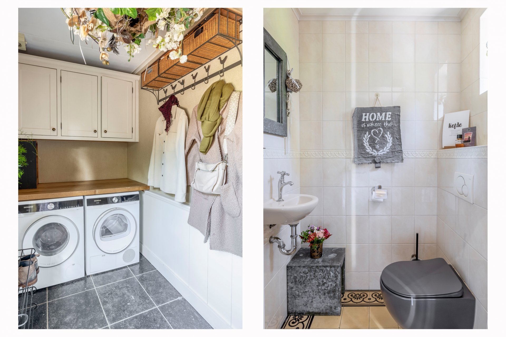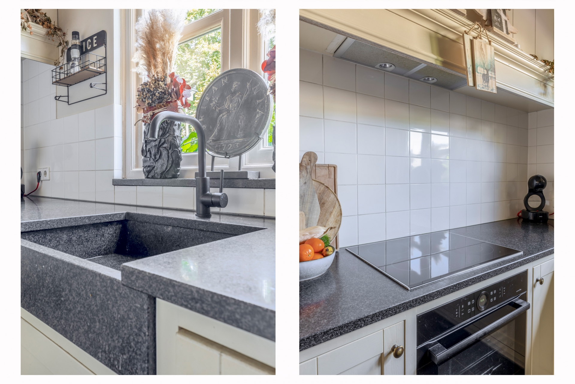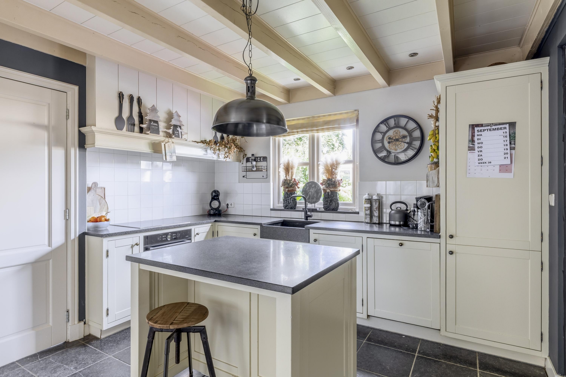 De keuken ademt landelijke charme: crème eiken houten fronten, een natuurstenen werkblad en een eiland maken het een plek waar koken een plezier is. De robuuste details worden aangevuld met moderne apparatuur en praktische bergruimte. Hier staat gezelligheid voorop, zonder in te leveren op functionaliteit. De plek om te dineren is in de serre waar je kunt genieten van de zon en het uitzicht op de tuin. De ruime kelder onder het huis is ideaal als extra bergruimte en daarnaast is er een praktische bijkeuken voor o.a. de wasapparatuur en de toilet.
