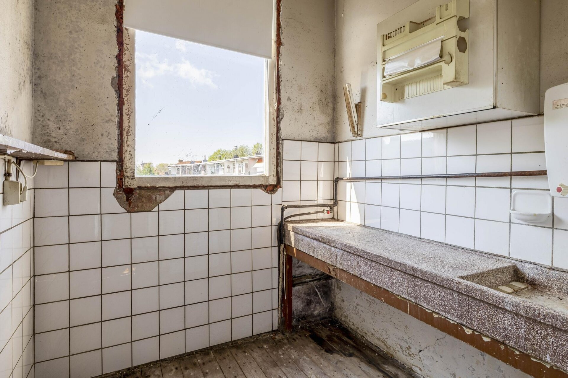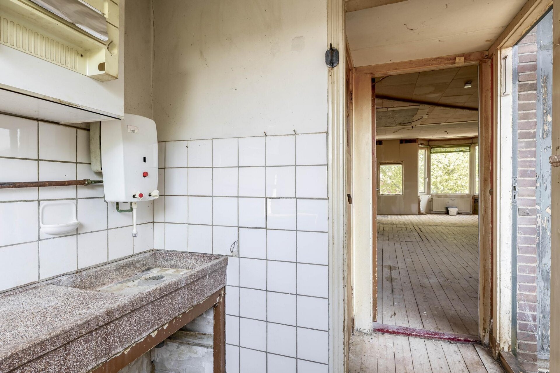 Wat direct opvalt als je binnenkomt, is de fijne lichtinval. Ondanks de huidige staat van het huis voelt de ruimte open en helder aan. De woonkamer kijkt uit over de rustige straat en biedt voldoende plek voor een gezellige zithoek en eethoek. De aparte keuken is gedateerd, en biedt volop mogelijkheden om iets moderns neer te zetten.