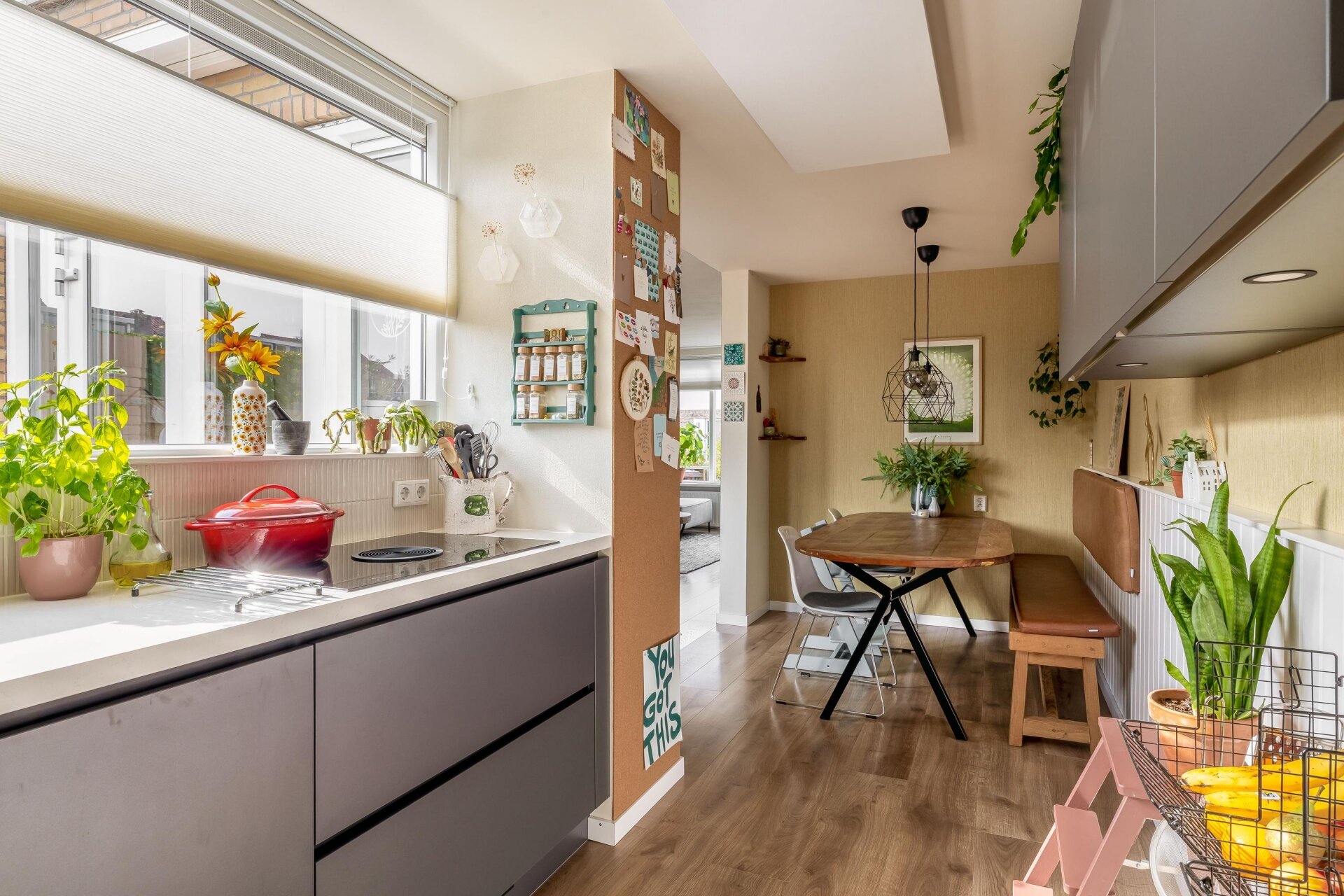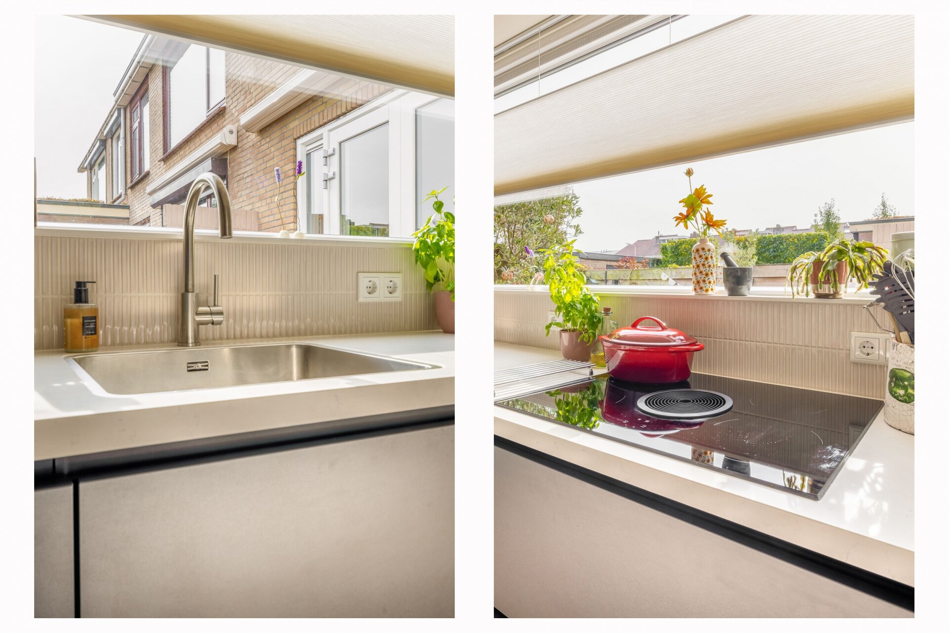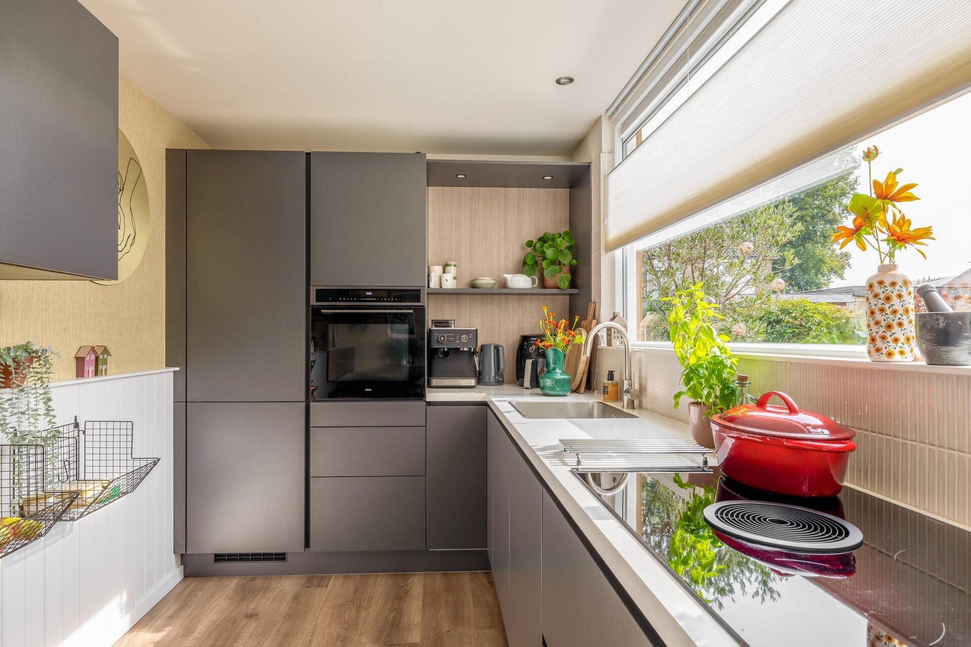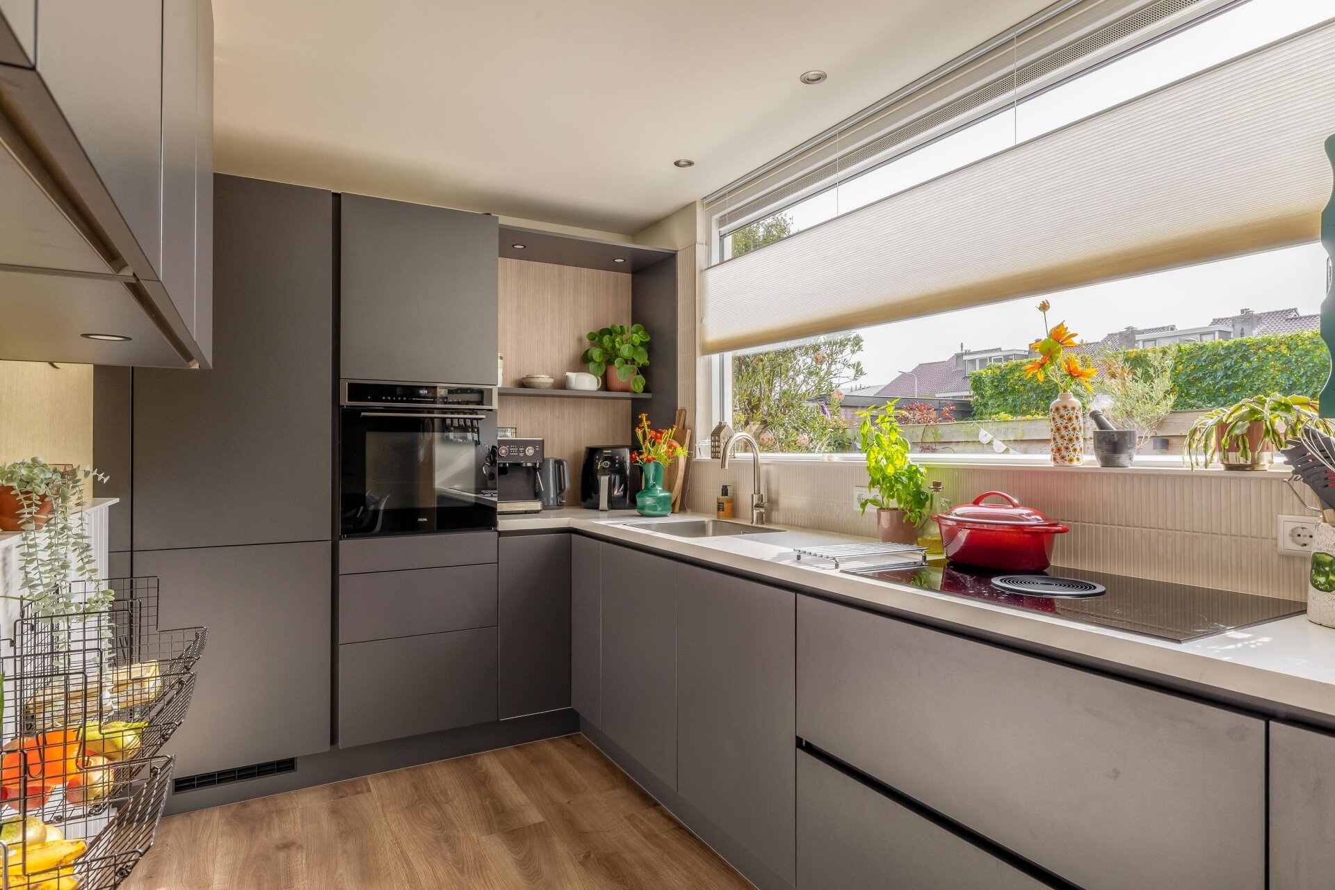 De open keuken is in 2024 compleet vernieuwd en vormt een echte blikvanger. Met strakke fronten, modern werkblad en alle benodigde inbouwapparatuur is koken hier een plezier. Denk aan een inductiekookplaat, combi-oven, koelkast, vriezer en een vaatwasser. De keuken is slim ingedeeld met voldoende werk- en opbergruimte, en kijkt uit op de tuin, handig voor wie graag kookt terwijl de kinderen buiten spelen.