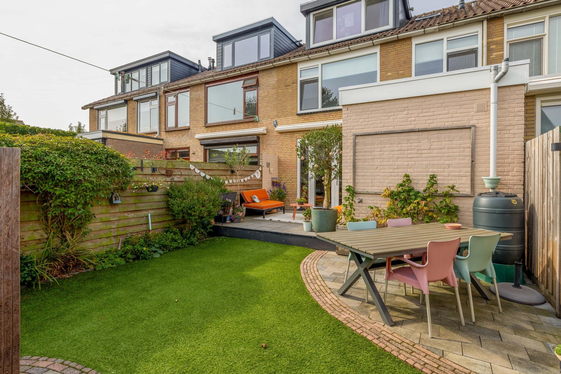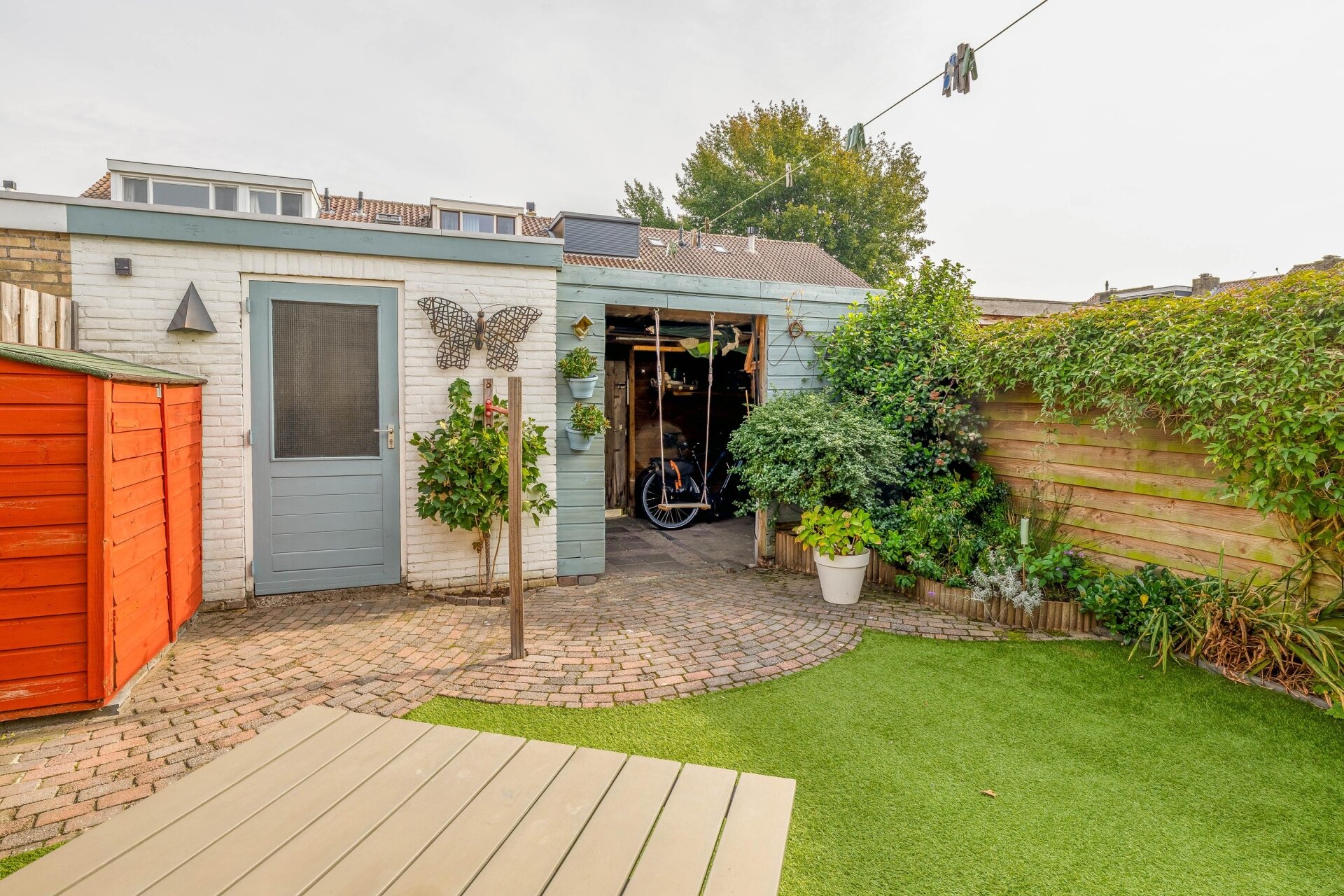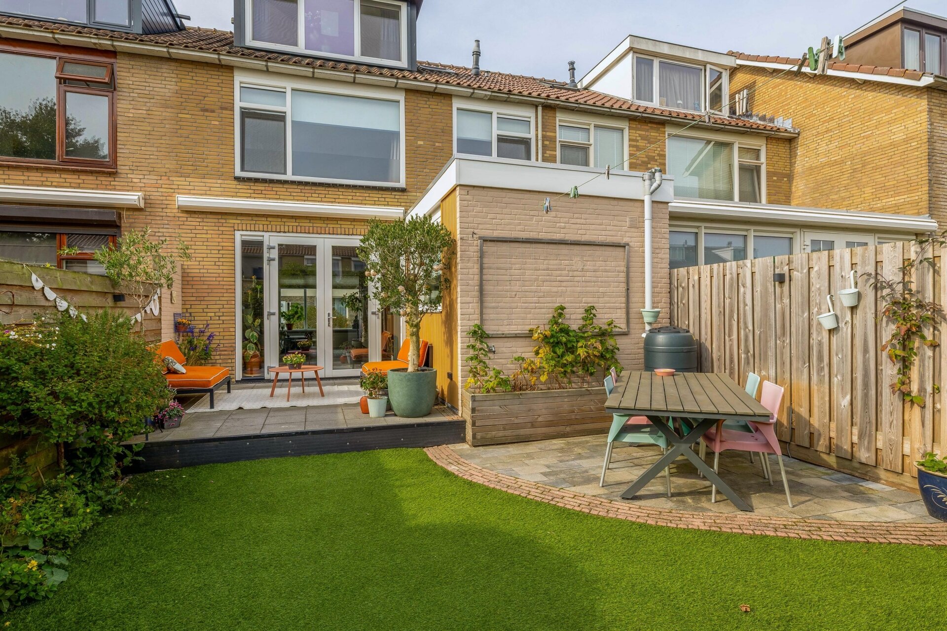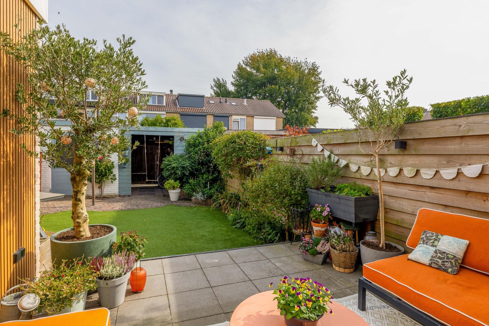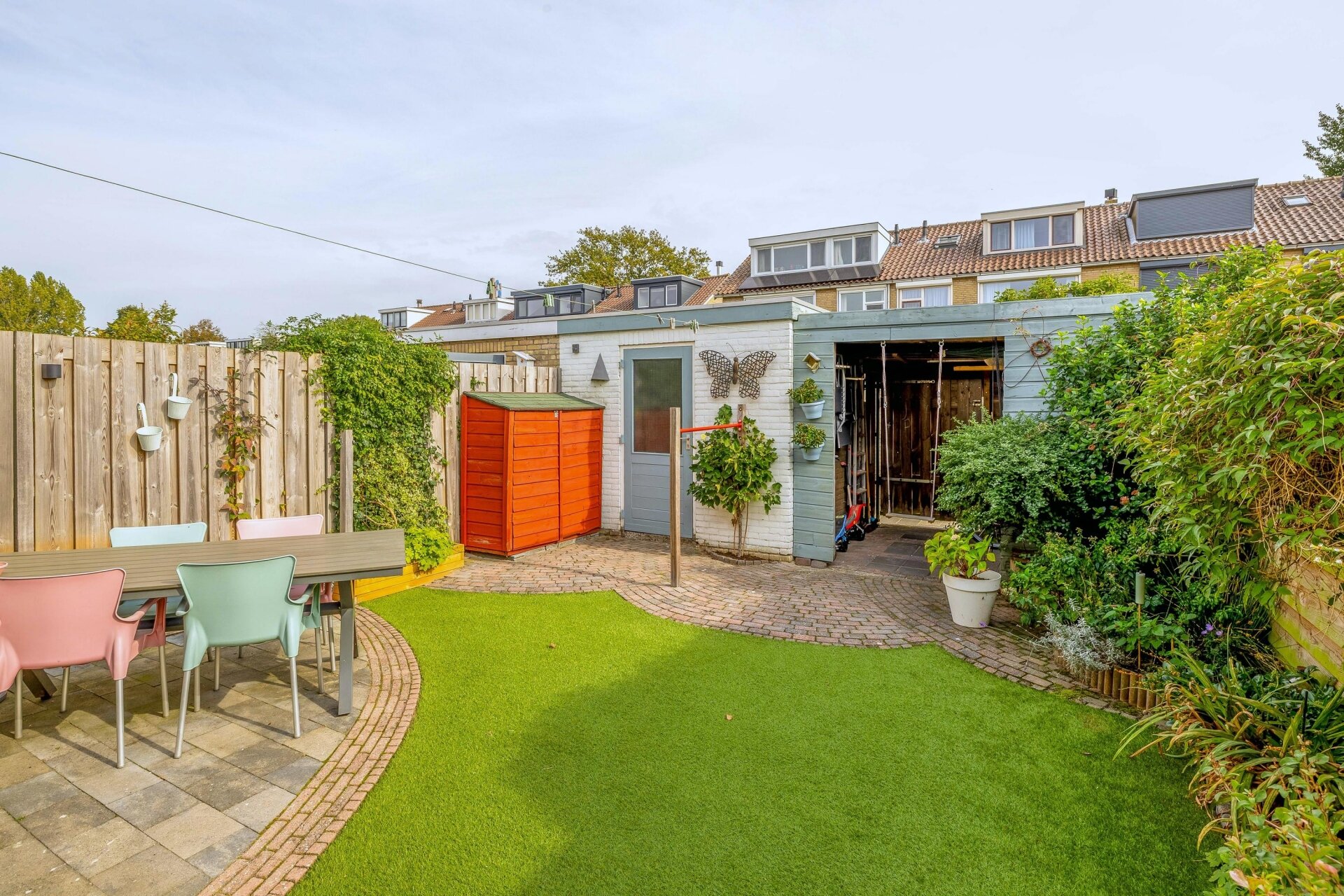 De achtertuin ligt op het oosten en is met zorg aangelegd. Er is plek genoeg voor een zitje, wat groen en eventueel een speelplek. De tuin is goed omsloten, wat zorgt voor privacy en een knusse sfeer. Achterin de tuin vind je een schuur voor fietsen en tuingereedschap.