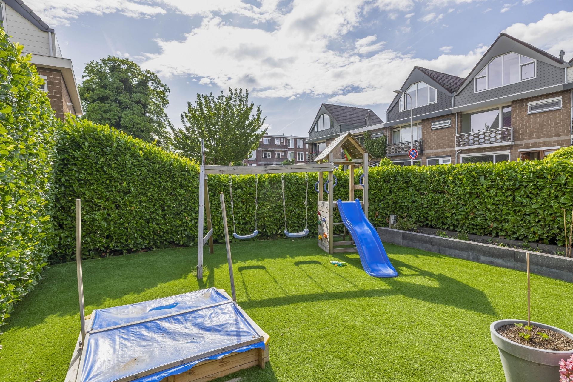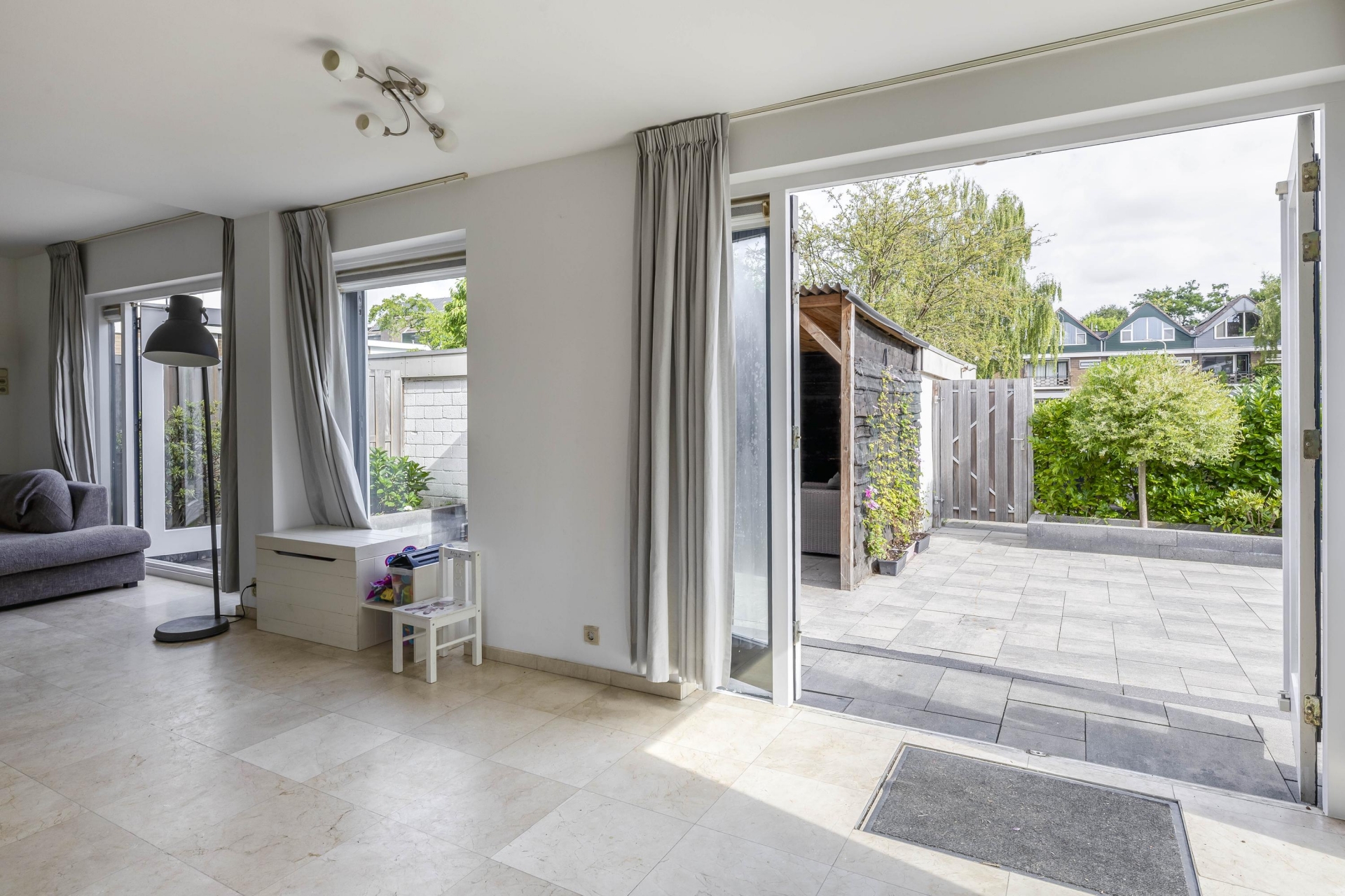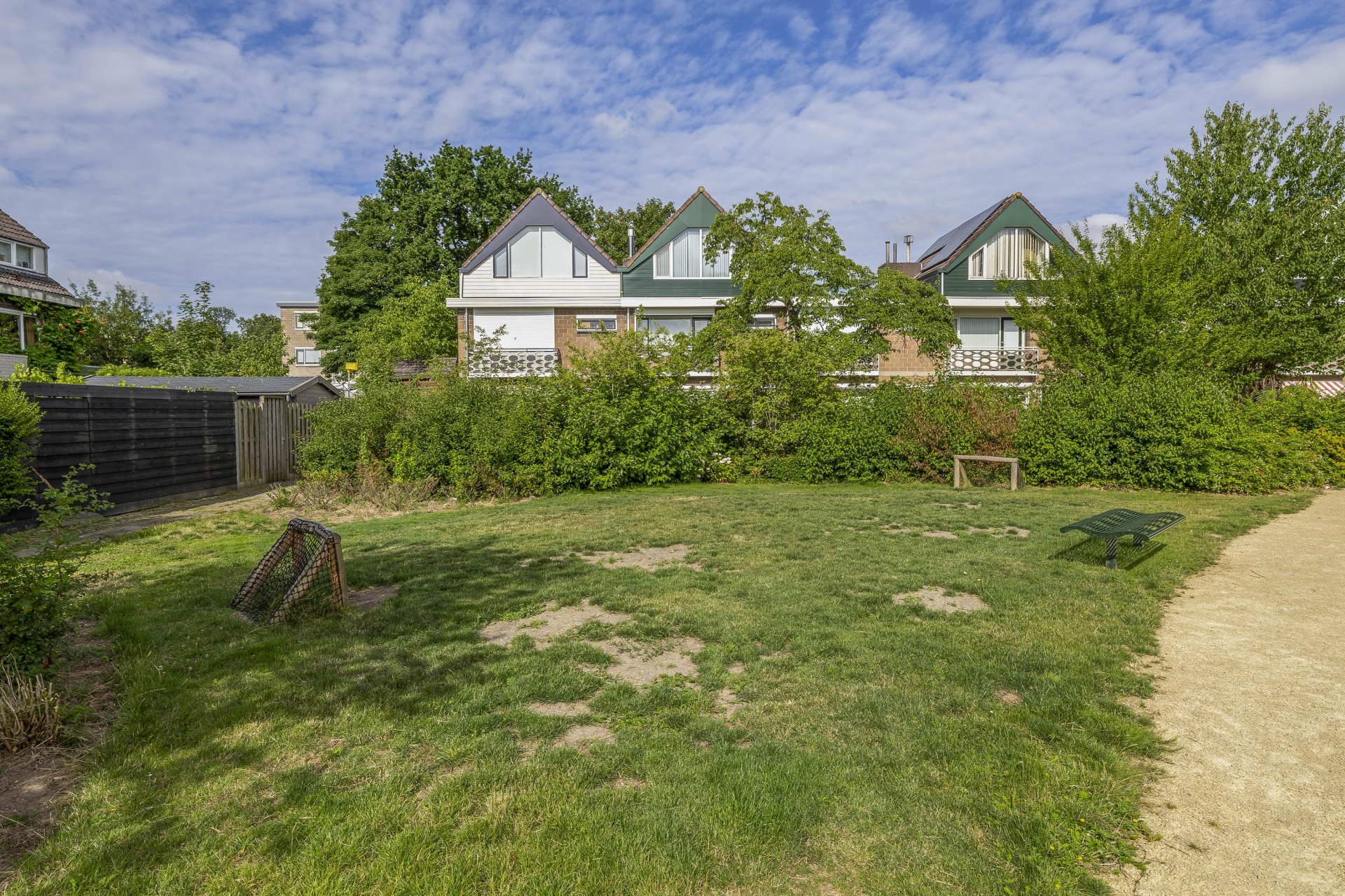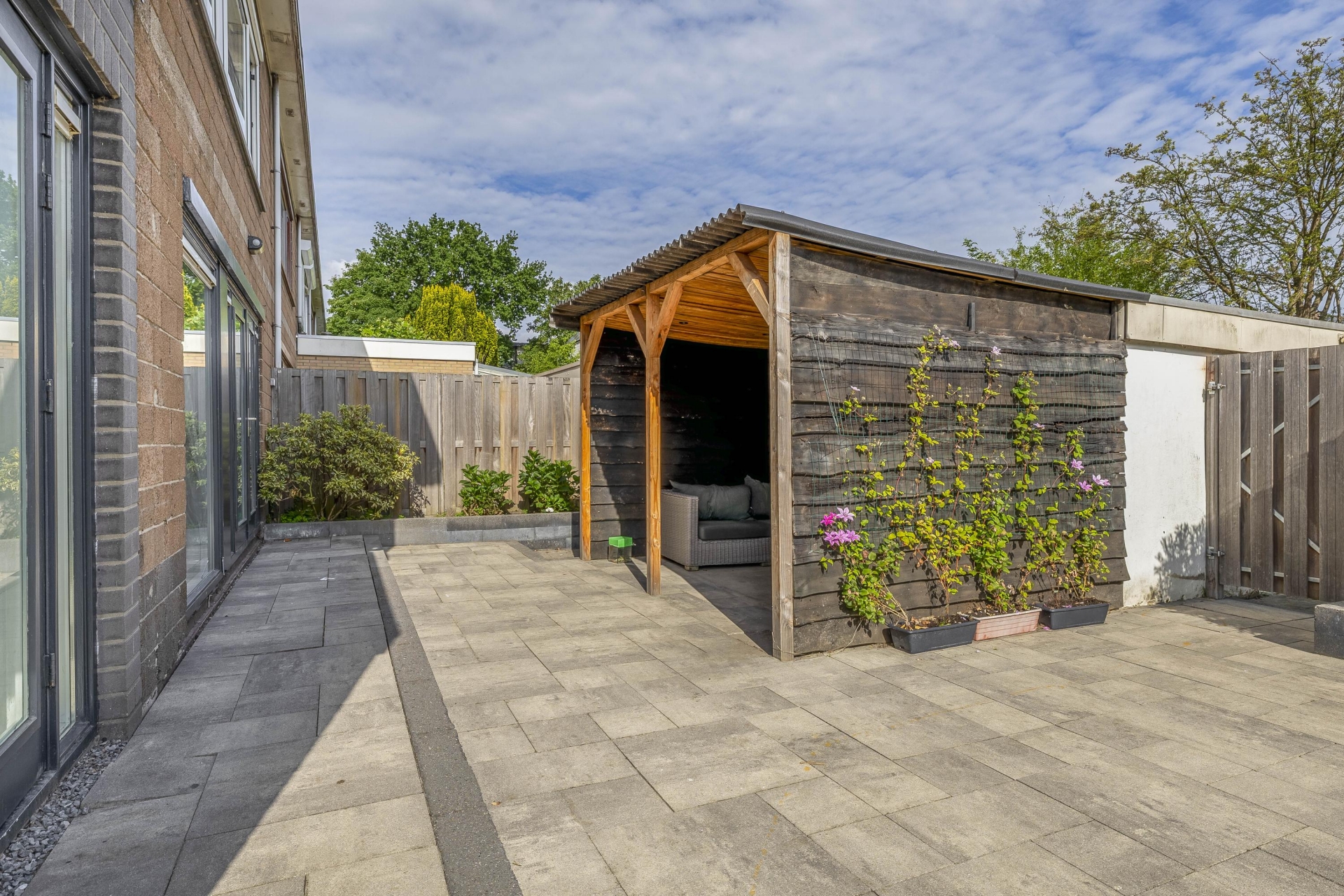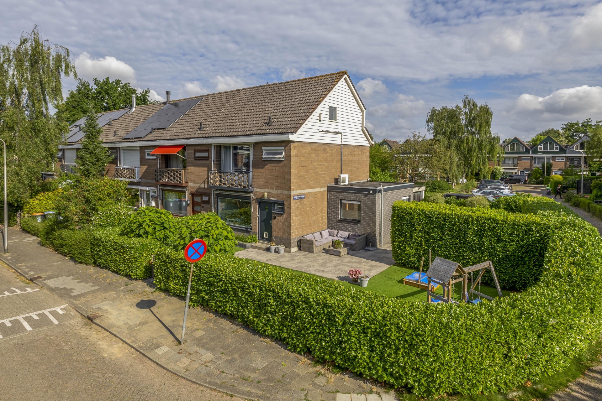 Wat dit huis écht onderscheidt is de buitenruimte. Zelden zie je zulke royale tuinen rondom een woning in deze prijsklasse. De achtertuin is gelegen op het noorden, maar dankzij de vrije ligging en grootte vang je hier de hele dag zon – van ochtendzon in de voortuin tot avondzon op het terras achterin. De tuin is netjes aangelegd met sierbestrating, kunstgras, borders én een fijne zithoek onder een houten overkapping.