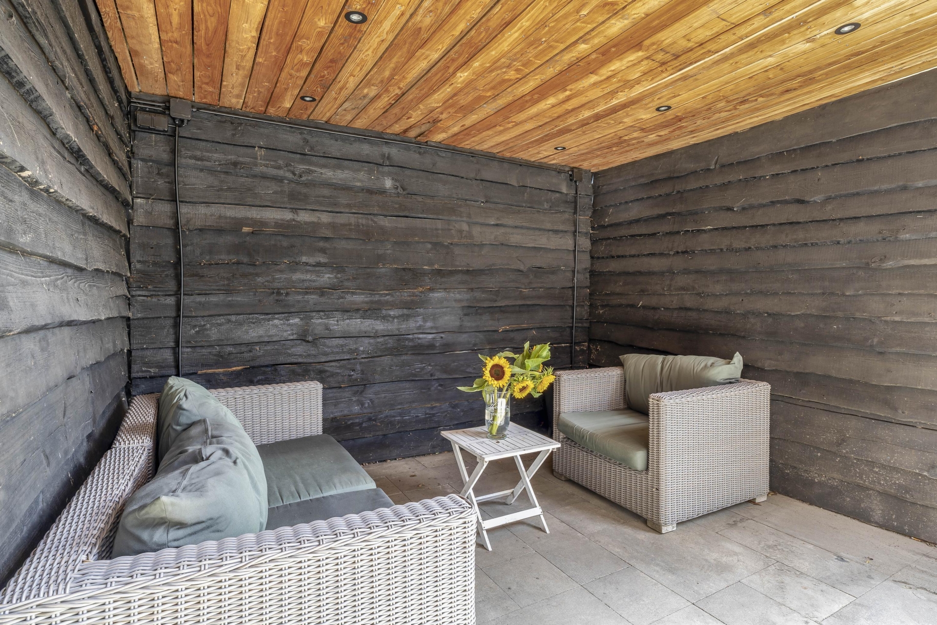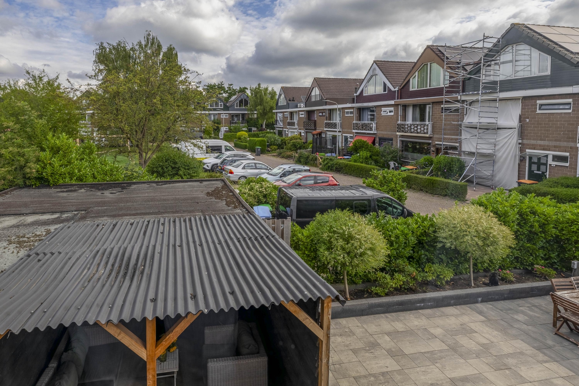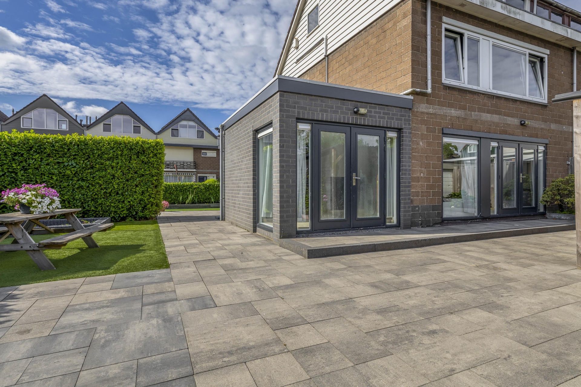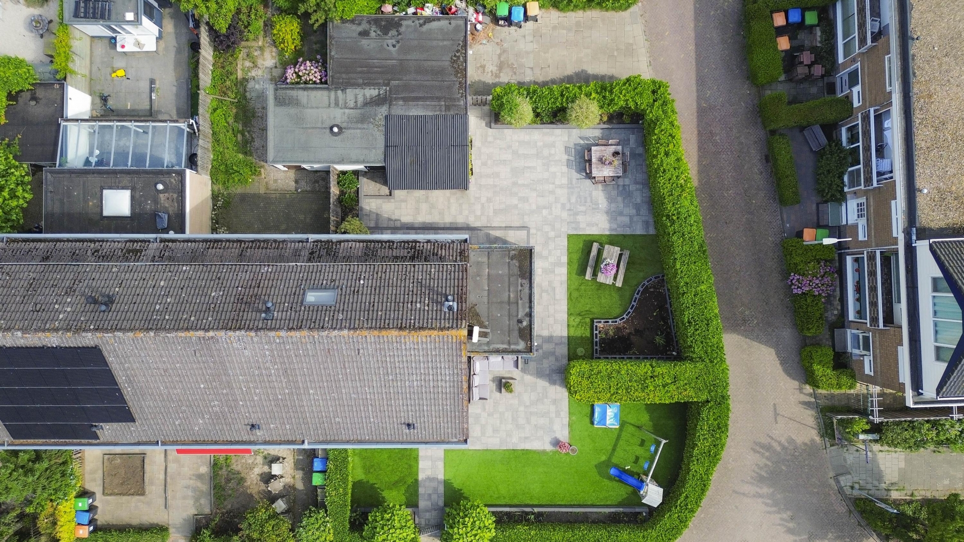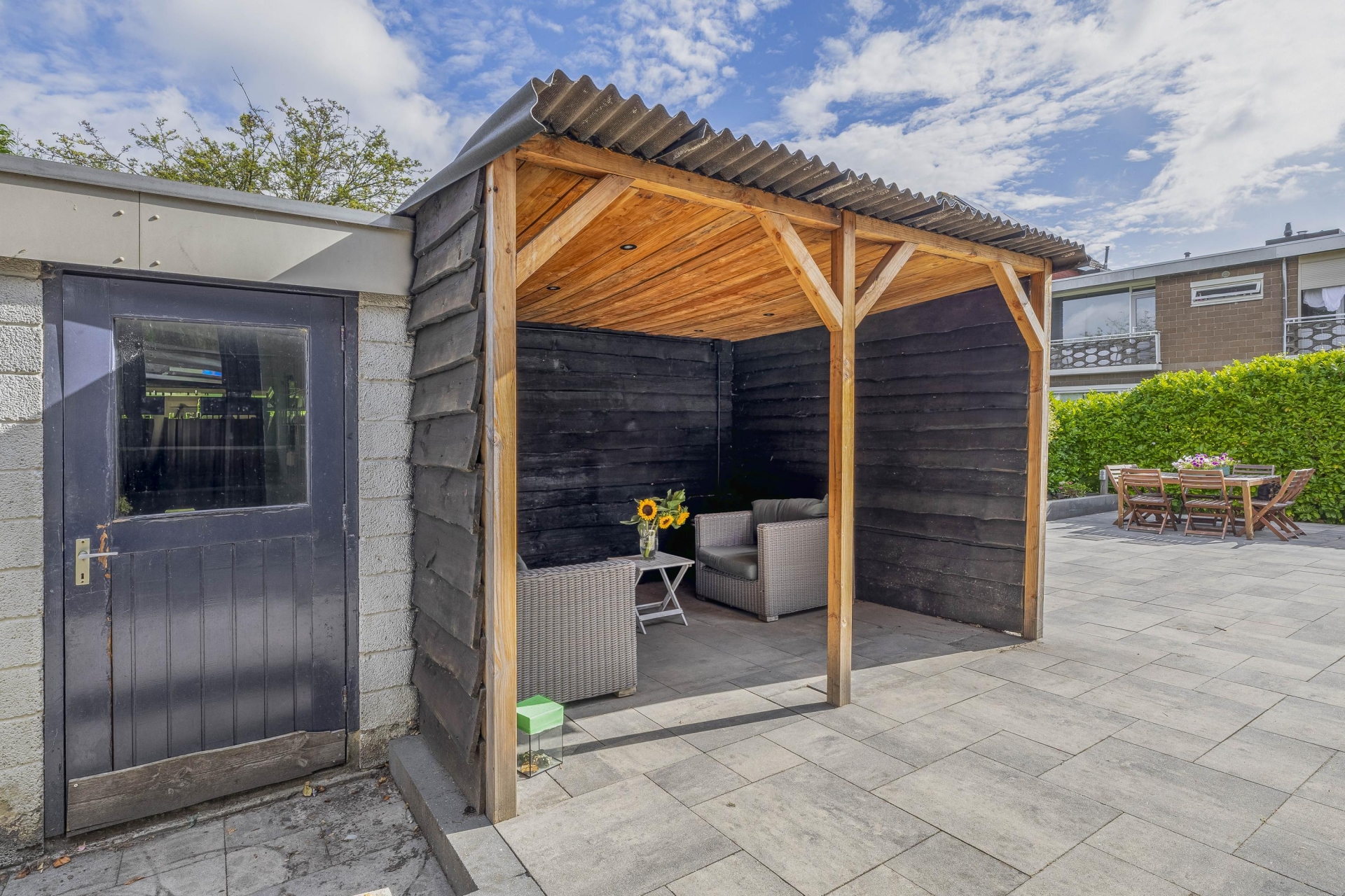 Wat dit huis écht onderscheidt is de buitenruimte. Zelden zie je zulke royale tuinen rondom een woning in deze prijsklasse. De achtertuin is gelegen op het noorden, maar dankzij de vrije ligging en grootte vang je hier de hele dag zon – van ochtendzon in de voortuin tot avondzon op het terras achterin. De tuin is netjes aangelegd met sierbestrating, kunstgras, borders én een fijne zithoek onder een houten overkapping.