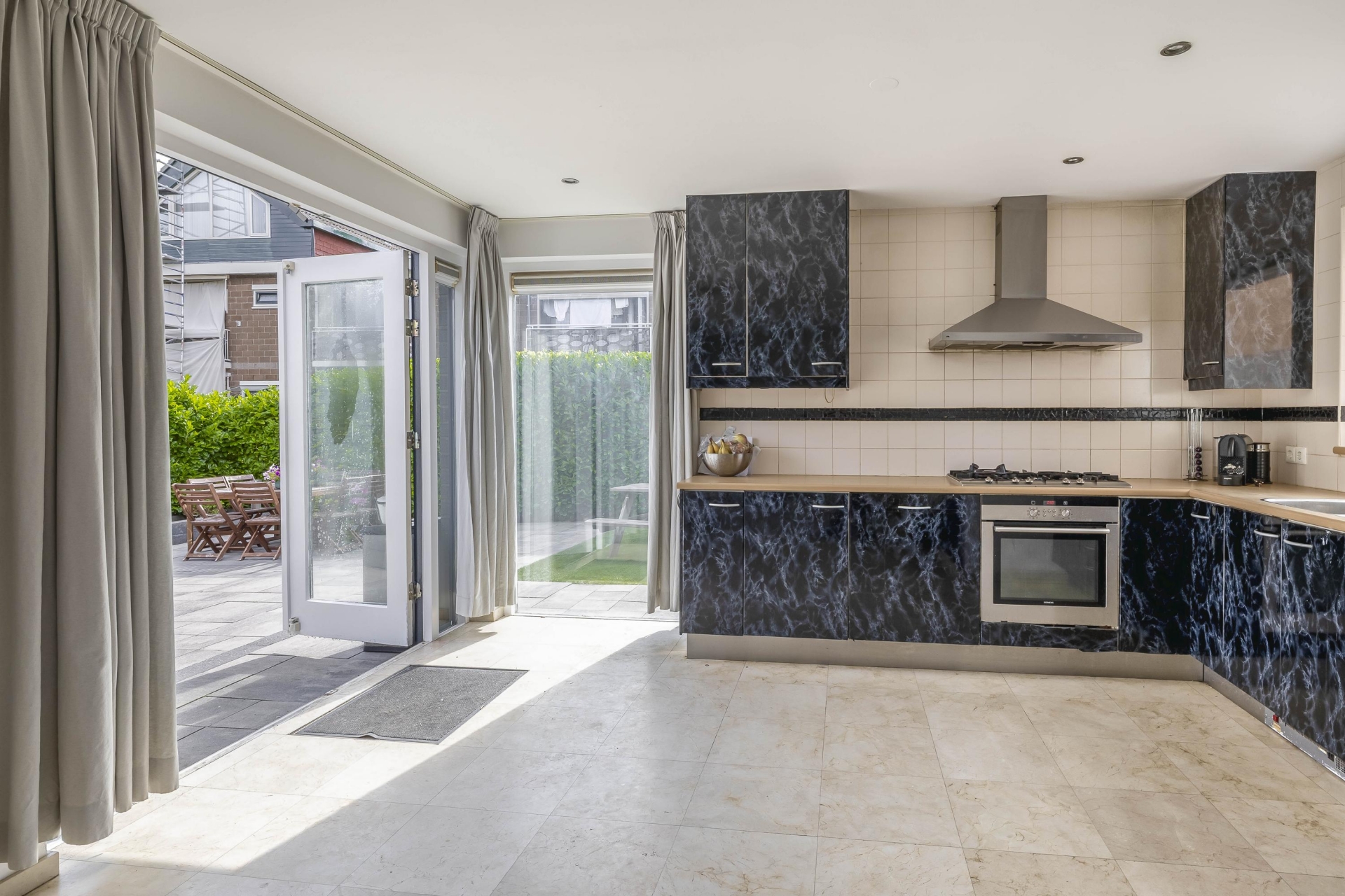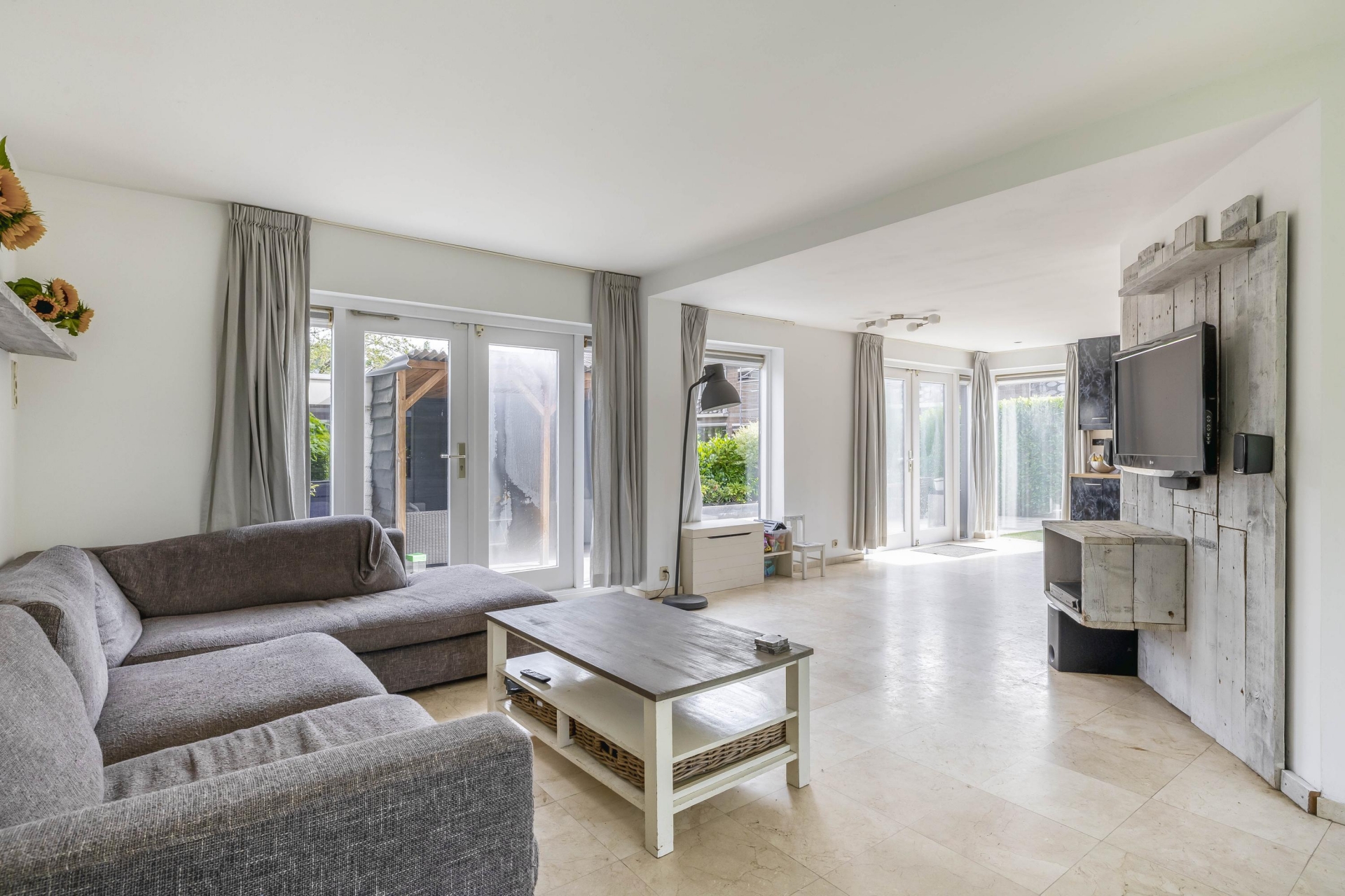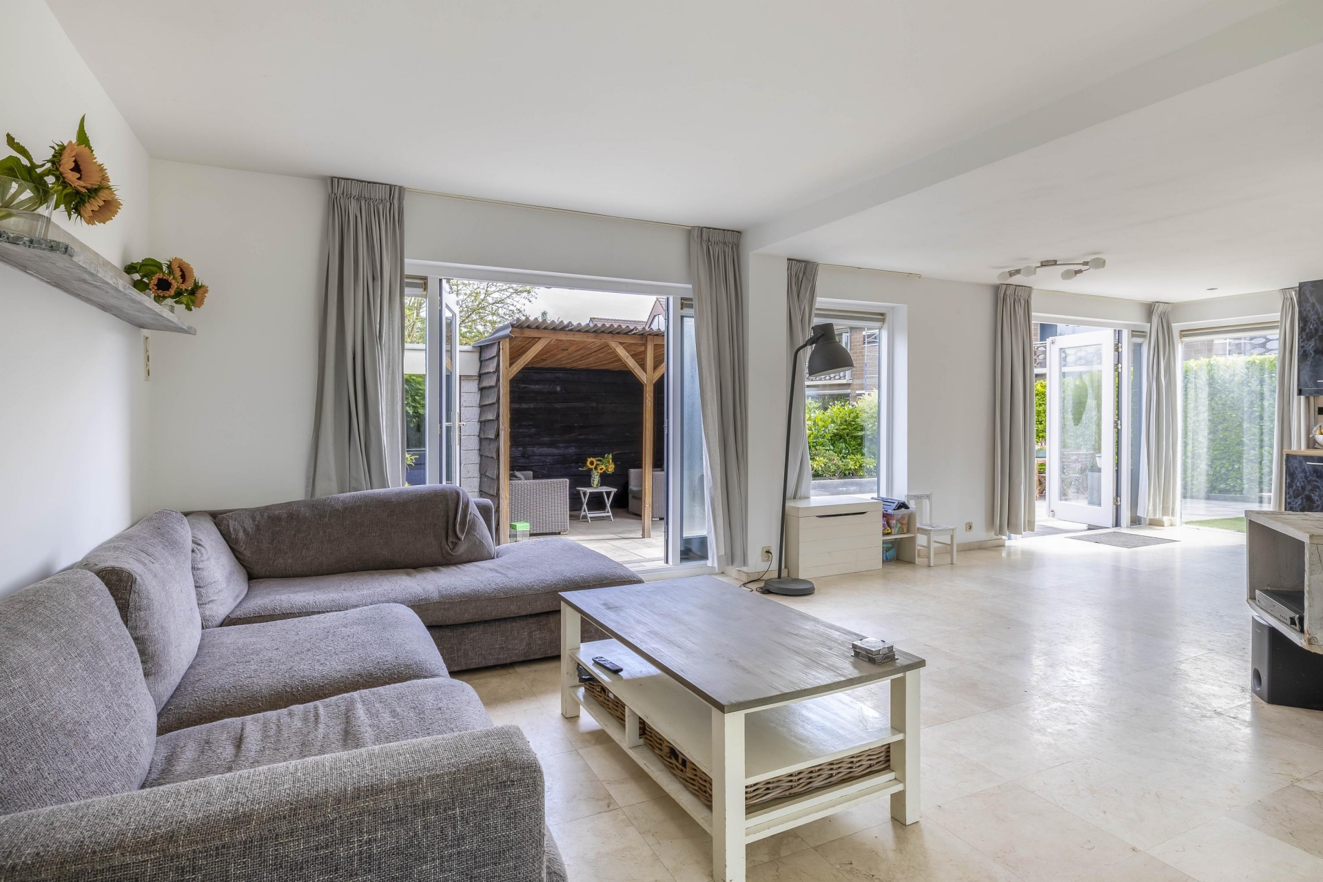 De begane grond is verrassend licht dankzij de vele raampartijen en de gunstige hoekligging. De ruime woonkamer heeft een open uitstraling en biedt genoeg plek voor een royale zithoek en een grote eettafel. De tuingerichte indeling zorgt ervoor dat je het buitengevoel naar binnen haalt – via meerdere openslaande deuren sta je zo in de tuin.