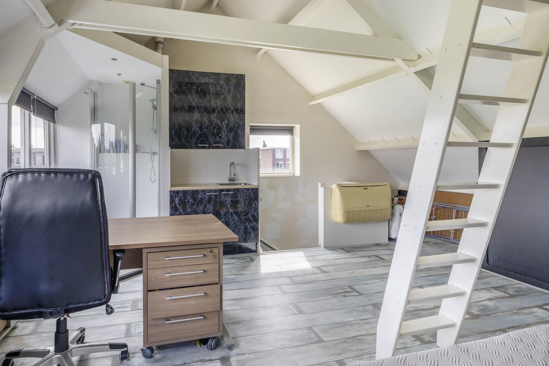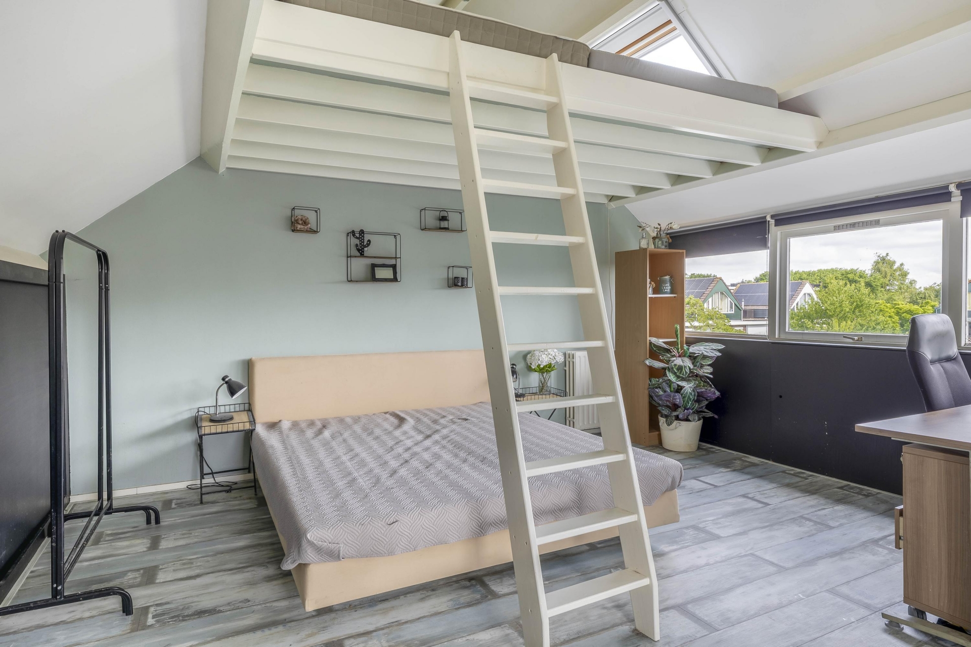 Op de eerste verdieping bevinden zich twee slaapkamers, waarvan de grootste aan de achterzijde ligt met zicht op de tuin. De badkamer is functioneel ingericht met een douche, wastafel en tweede toilet. De walk-in closet kan makkelijk omgebouwd worden tot extra slaapkamer. De tweede verdieping is bereikbaar via een vaste trap waar een derde slaapkamer te vinden is, maar kan ook worden benut als werkkamer. Hier is ook een extra douchecabine te vinden met fonteintje.