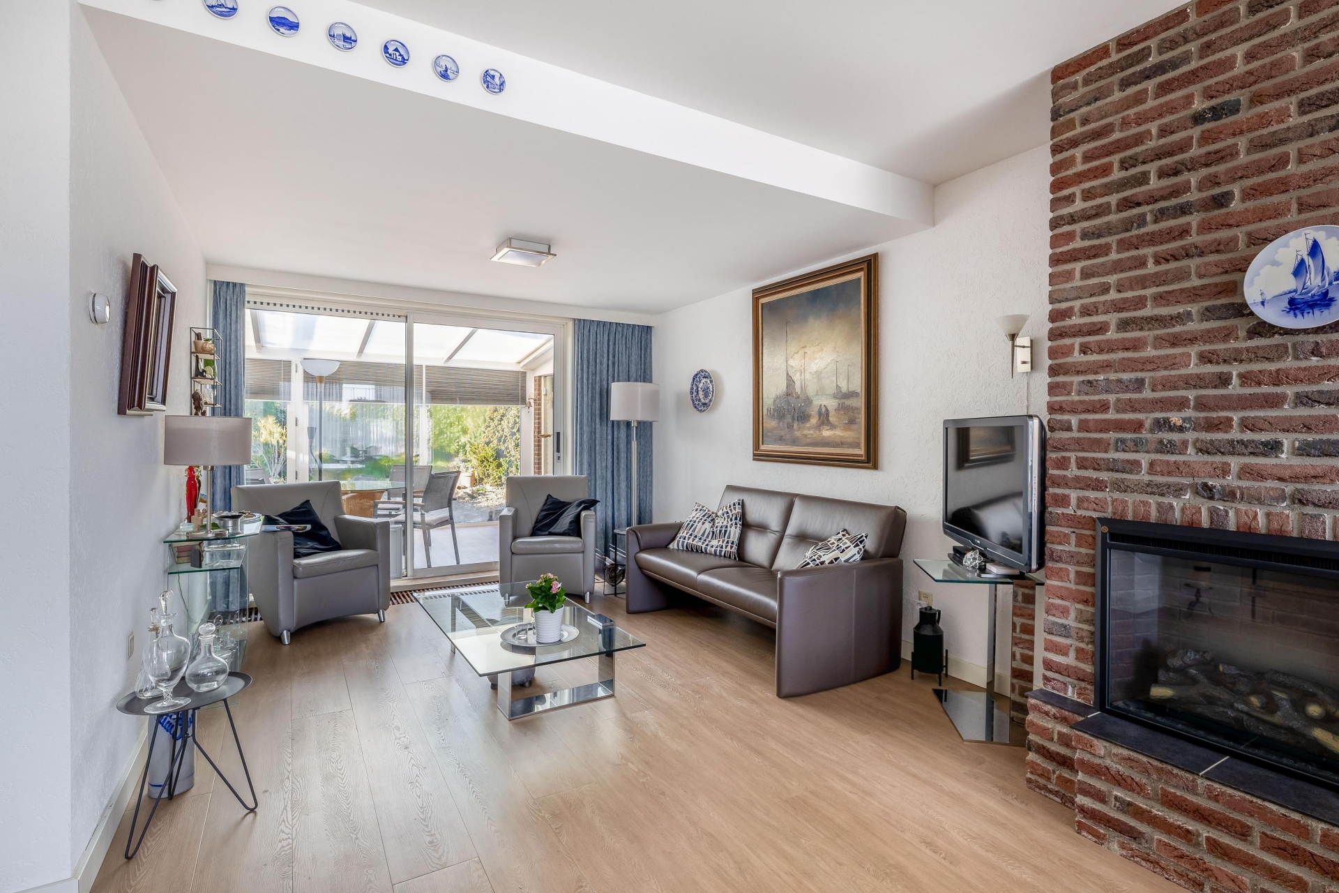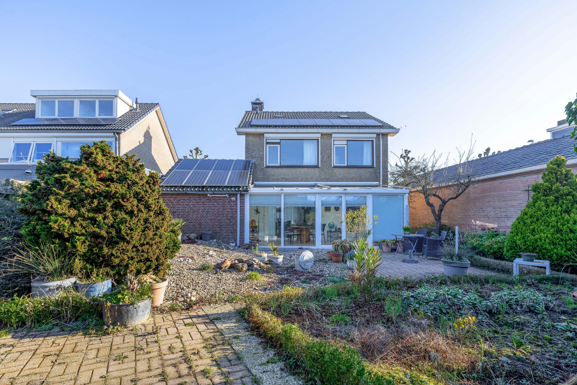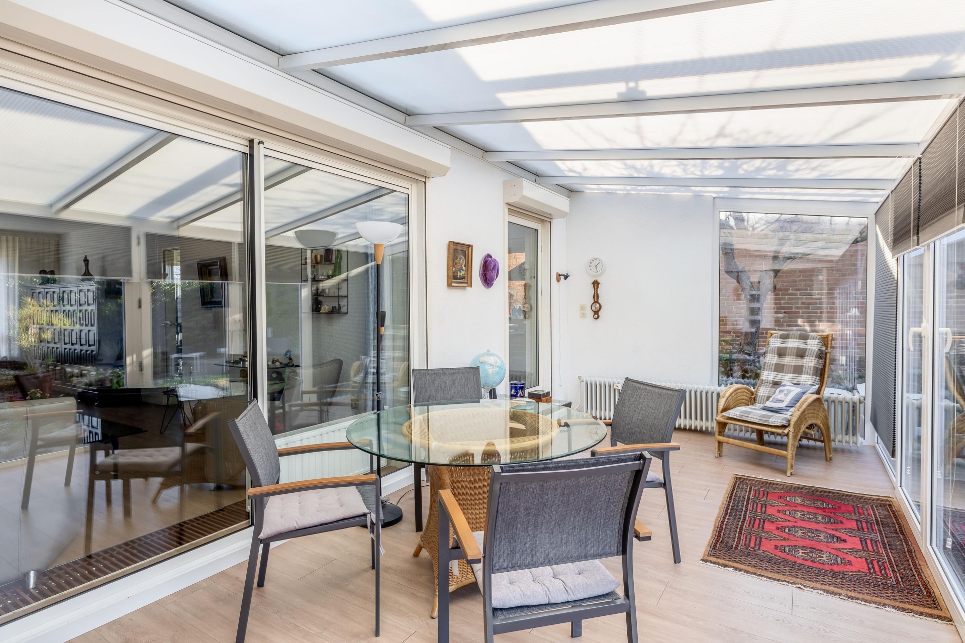 Aansluitend vind je de serre: een heerlijke extra ruimte die volledig bij het huis betrokken is en bovendien verwarmd is. Dit is zo’n plek waar je al vroeg in het voorjaar zit en tot laat in het najaar nog geniet van het buitengevoel. De serre vormt een mooie overgang tussen binnen en buiten en vergroot de leefruimte aanzienlijk.