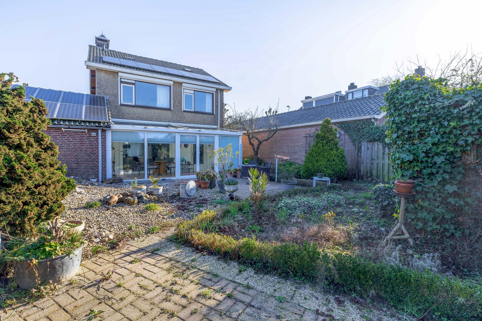De achtertuin is een van de grote pluspunten van dit huis. Met een ligging op het zuidwesten geniet je hier volop van de zon, van de middag tot in de avond. De tuin is diep en biedt veel privacy, met voldoende ruimte voor meerdere terrassen, groen en eventueel een moestuin of overkapping.