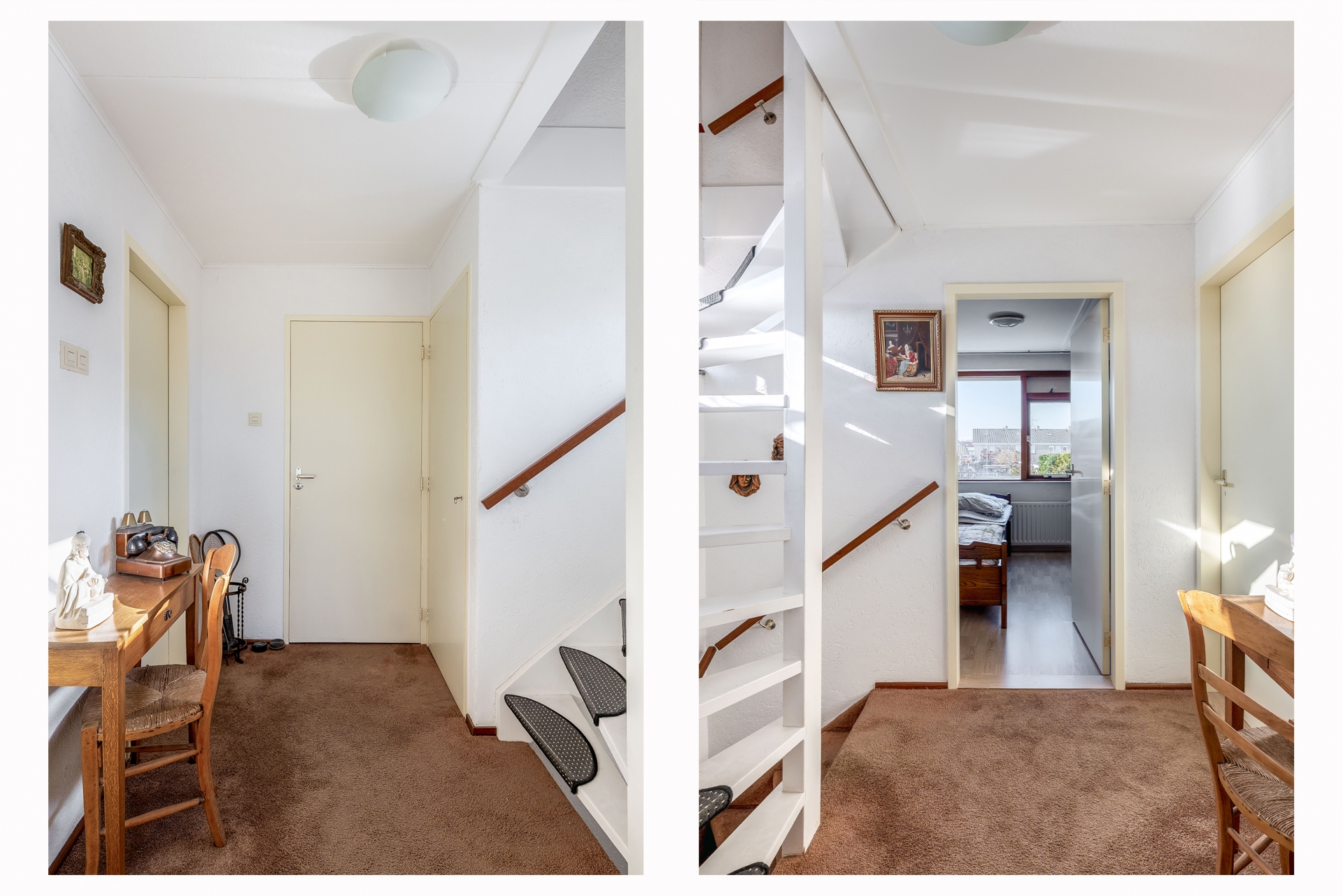 Op de eerste verdieping bevinden zich twee ruime slaapkamers en de badkamer. De grootste slaapkamer biedt voldoende ruimte voor een volwaardige indeling en eventueel kastruimte of splitsing naar twee slaapkamers. De tweede slaapkamer is ideaal als logeerkamer, werkkamer of hobbyruimte.