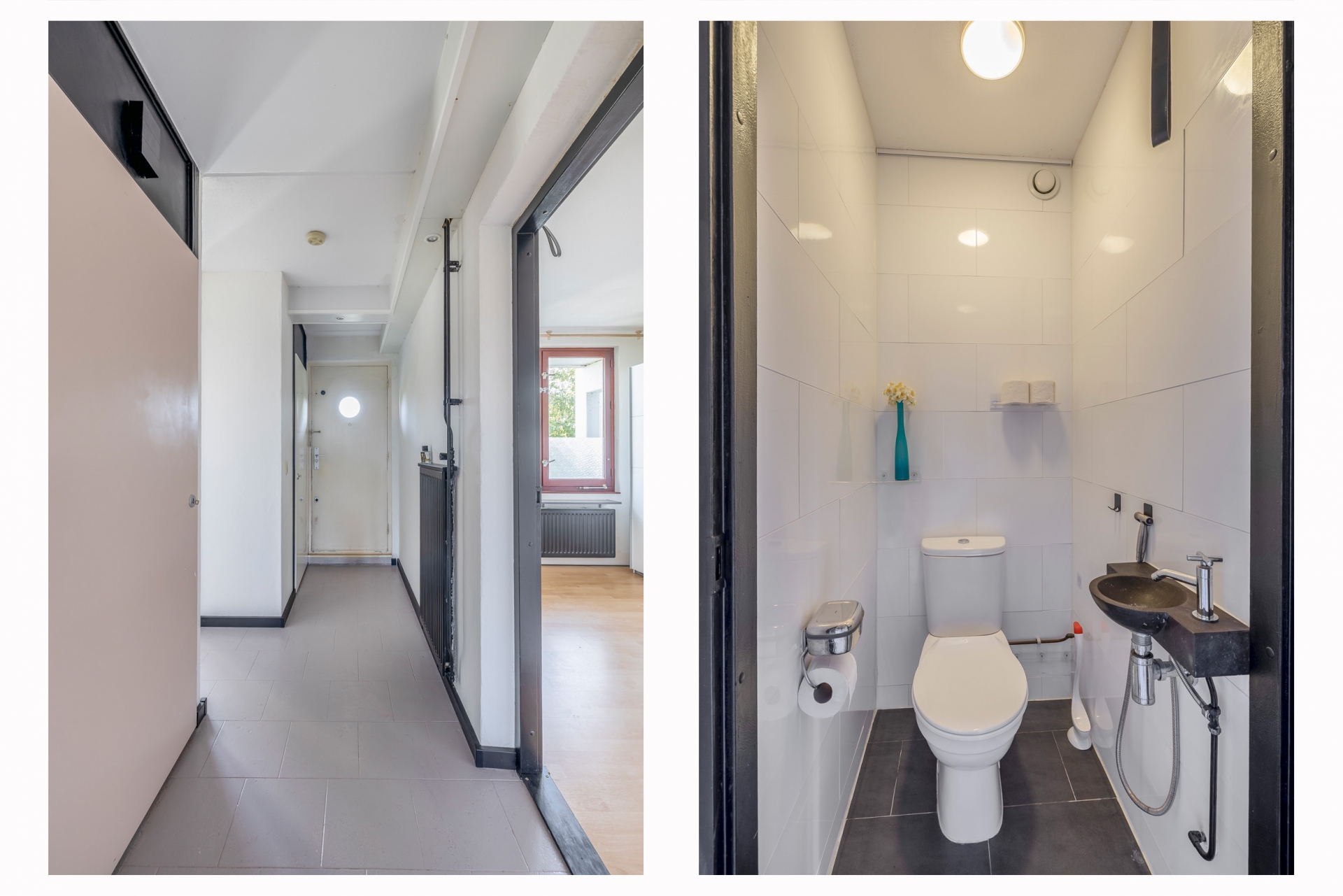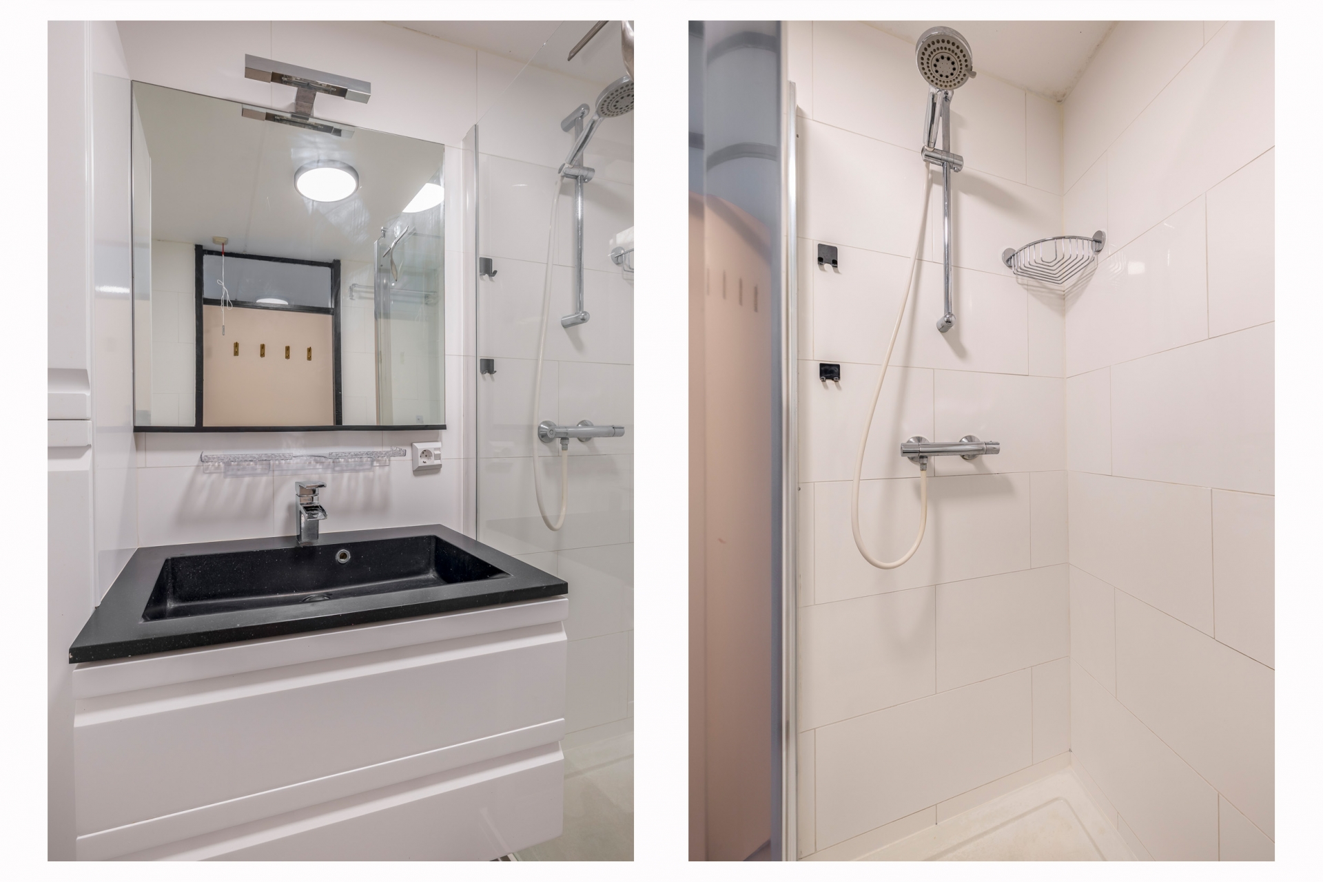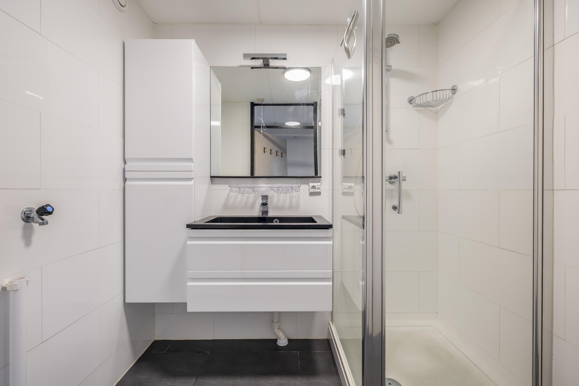 De badkamer en het toilet zijn in 2016 gemoderniseerd en praktisch ingericht met een inloopdouche, breed wastafelmeubel, en aansluitingen voor een wasmachine en een droger. Alles strak en net afgewerkt met wit tegelwerk en een donkere tegelvloer.