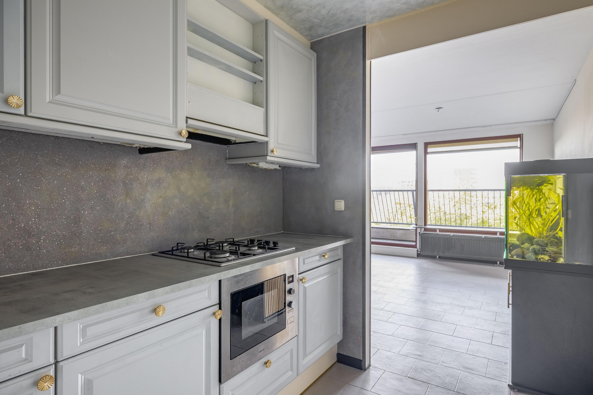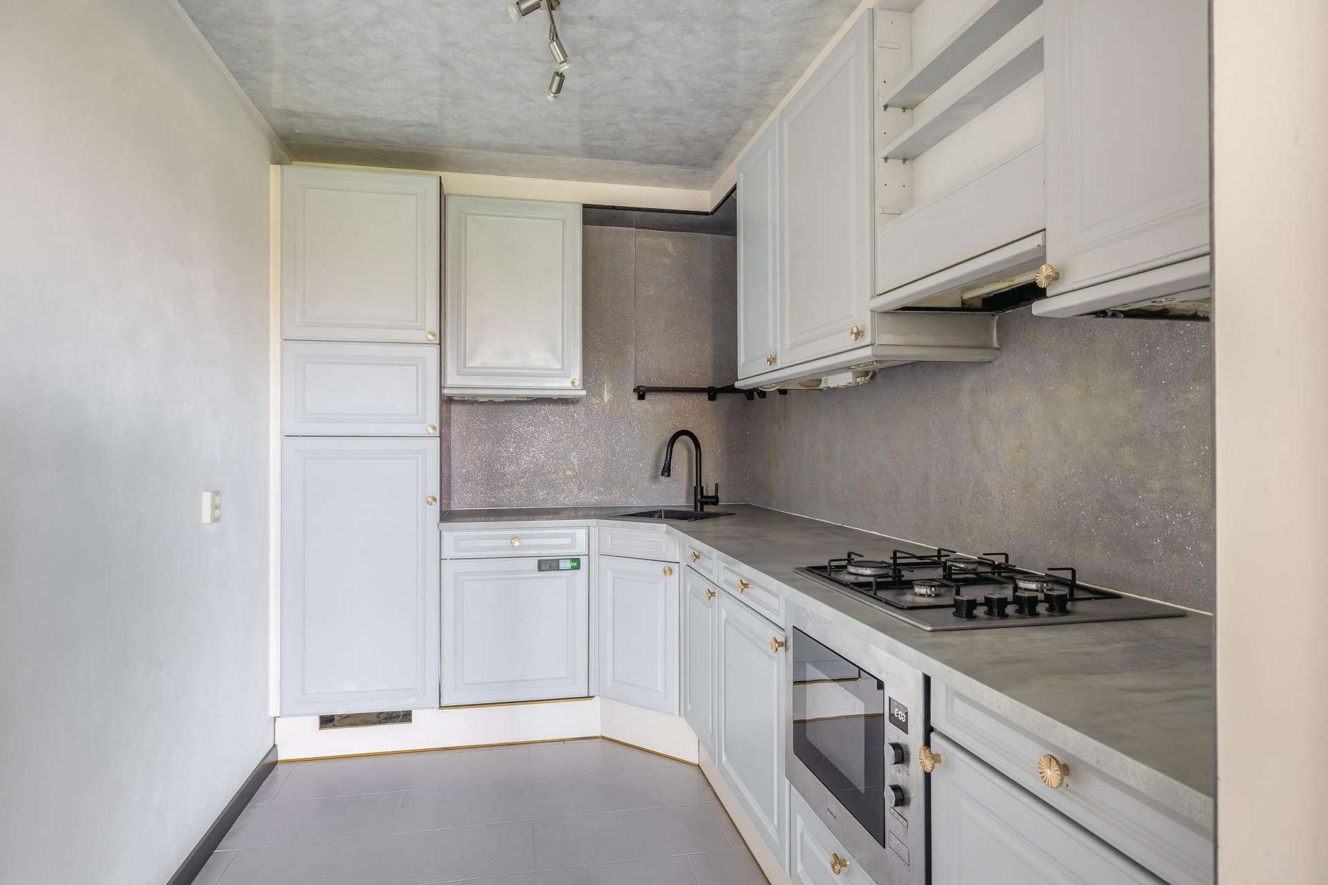 De keuken heeft een klassieke uitstraling met lichtgrijze fronten en een hoekopstelling die veel werk- en bergruimte biedt. Compleet met werkblad (2024), gaskookplaat (2024), combi-oven/magnetron, vaatwasser en koel-/vriescombinatie. De keuken heeft een open verbinding met de woonkamer (voor genoeg daglicht) en het balkon (voor evt. extra ventilatie).