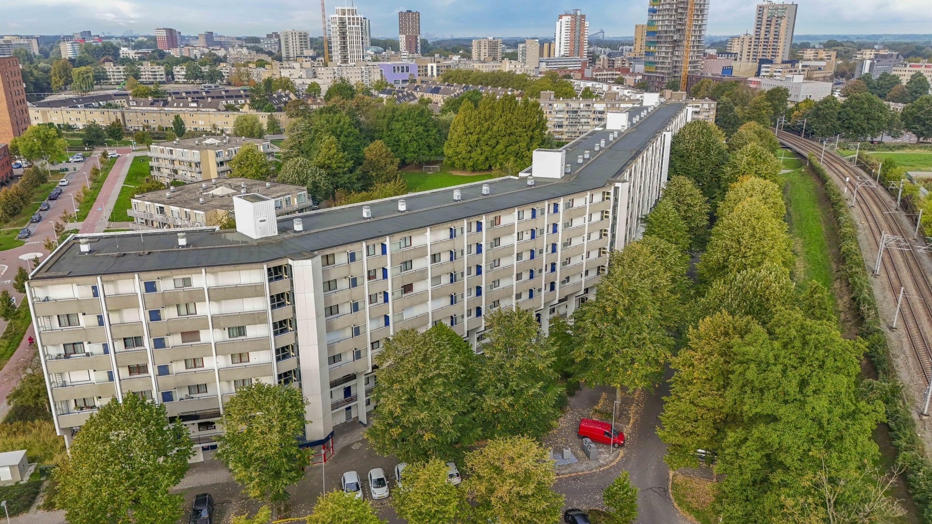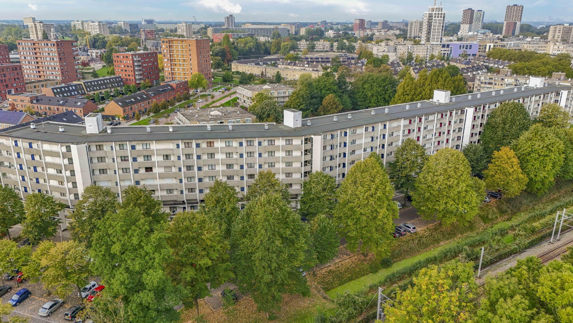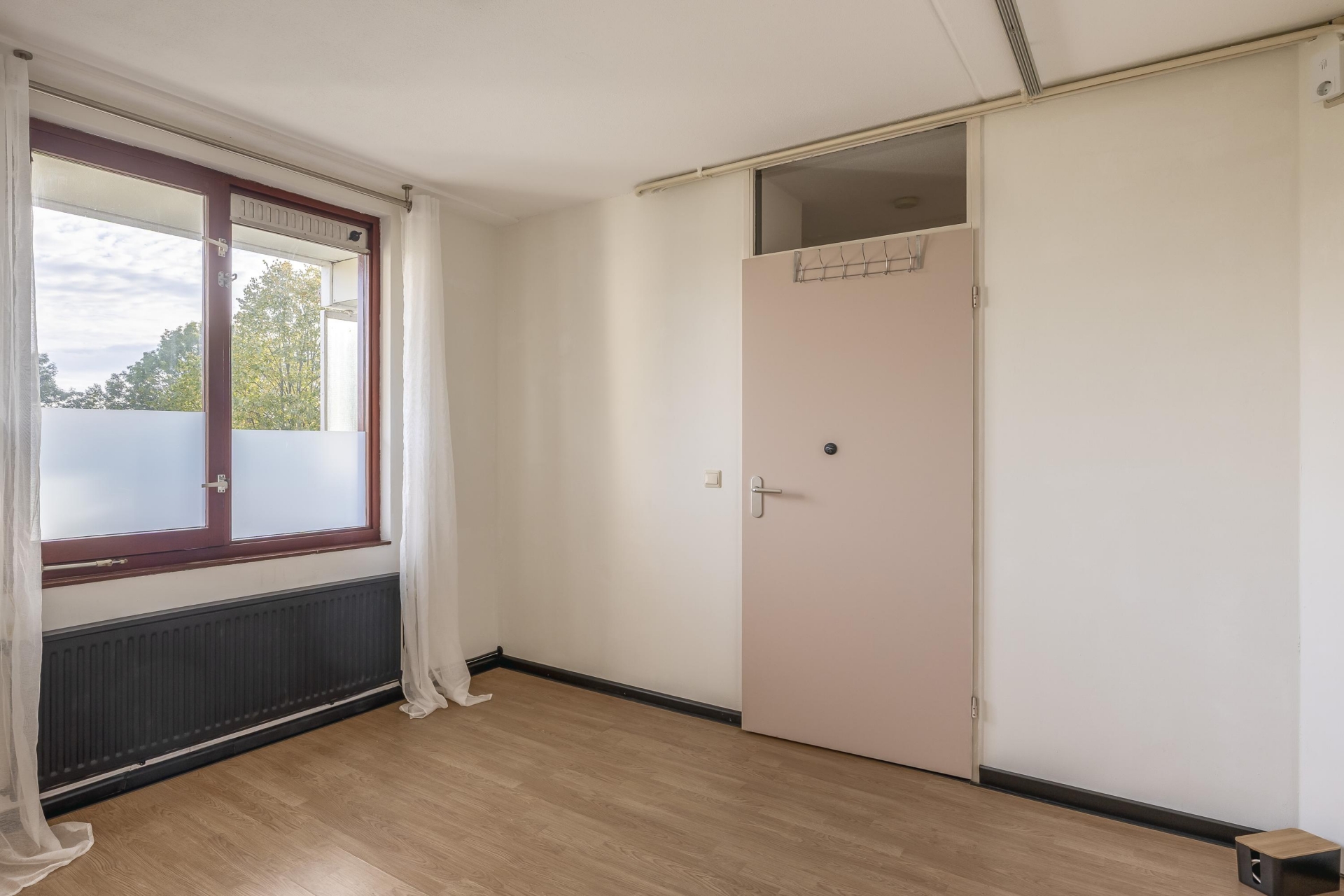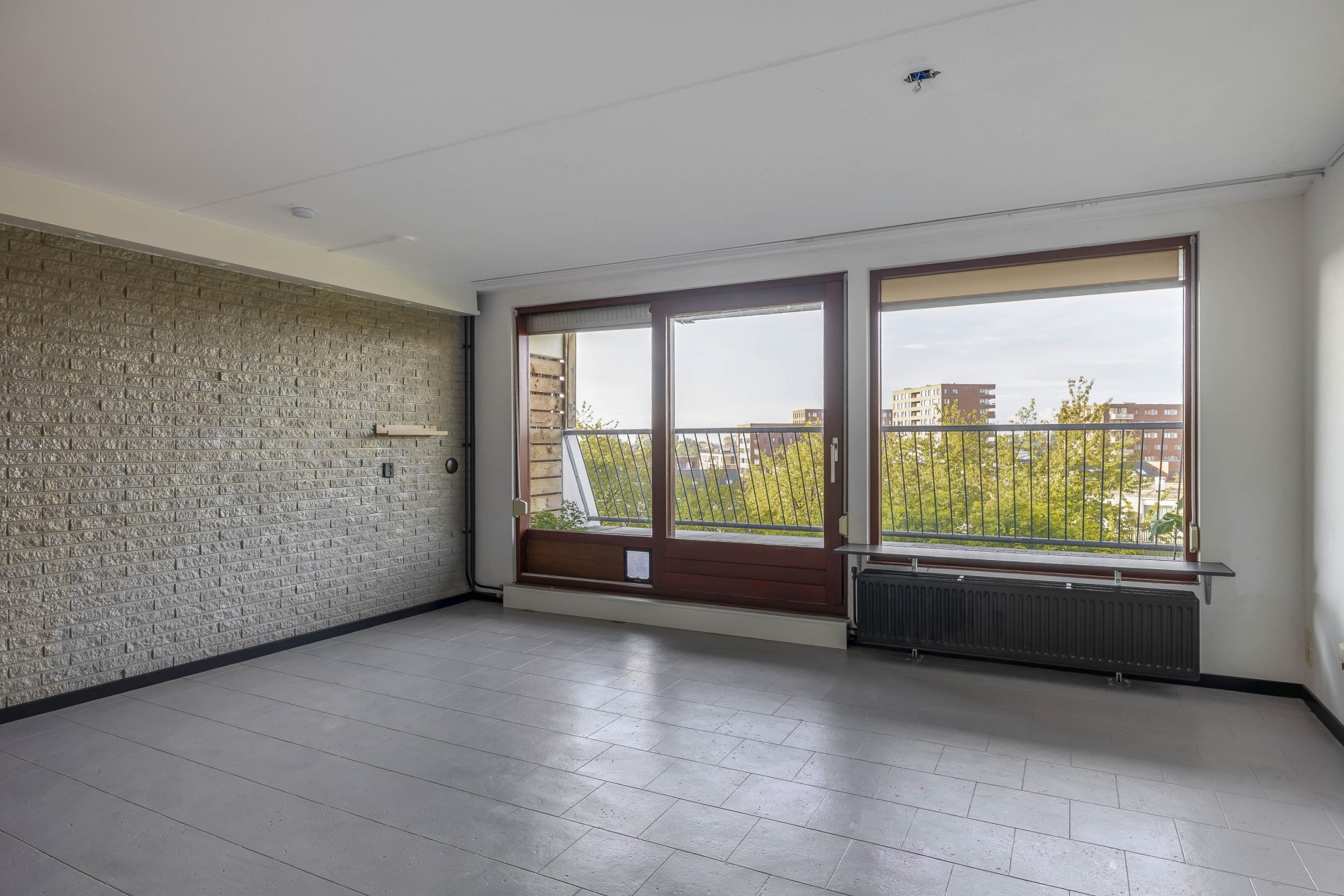 Zodra je de woonkamer binnenloopt valt het daglicht direct op: de grote raampartijen en schuifpui (schuifmechanisme vernieuwd in 2021) zorgen voor een open en aangenaam gevoel. De woonkamer van circa 24 m² sluit naadloos aan op het ruime balkon van ca. 12 m², waar je uitkijkt over het groen en de stadse skyline in de verte. Gelegen op het zuidwesten, dus perfect voor zonaanbidders! Liever iets minder zon in huis? Geen probleem, er zijn screens aanwezig.