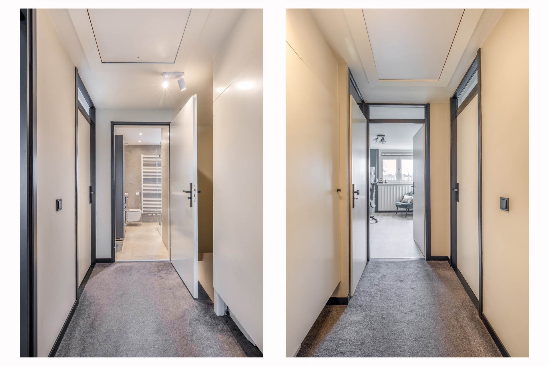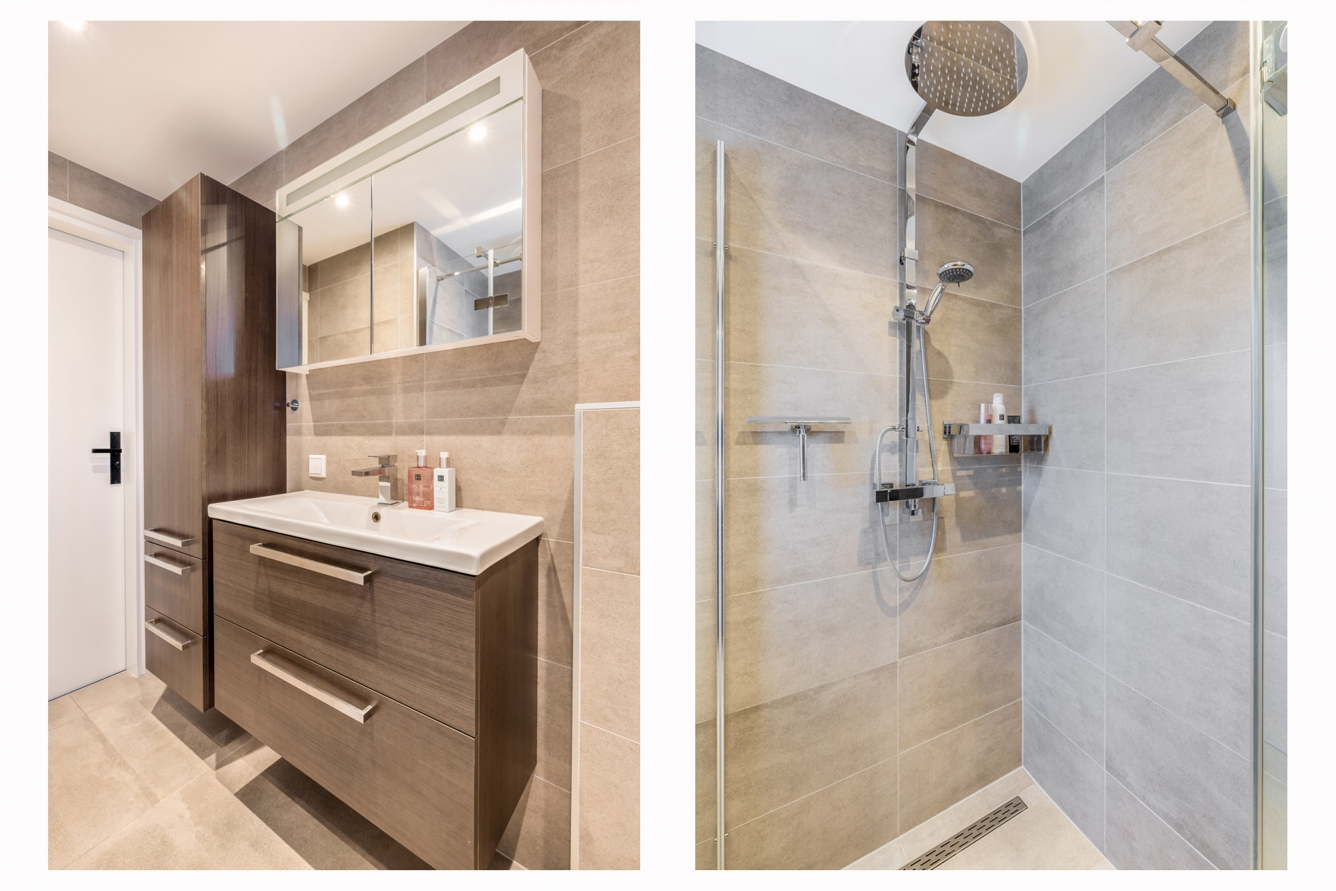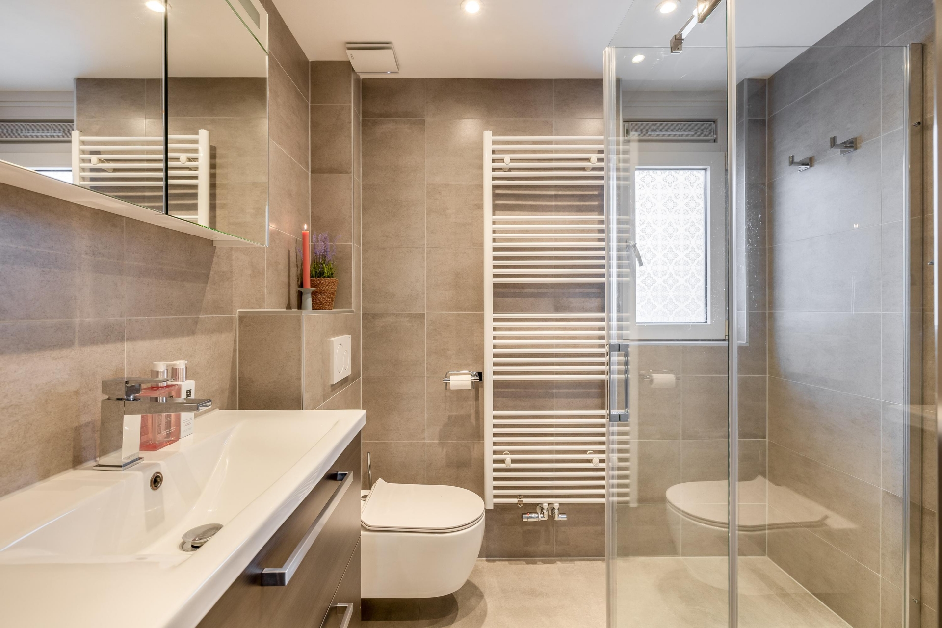 De badkamer is modern uitgevoerd met een inloopdouche, wastafelmeubel, toilet en designradiator. De neutrale tegelkeuze zorgt voor een rustige uitstraling en maakt het geheel tijdloos.
