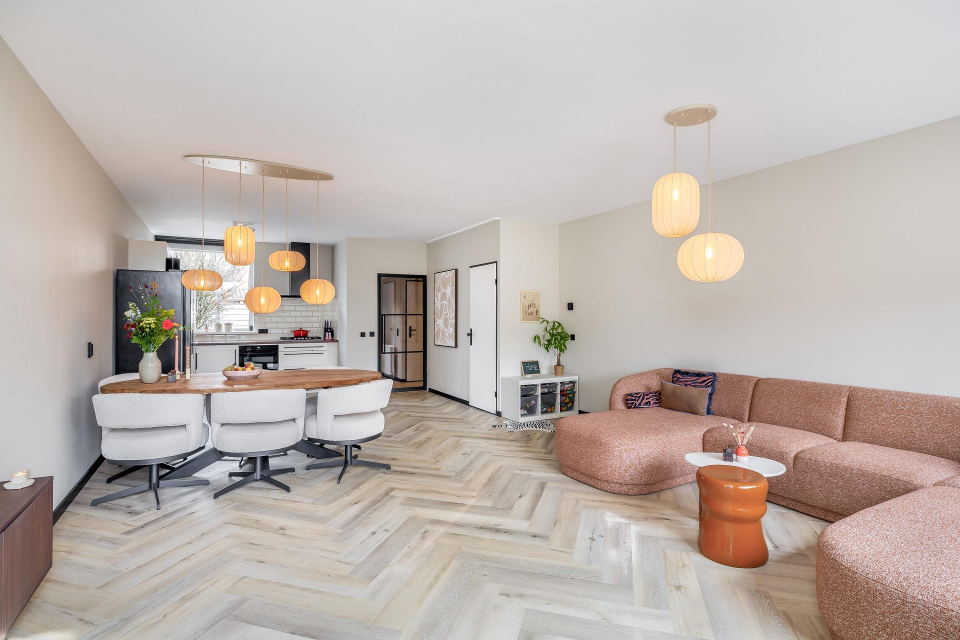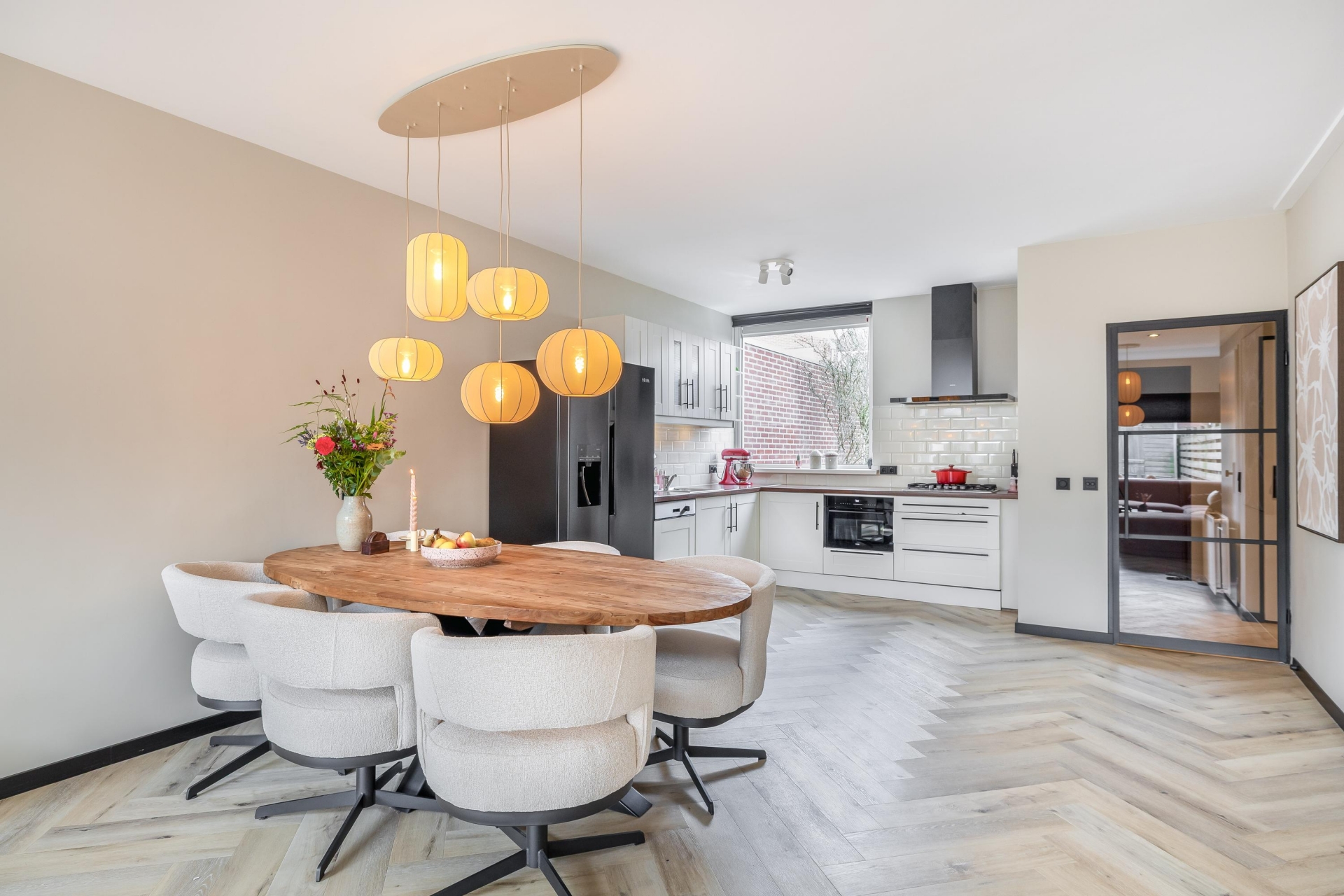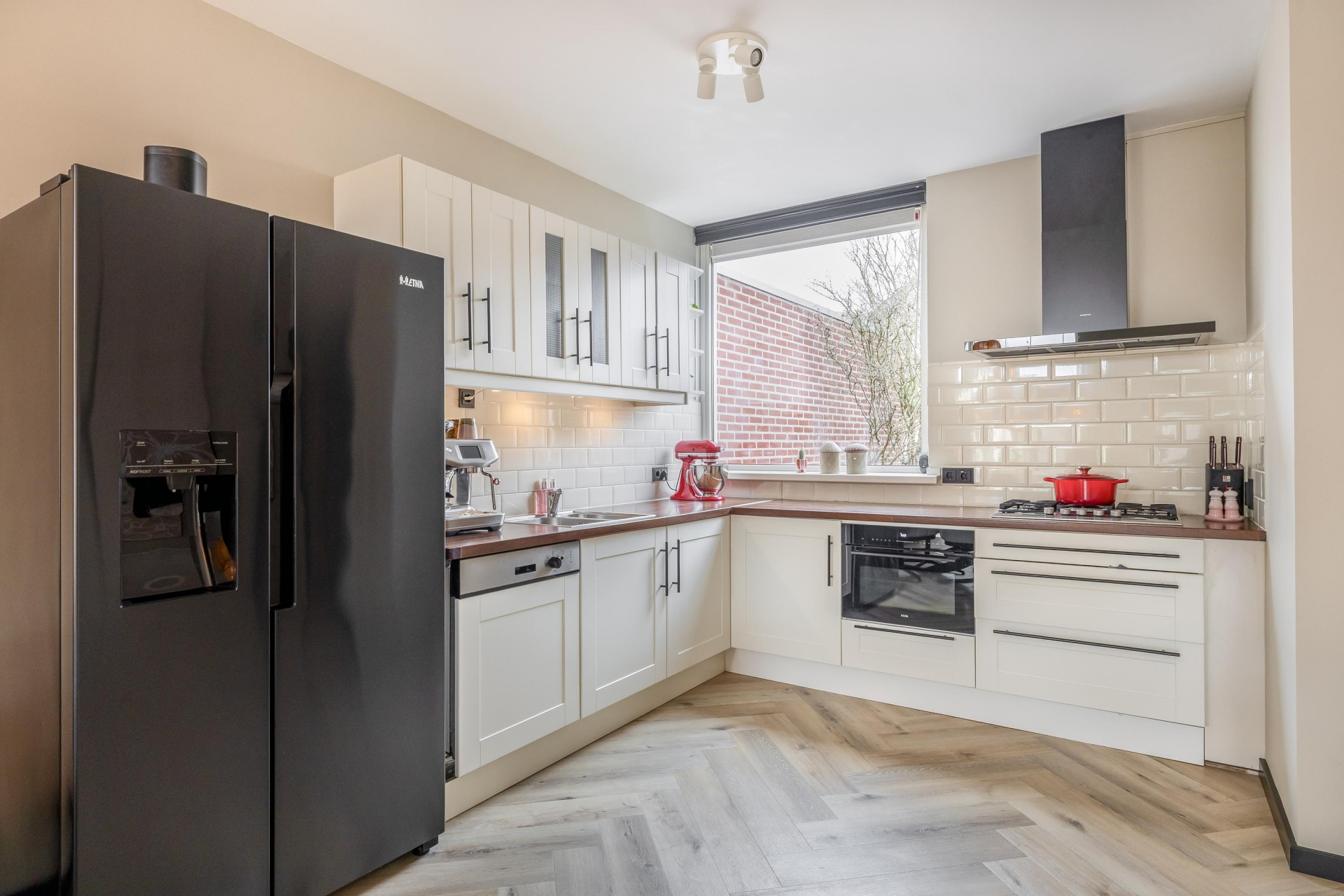 De woonkamer is ruim opgezet en heeft dankzij de grote raampartijen aan zowel voor als achterzijde een mooie lichtinval. De moderne visgraatvloer geeft het geheel een warme en eigentijdse uitstraling. Extra comfortabel: in de woonkamer en keuken is recent vloerverwarming aangelegd. Dat zorgt niet alleen voor een aangename warmteverdeling, maar ook voor een strakke uitstraling zonder radiatoren in het zicht.