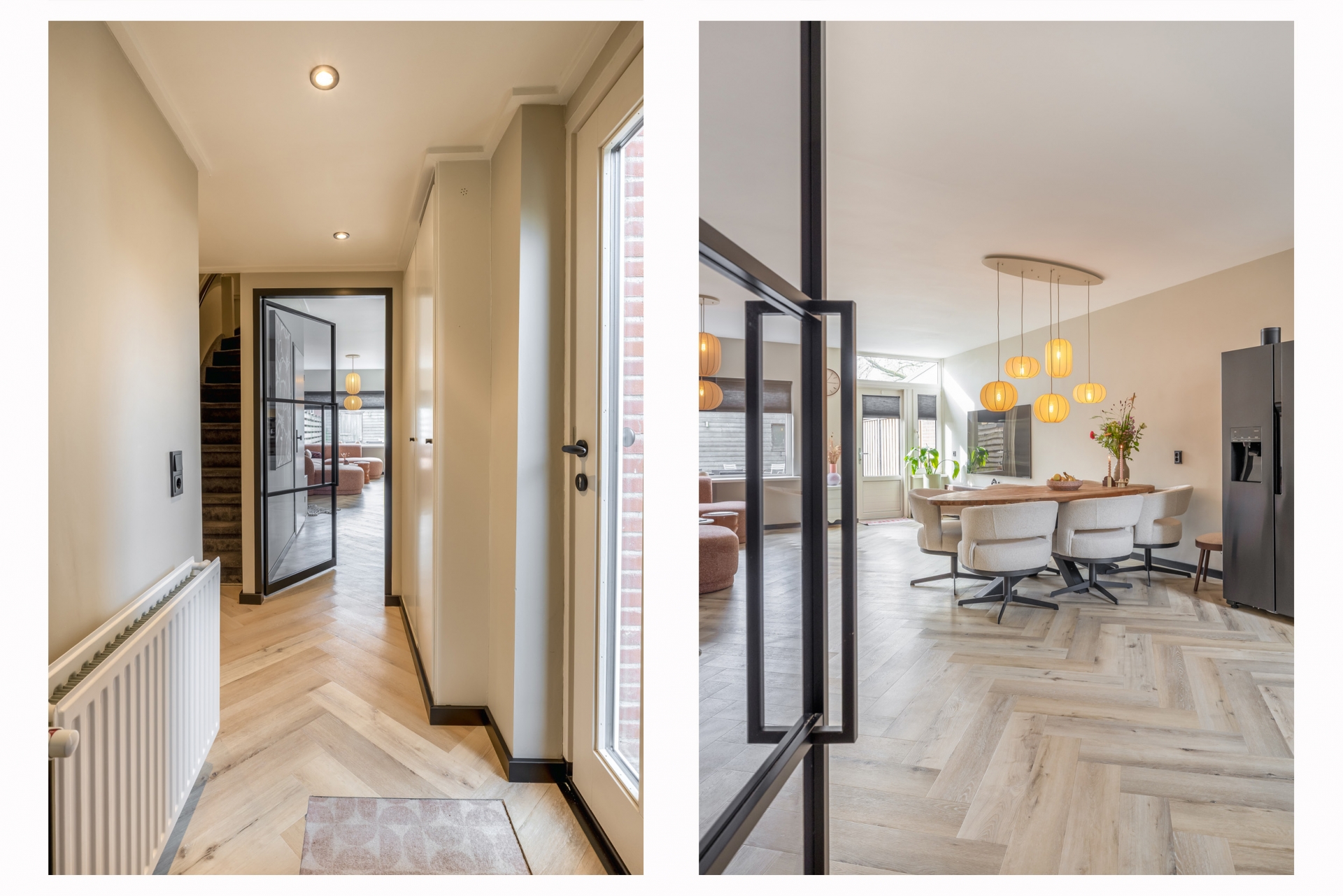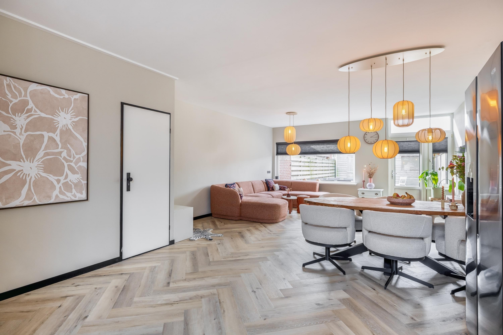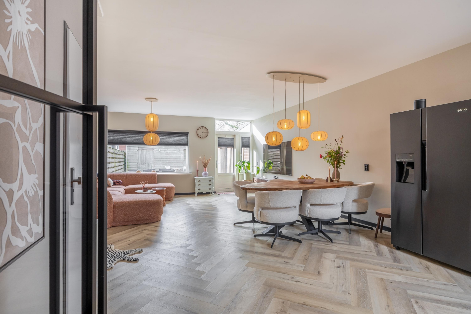 De woonkamer is ruim opgezet en heeft dankzij de grote raampartijen aan zowel voor als achterzijde een mooie lichtinval. De moderne visgraatvloer geeft het geheel een warme en eigentijdse uitstraling. Extra comfortabel: in de woonkamer en keuken is recent vloerverwarming aangelegd. Dat zorgt niet alleen voor een aangename warmteverdeling, maar ook voor een strakke uitstraling zonder radiatoren in het zicht.