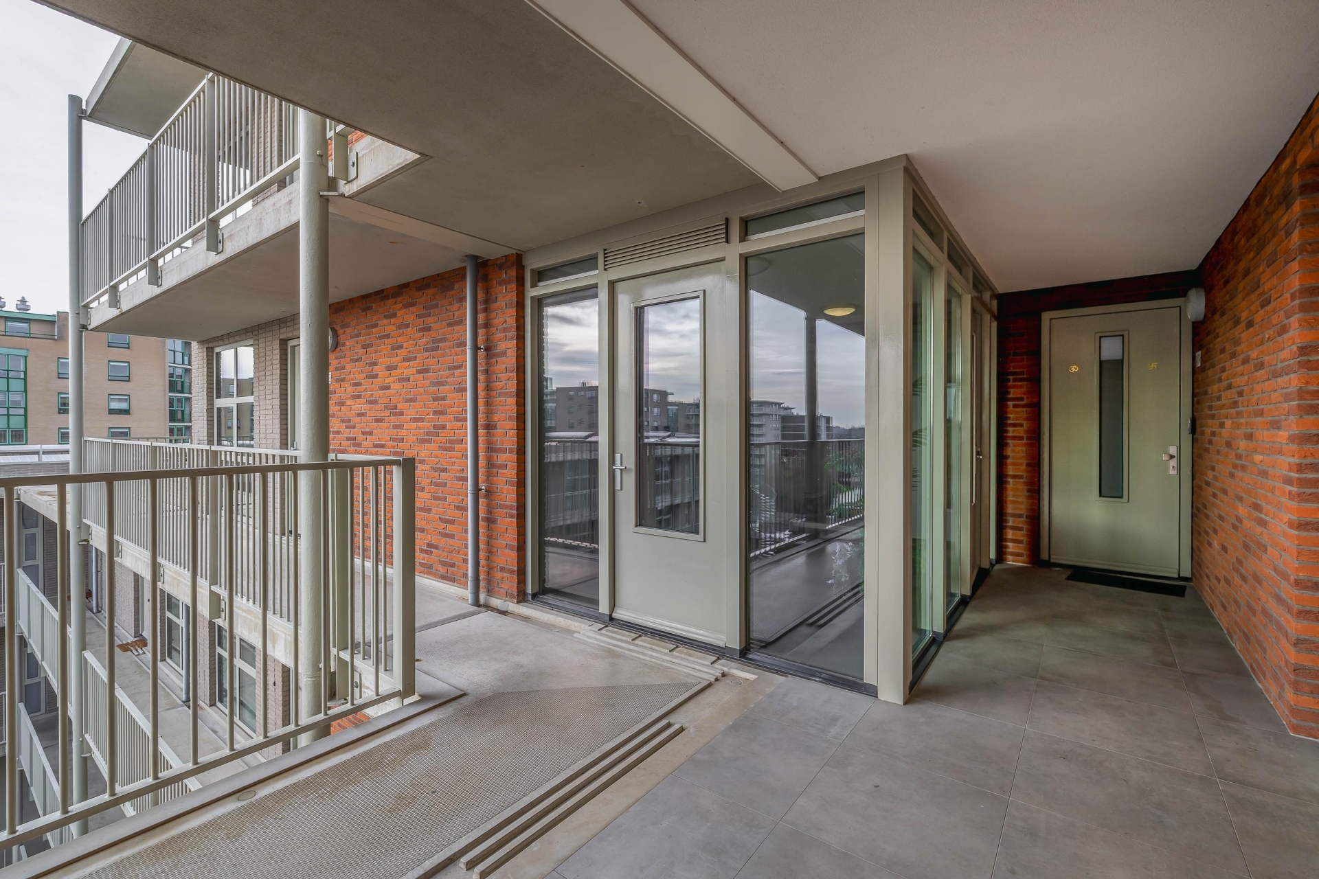 Afgesloten entree van het nieuwe moderne complex met bellentableau met videofooninstallatie en brievenbussen; ruime centrale hal met liftinstallatie.