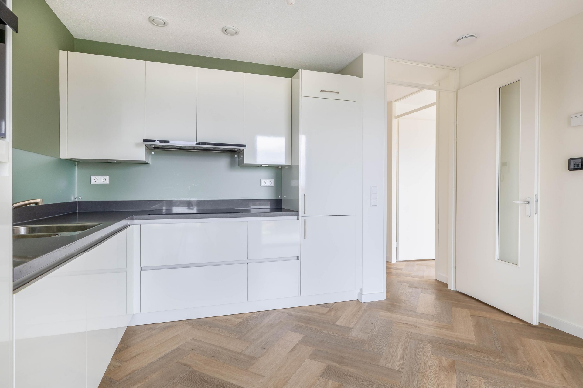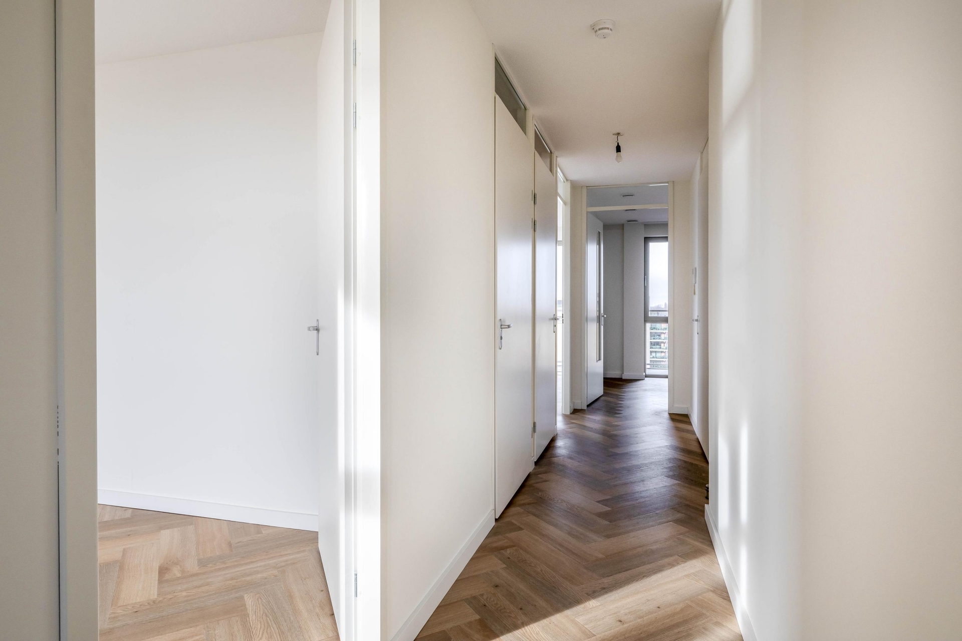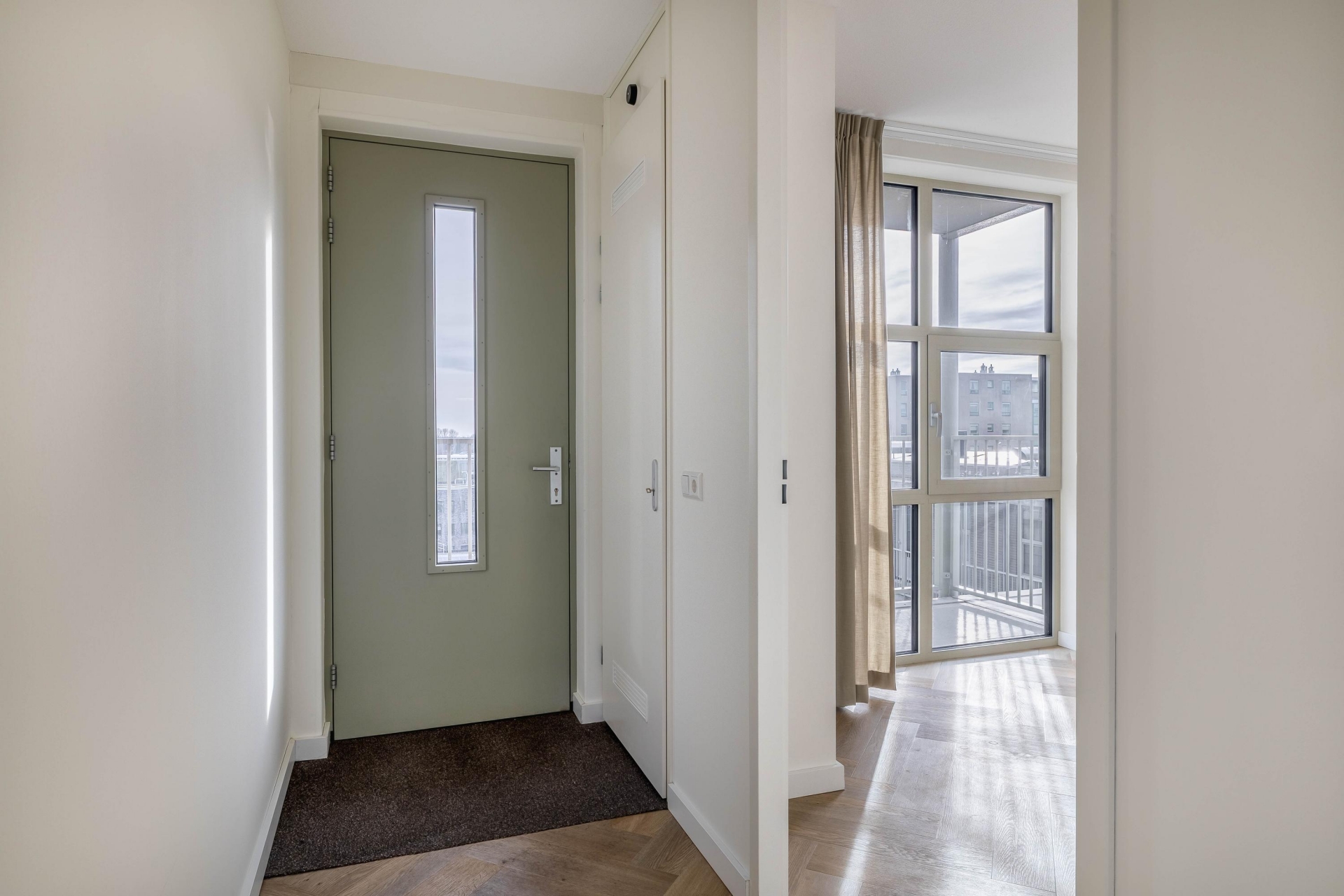 Entree/hal met de meterkast en toegang tot twee slaapkamers, het toilet, de badkamer, een inpandige berging en de woonkamer met open keuken. Het eerste wat opvalt bij binnenkomst is de PVC-visgraatvloer. Deze is als ware eyecatcher in het hele appartement doorgelegd. Er is vloerverwarming aanwezig met mogelijkheid om te koelen.