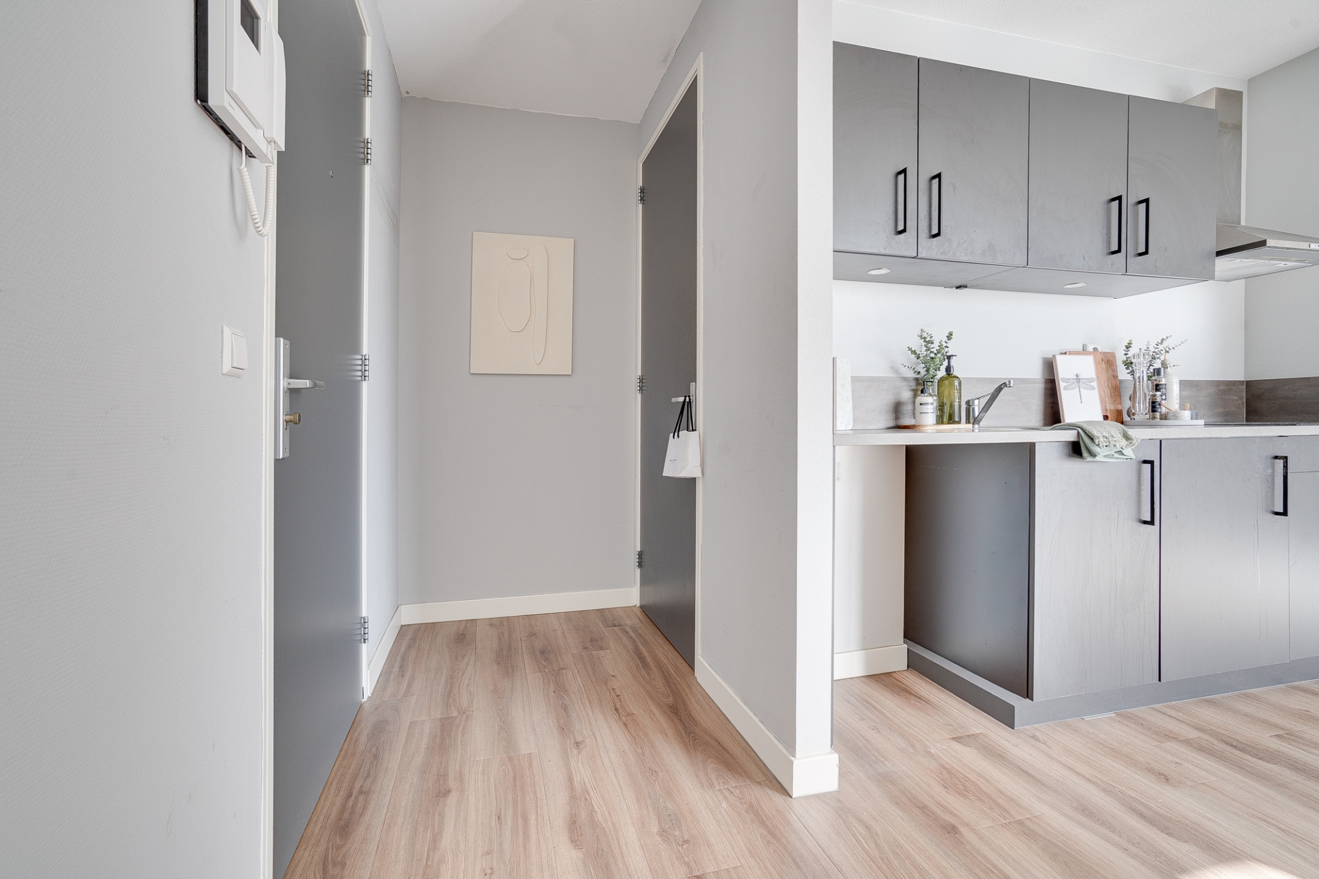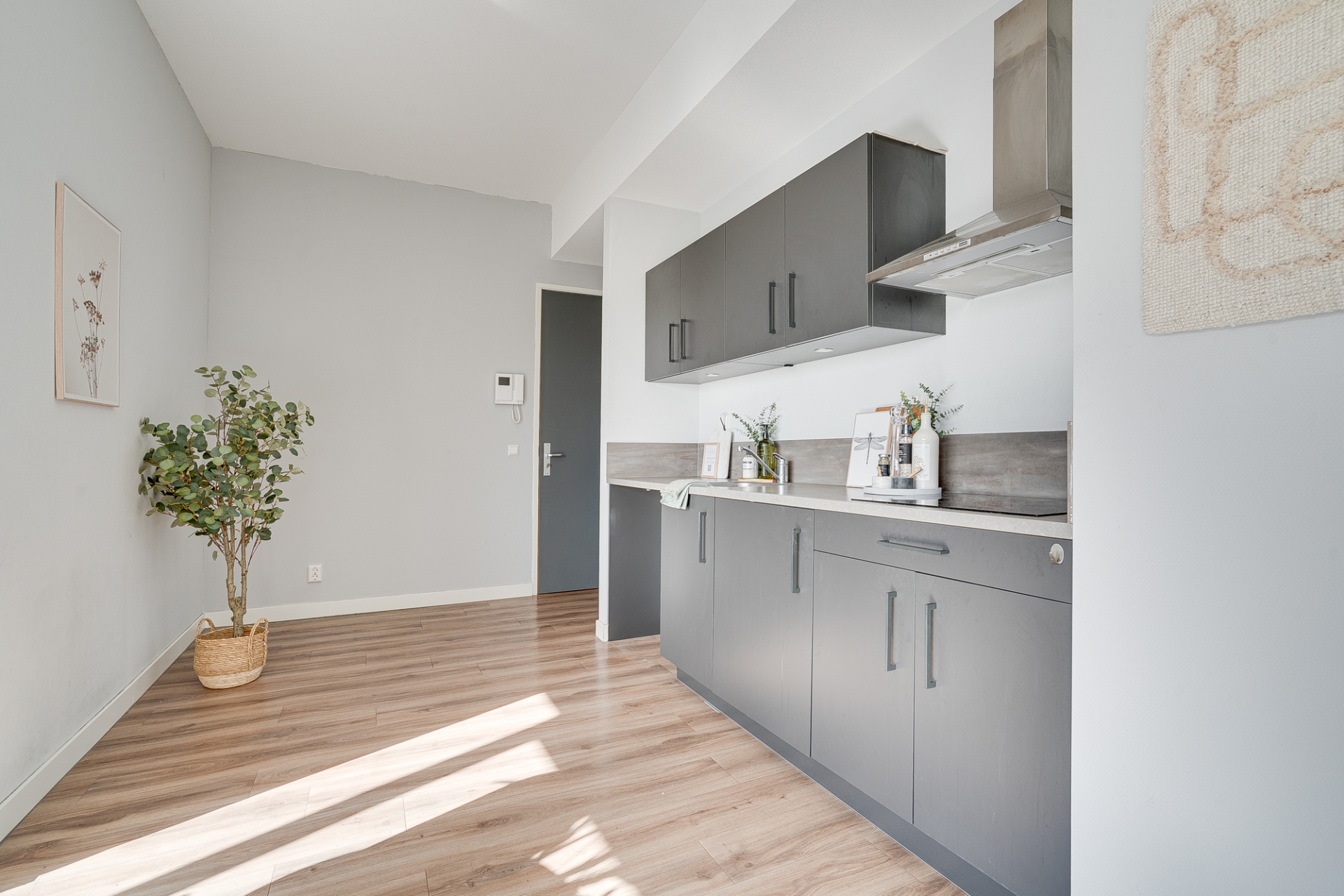 Het appartement zelf is strak afgewerkt en klaar om direct te betrekken. De stijlvolle pvc vloer loopt door de hele woning en zorgt voor een moderne uitstraling. De keuken is volledig uitgerust met een koelkast met vriesvak, een inductiekookplaat, een rvs afzuigkap en praktische bovenkastjes voor al je keukengerei. De studio is voorzien van een douche en een wastafel. Er is een apart toilet met fontein.