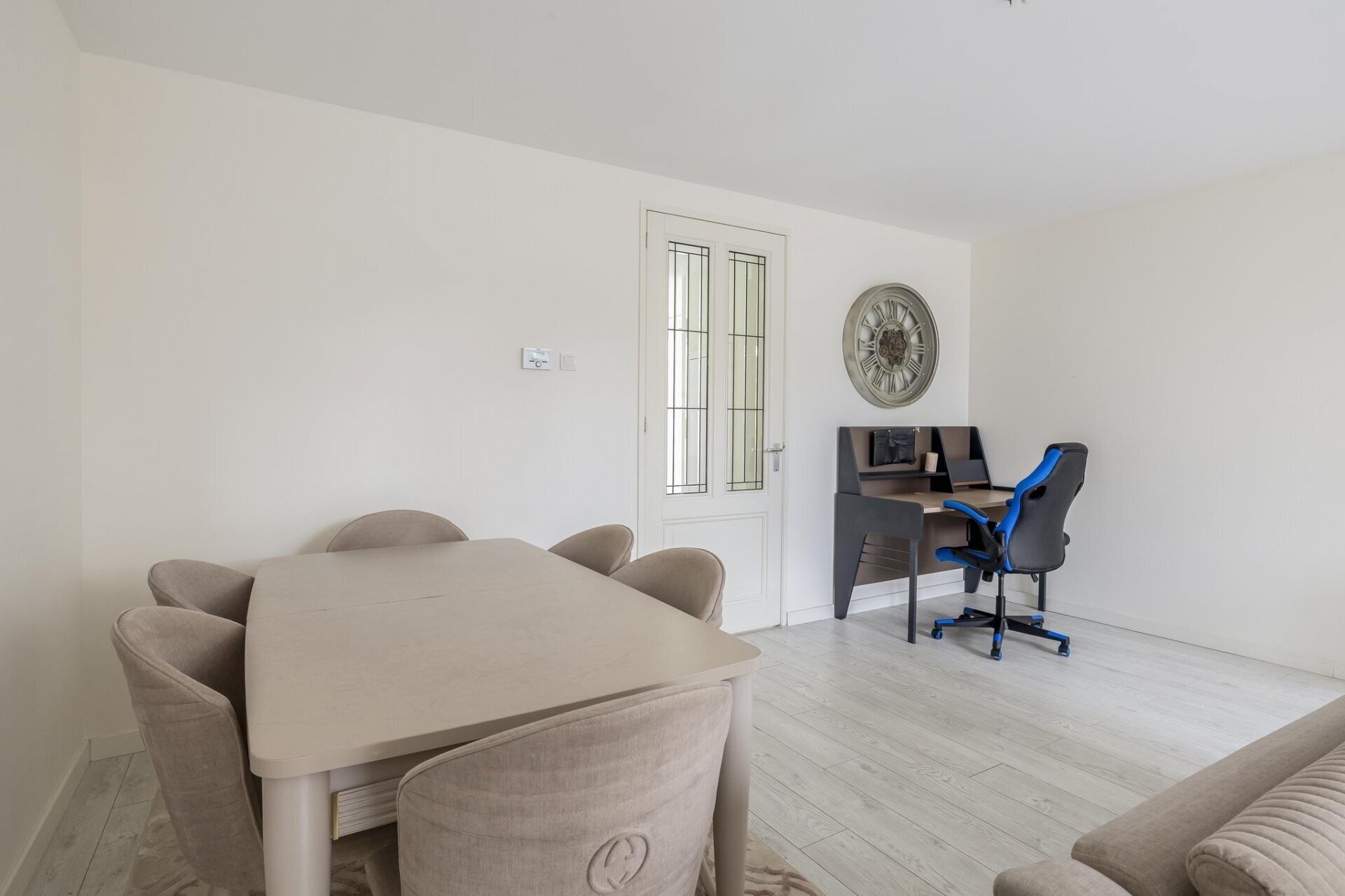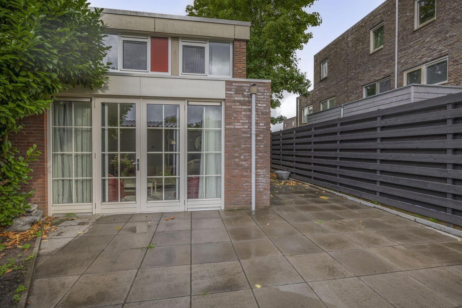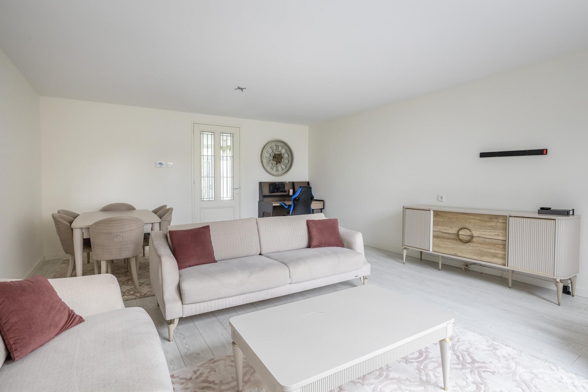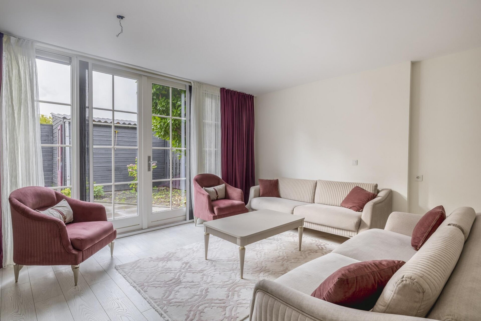 Zodra je binnenkomt valt meteen de open sfeer op. De woonkamer is aan de achterzijde uitgebouwd, wat niet alleen extra ruimte oplevert, maar ook zorgt voor veel lichtinval dankzij de grote openslaande deuren. De wanden zijn strak gestuukt en de vloer is neutraal afgewerkt, waardoor je alleen nog maar je meubels hoeft neer te zetten. De tuin is via de achterzijde direct bereikbaar en vormt een verlengstuk van je leefruimte: ideaal voor zonnige dagen.