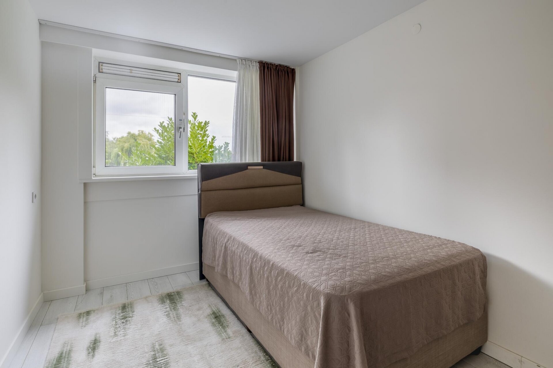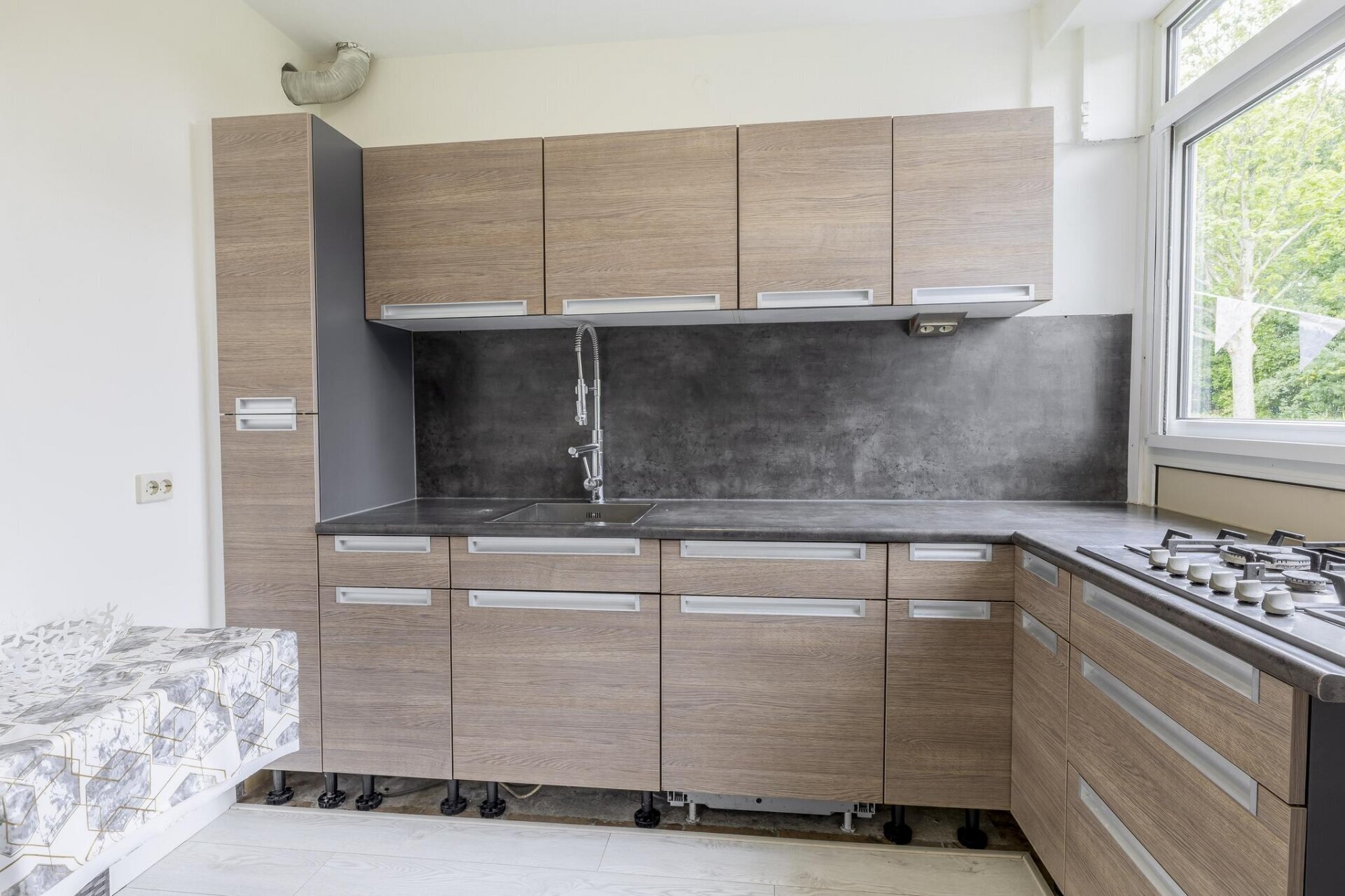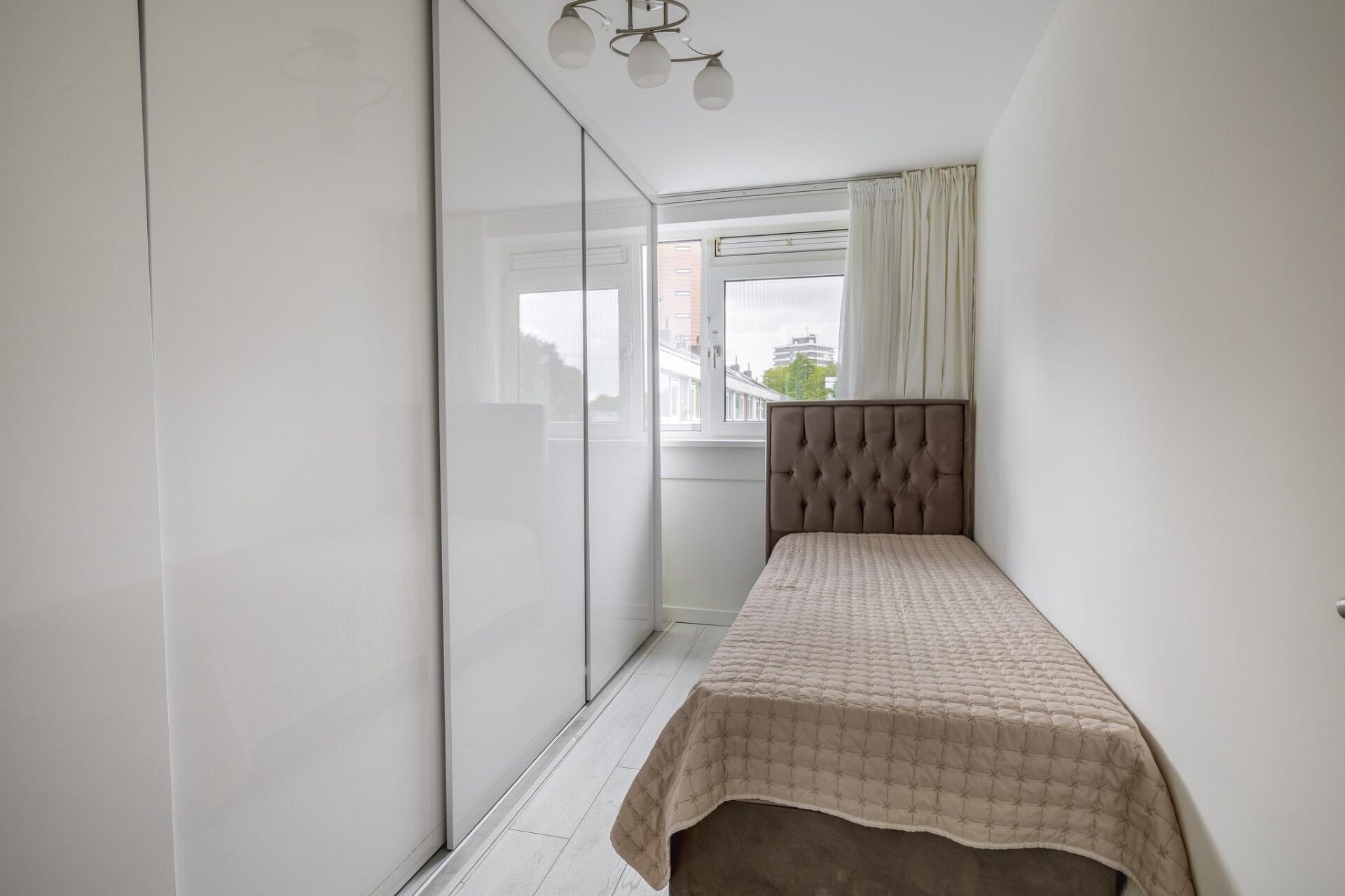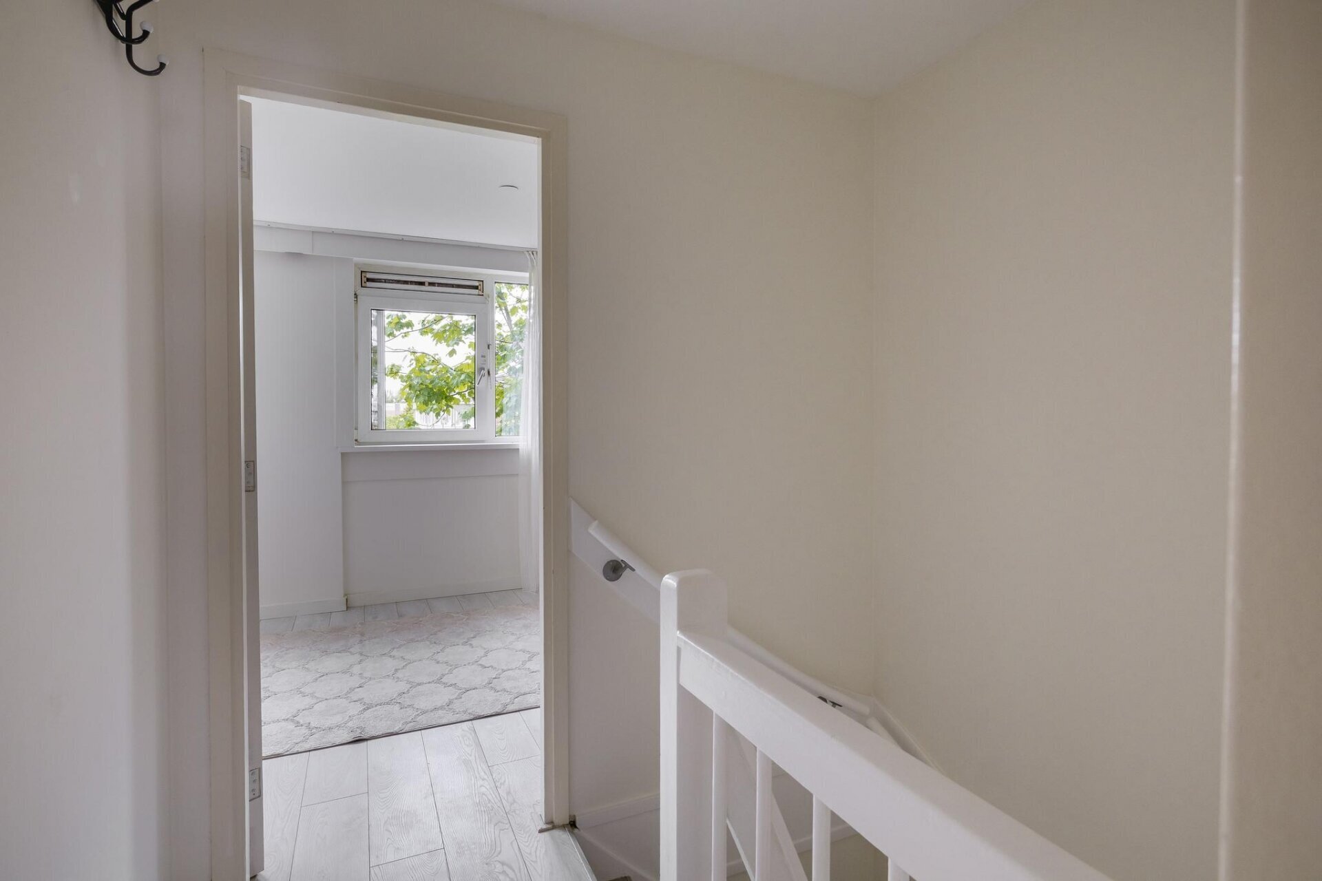 Zodra je binnenkomt valt meteen de open sfeer op. De woonkamer is aan de achterzijde uitgebouwd, wat niet alleen extra ruimte oplevert, maar ook zorgt voor veel lichtinval dankzij de grote openslaande deuren. De wanden zijn strak gestuukt en de vloer is neutraal afgewerkt, waardoor je alleen nog maar je meubels hoeft neer te zetten. De tuin is via de achterzijde direct bereikbaar en vormt een verlengstuk van je leefruimte: ideaal voor zonnige dagen.