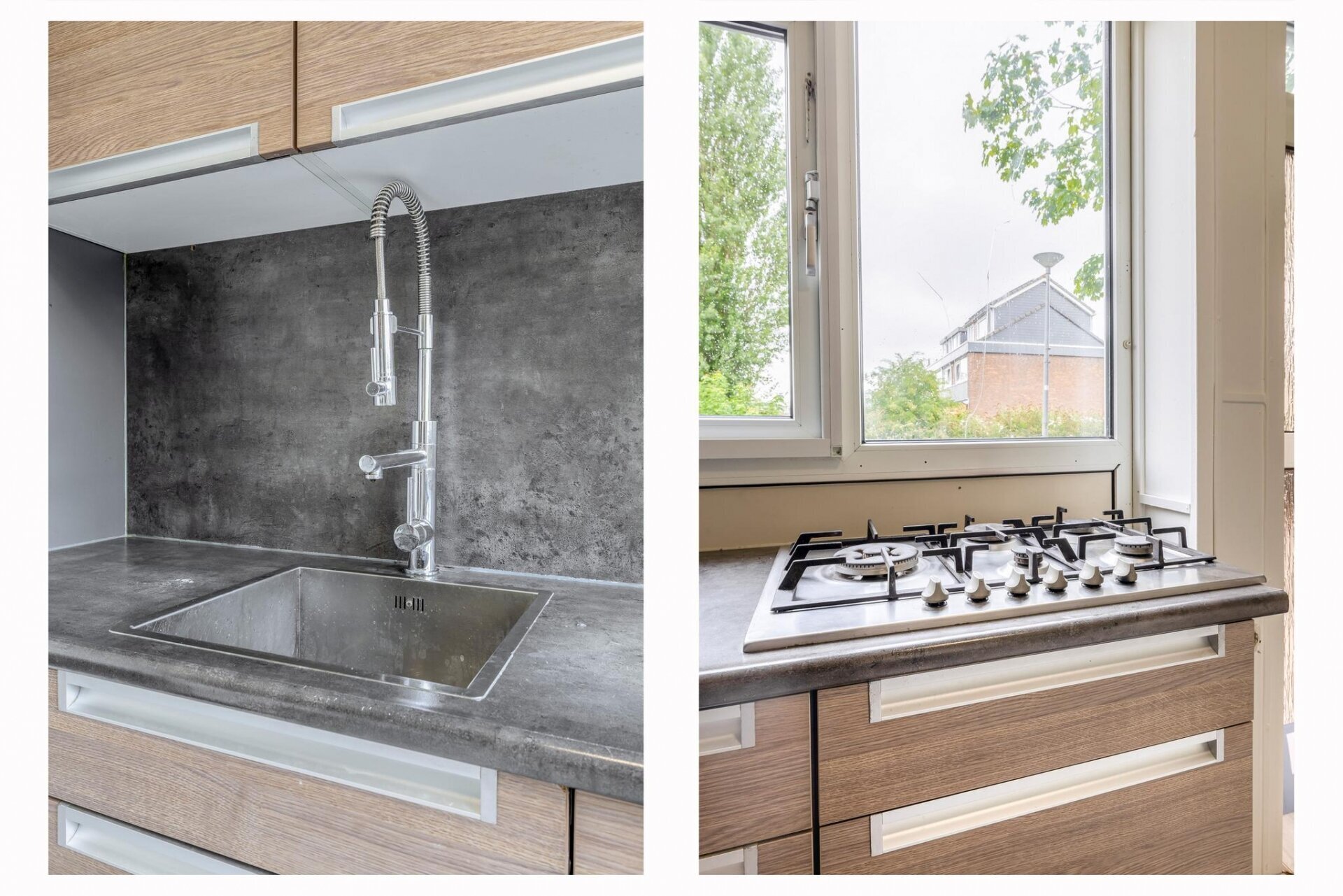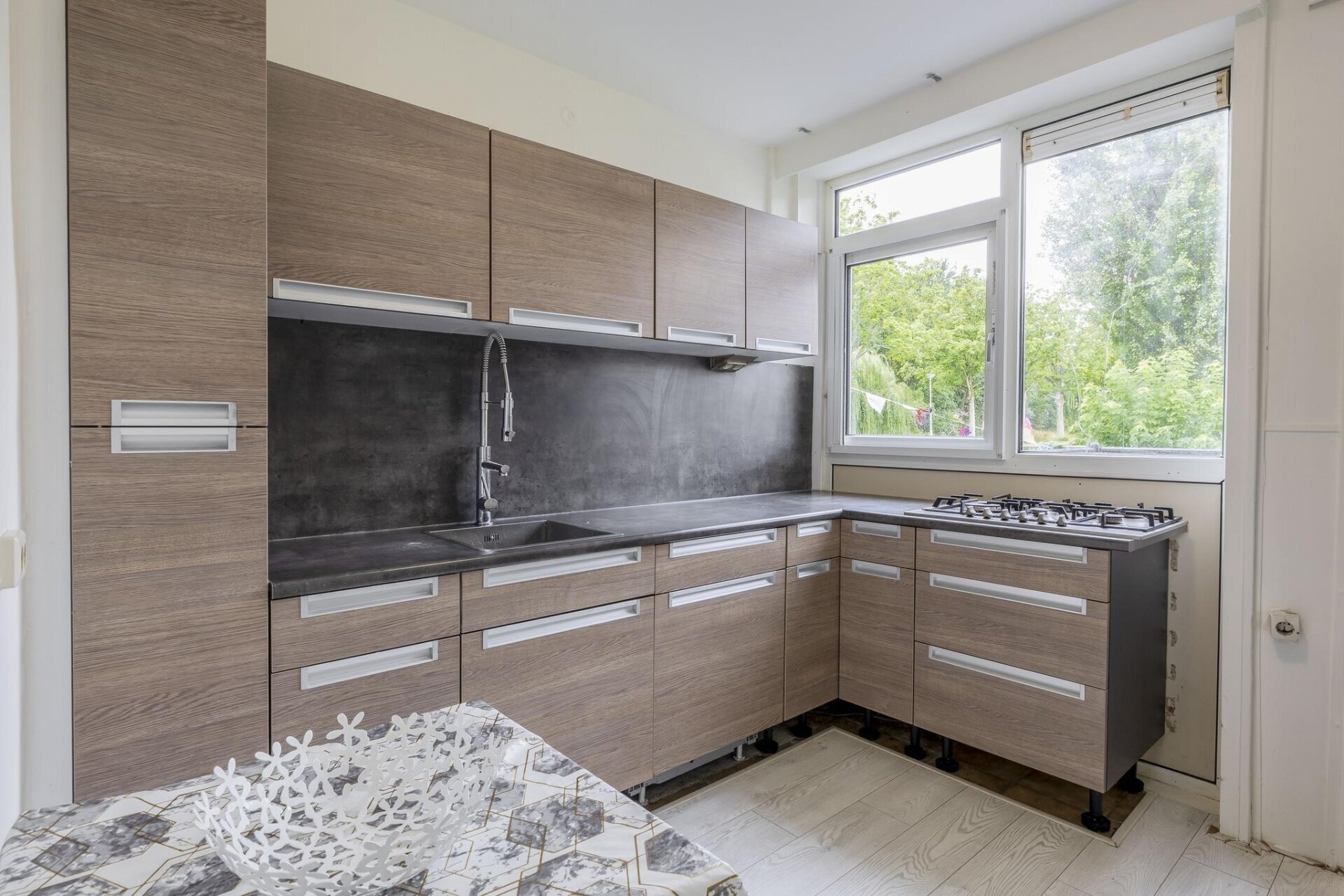 De keuken is netjes en praktisch ingericht, met voldoende werk- en bergruimte. Door de indeling kun je hier prima uitgebreid koken zonder in te leveren op gezelligheid met je gezelschap.