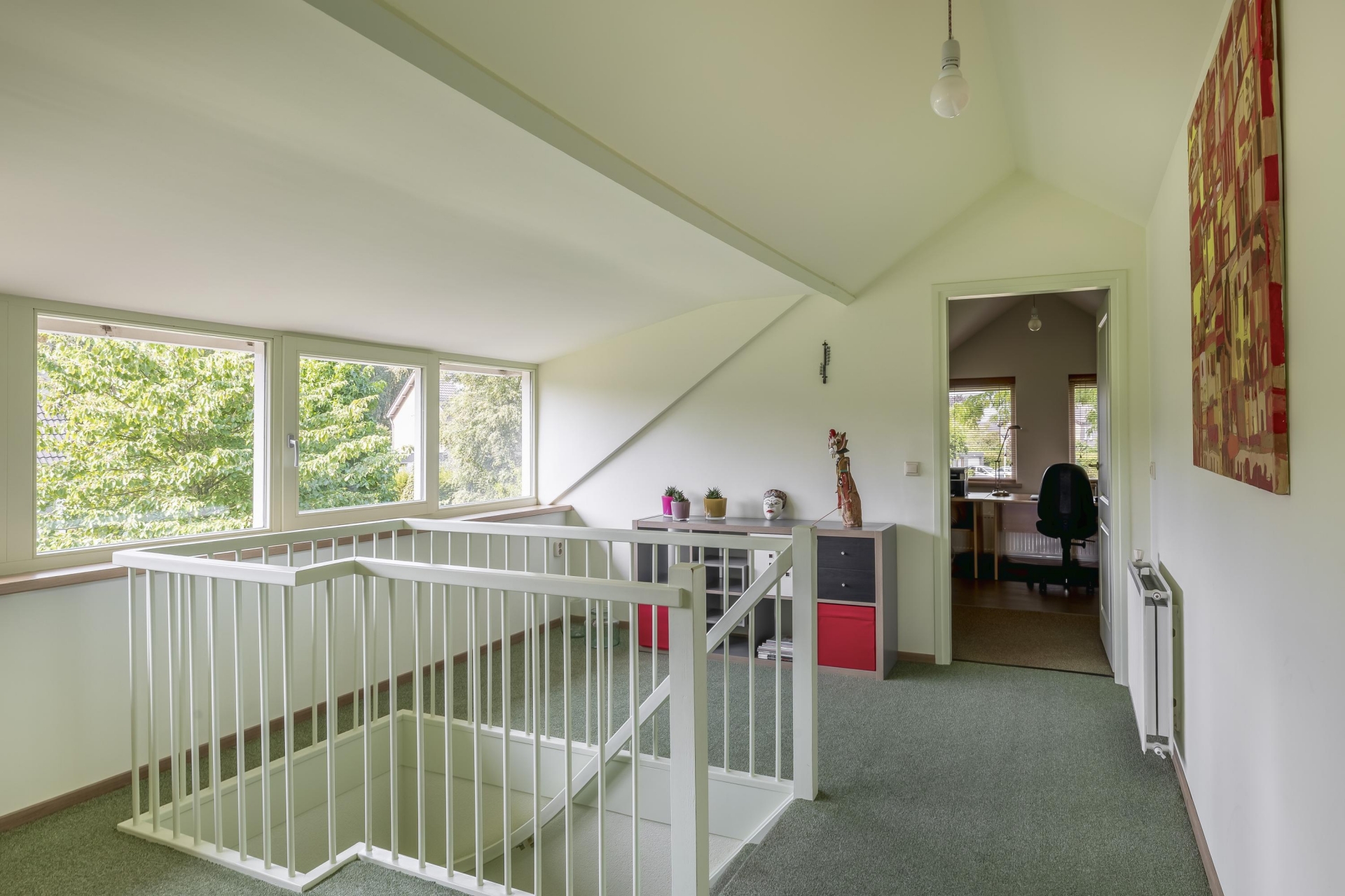 Stap je de woonkamer binnen, dan valt meteen op hoeveel daglicht er binnenkomt. Dankzij de grote ramen en het groene uitzicht rondom voelt het hier licht en open. De ruimte is royaal opgezet en geeft je genoeg plek voor zowel een gezellige zithoek als een grote eettafel. Vanuit meerdere kanten kijk je uit op het groen en de tuin, wat het binnen-buiten gevoel versterkt.