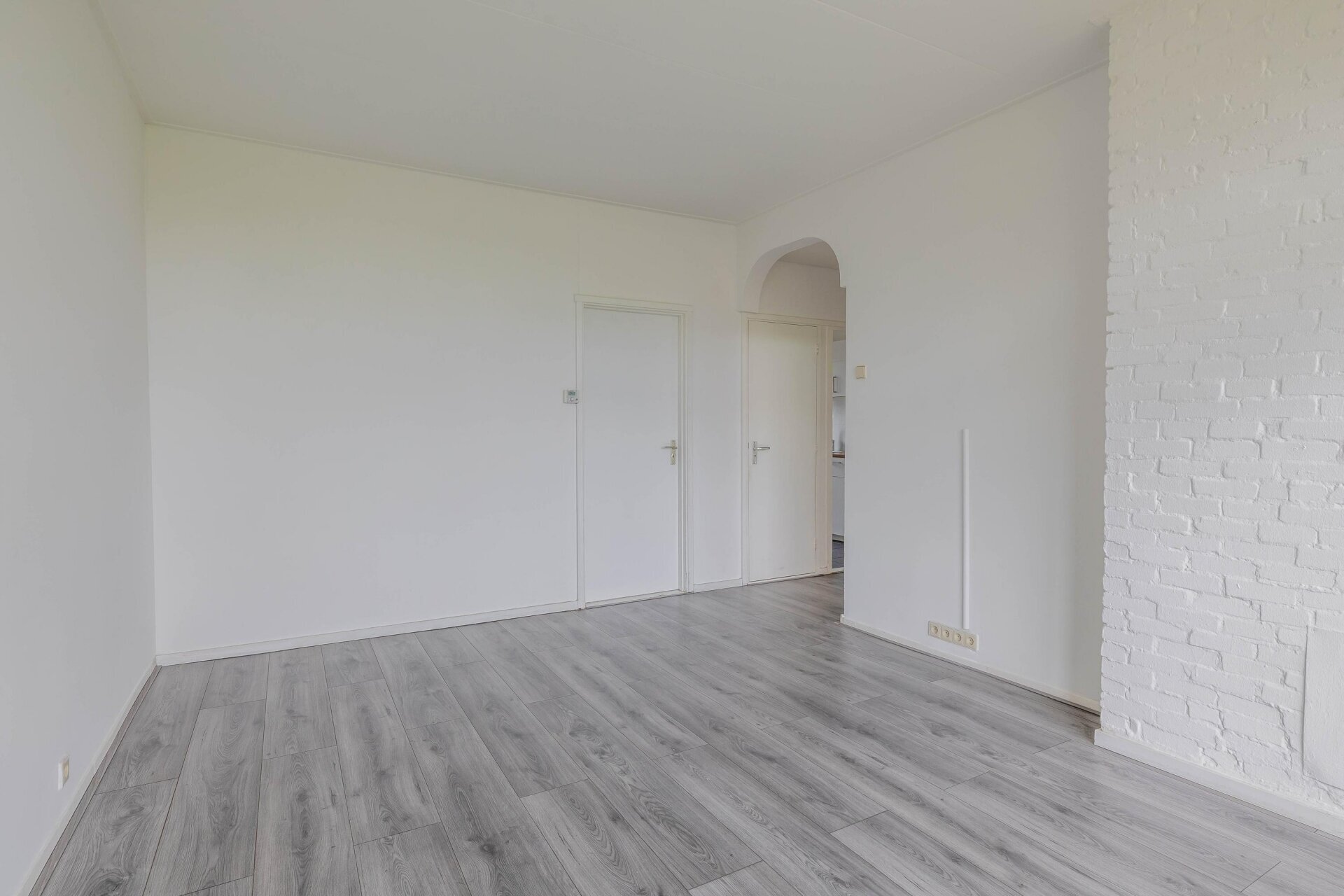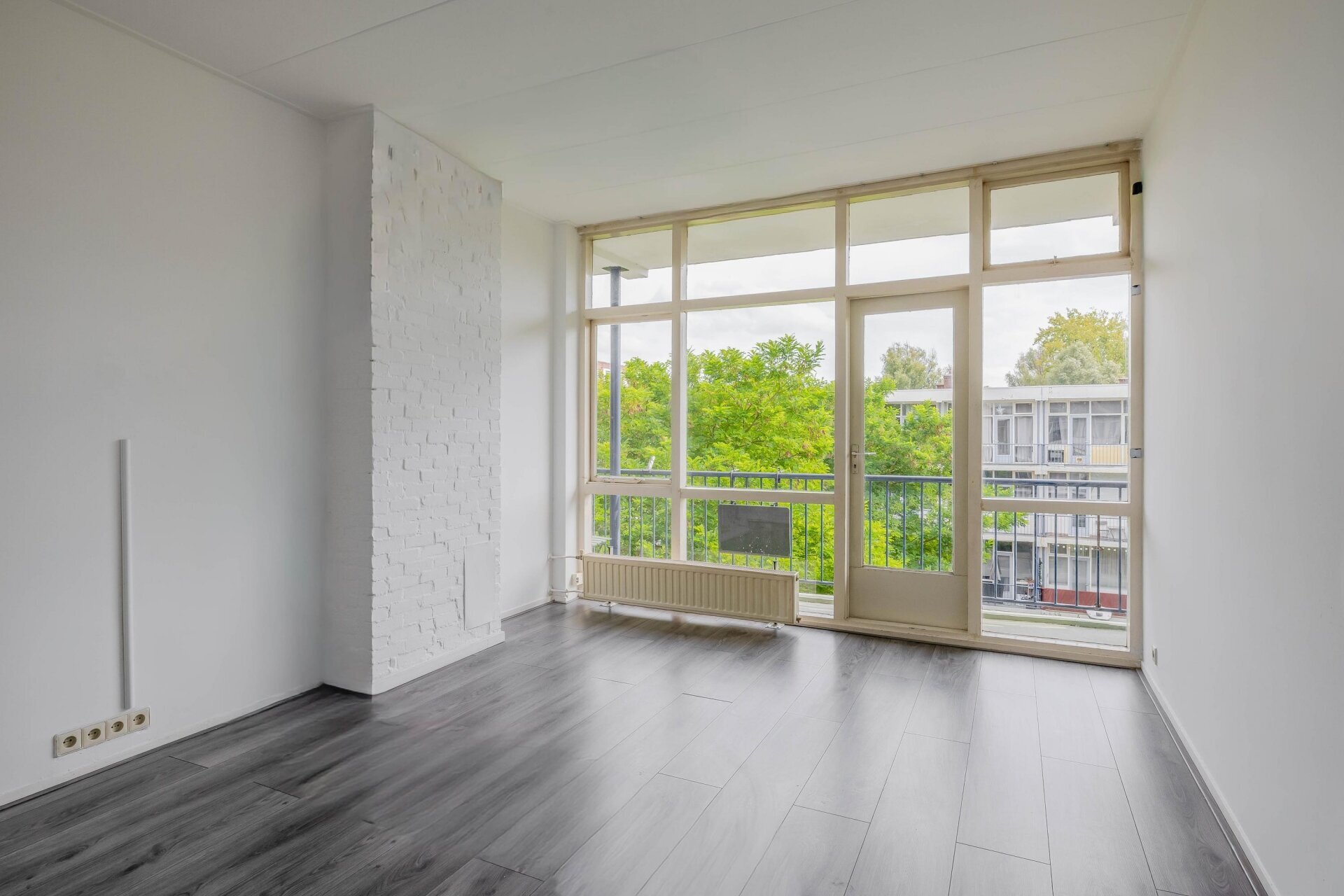 De woonkamer is licht en overzichtelijk, met grote ramen en een prettig uitzicht op het groen rondom het complex. Er is ruimte genoeg voor een gezellige zithoek én een eettafel, een fijne plek om te ontspannen of om bezoek te ontvangen.