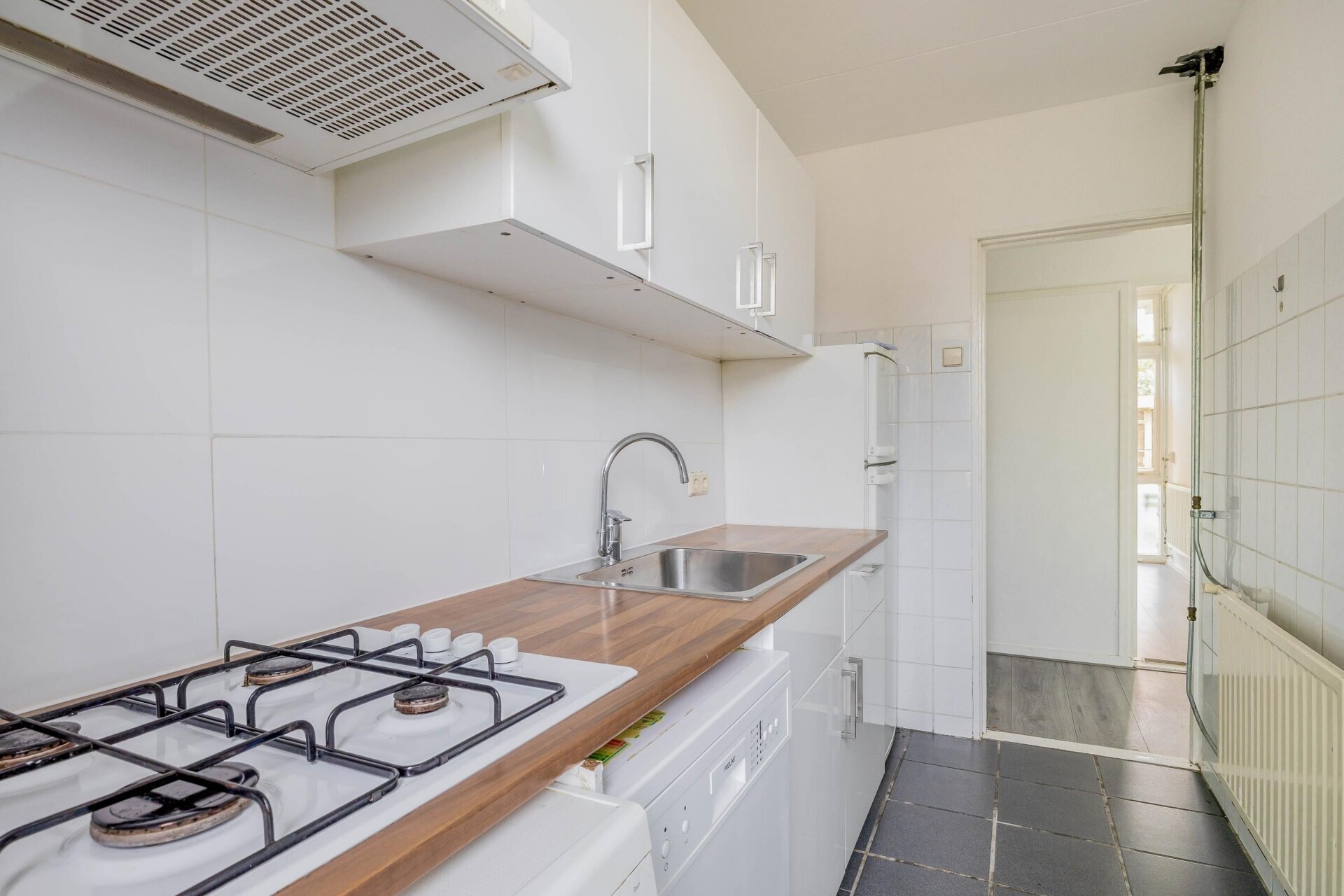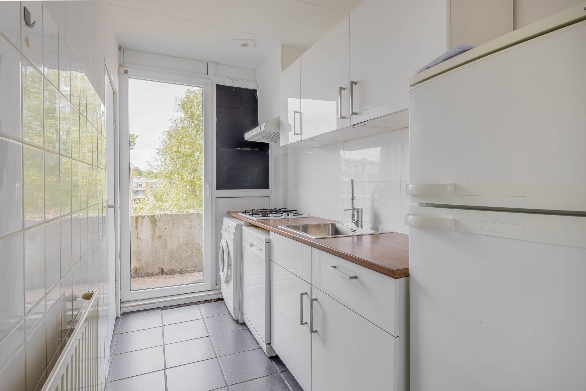 De keuken is apart van de woonkamer gelegen, eenvoudig maar netjes. Er is voldoende werkruimte en plek voor losse apparatuur. Dankzij de praktische indeling is de keuken ook makkelijk naar eigen smaak te moderniseren. De keuken geeft toegang tot het tweede balkon.