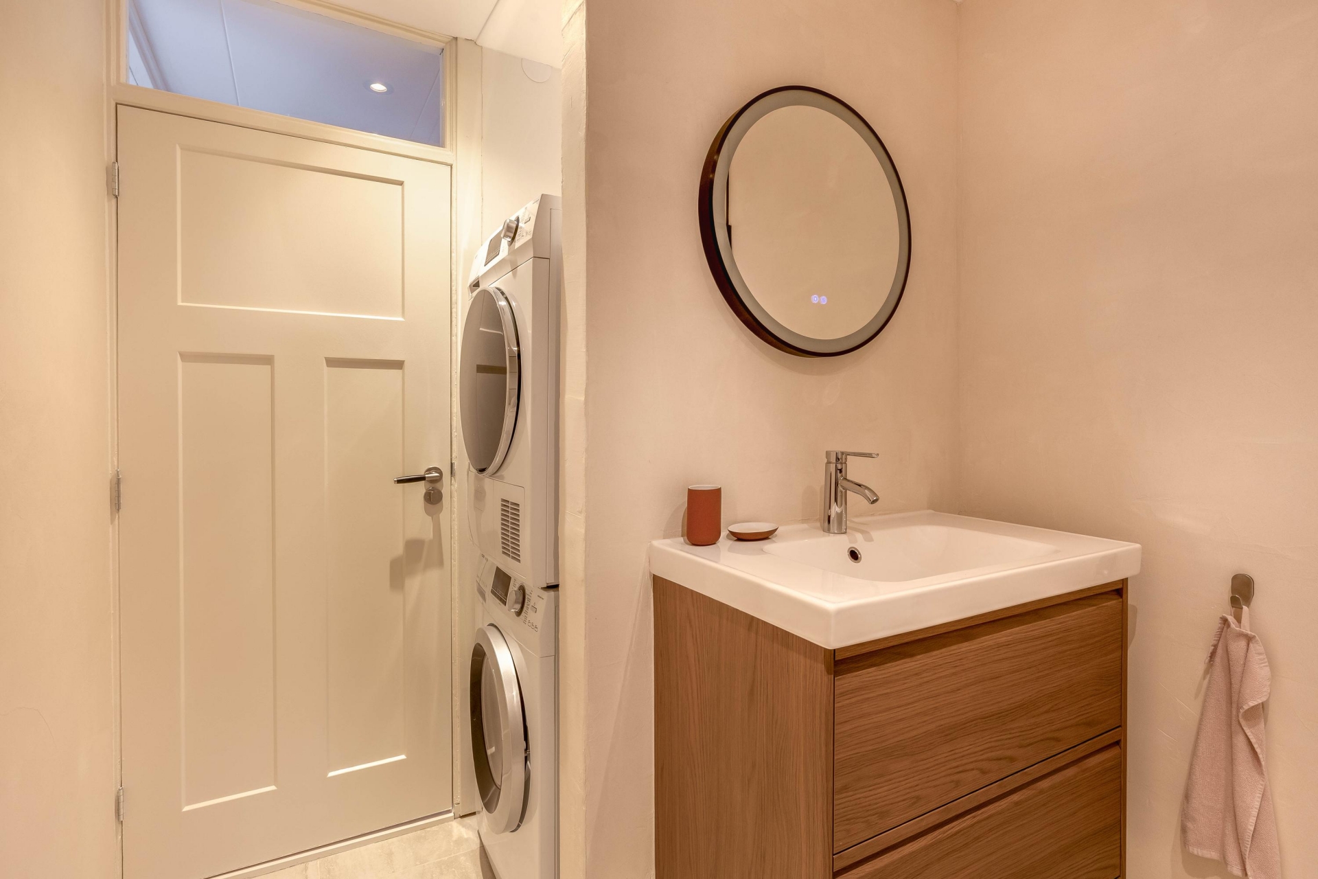 De badkamer (vernieuwd in 2023) is tot in de puntjes afgewerkt met moderne materialen en voorzien van een inloopdouche, wastafelmeubel en aansluitingen voor wasmachine en droger. Ook hier is gekozen voor een luxe uitstraling met betonciré en sfeervolle smartverlichting, die uiteraard achterblijft.