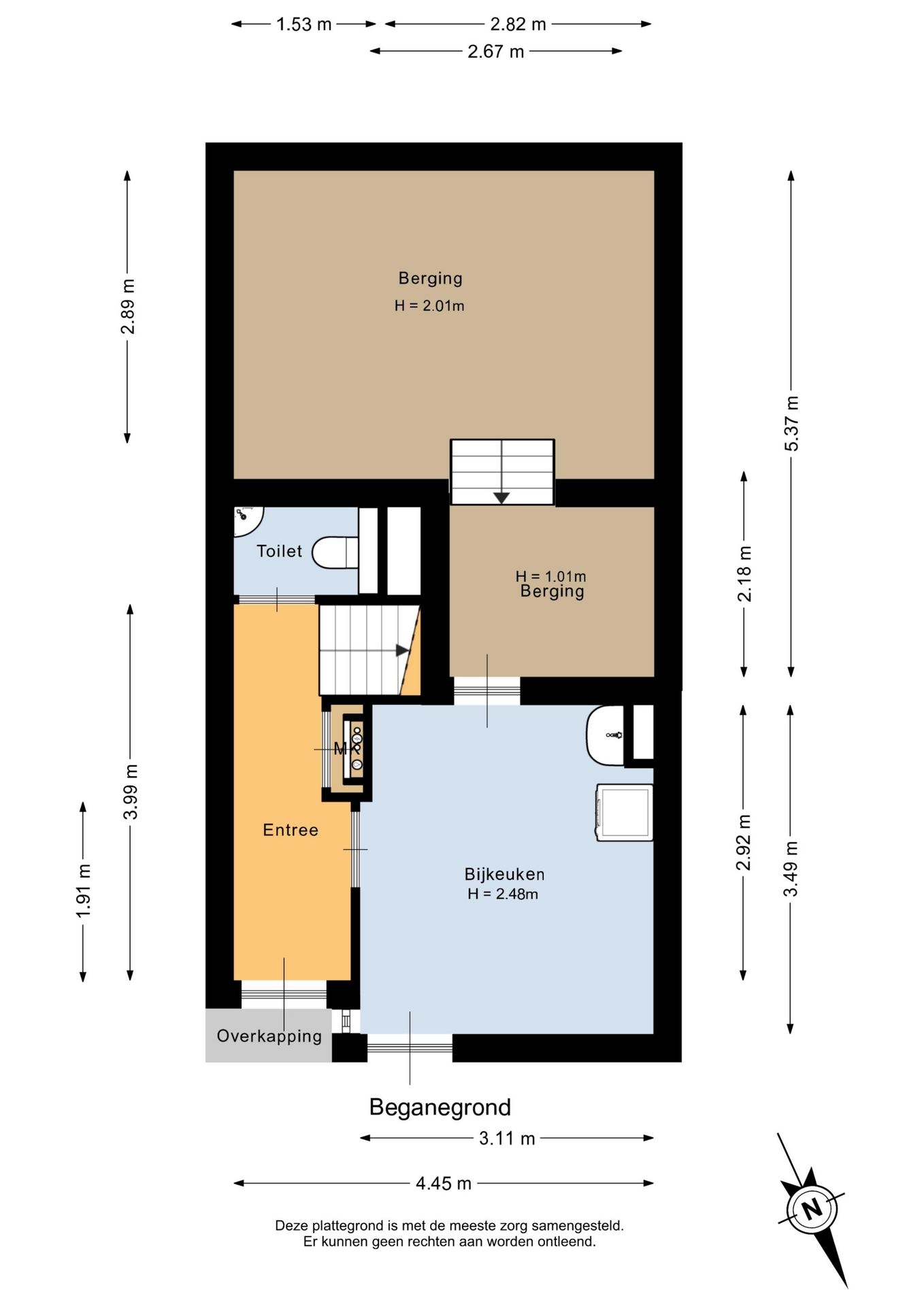 Op de begane grond bevindt zich de entree met toilet en meterkast. Daarnaast is er een ruime en multifunctionele bijkeuken. Deze ruimte is voorzien van verwarming, ventilatie en zowel koud als warm stromend water. Ook bevindt zich hier de aansluiting voor de wasmachine. Dankzij de aparte toegangsdeur is deze ruimte ideaal voor fietsen, opslag of als praktische werk- of hobbyruimte.