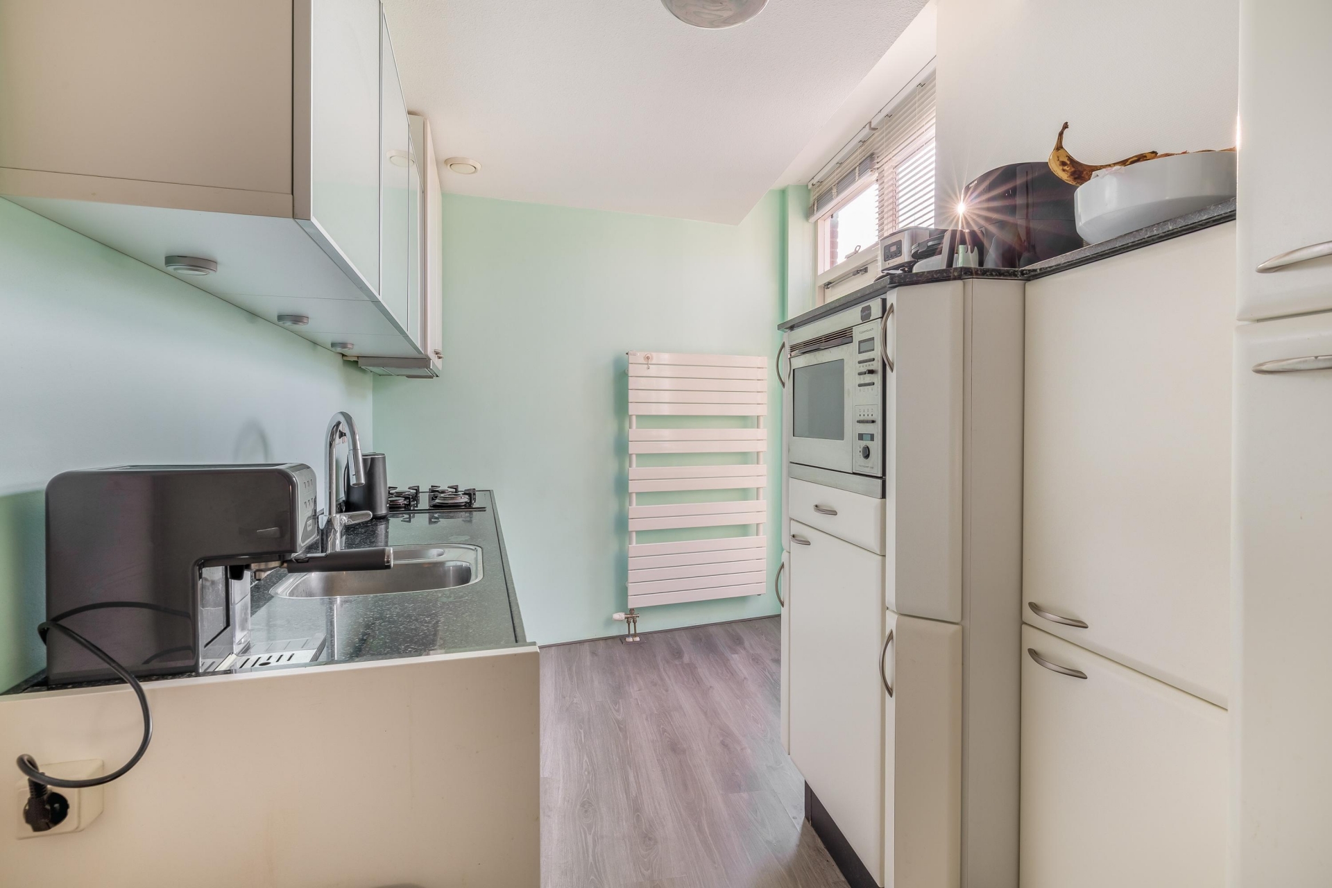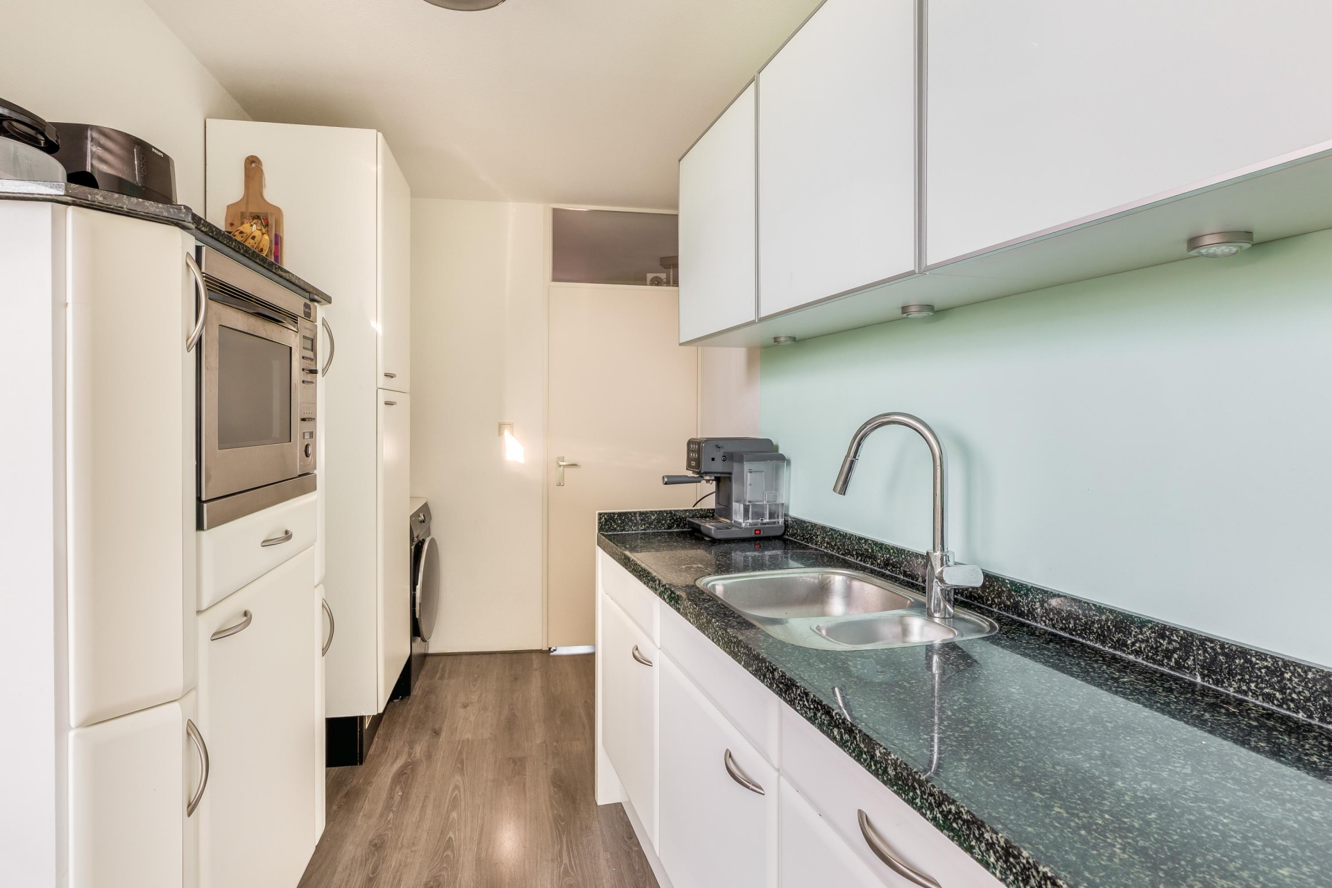 De keuken is praktisch en ruim van opzet, met voldoende werk- en bergruimte en voorzien van onder andere een vaatwasser, vrieskast en wasmachine. Vanuit de keuken is het balkon bereikbaar, waar je in de ochtend en vroege middag heerlijk van de zon kunt genieten.