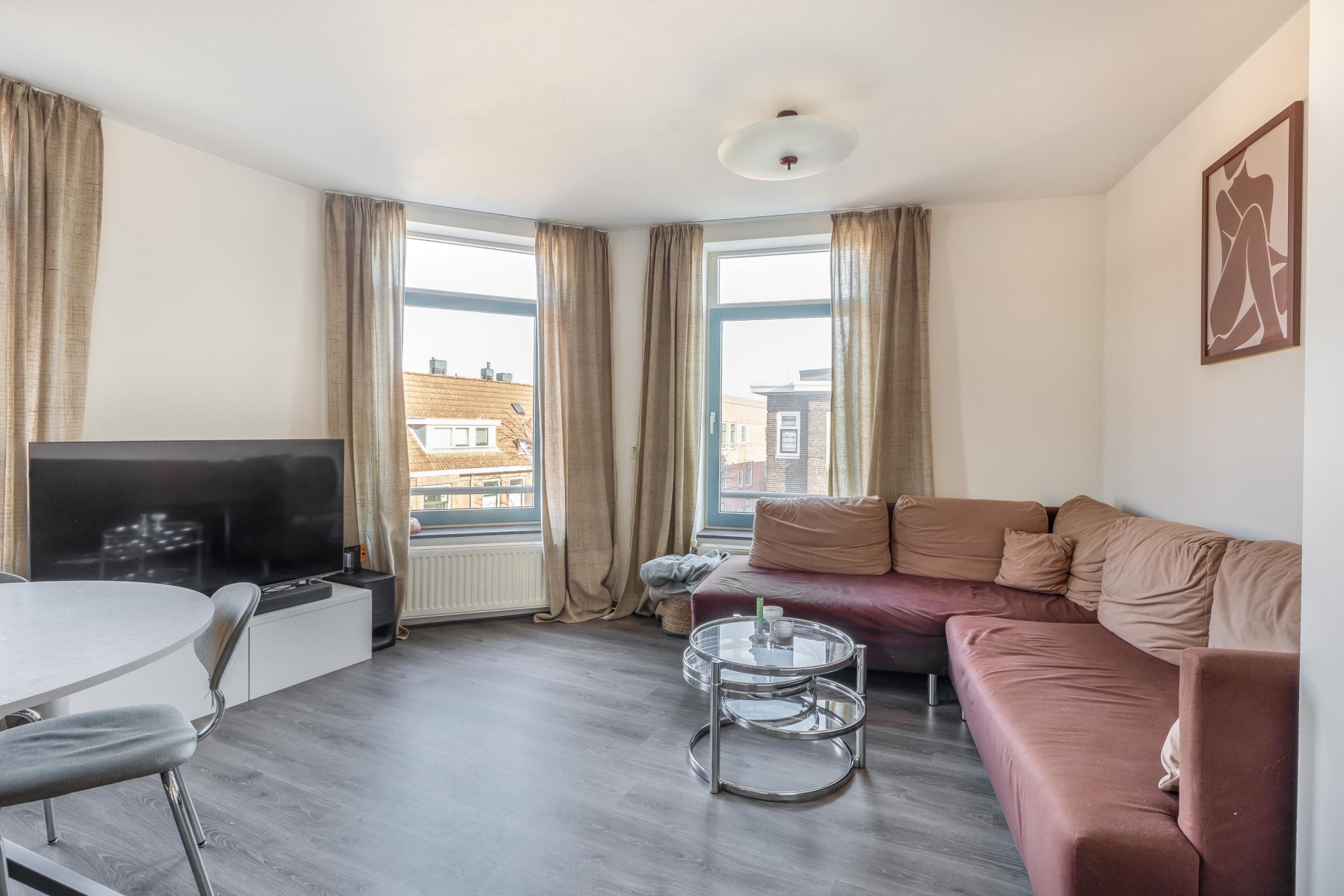 Dankzij de hoekligging en de vele ramen profiteer je hier de hele dag van een prettige lichtinval. De ruime woonkamer, gelegen op de hoek van het gebouw, vormt het centrale punt van de woning en biedt een fijn uitzicht over de omgeving - een ideale plek om te ontspannen of gasten te ontvangen.