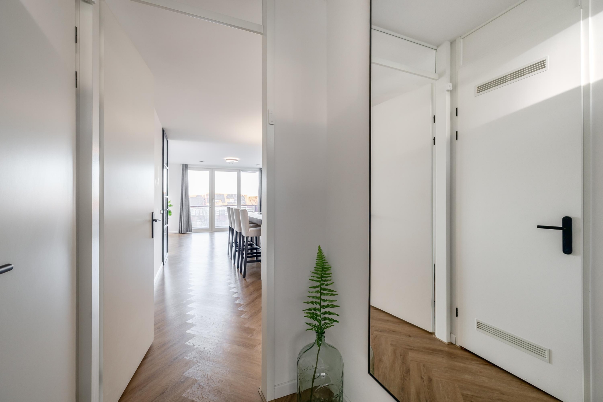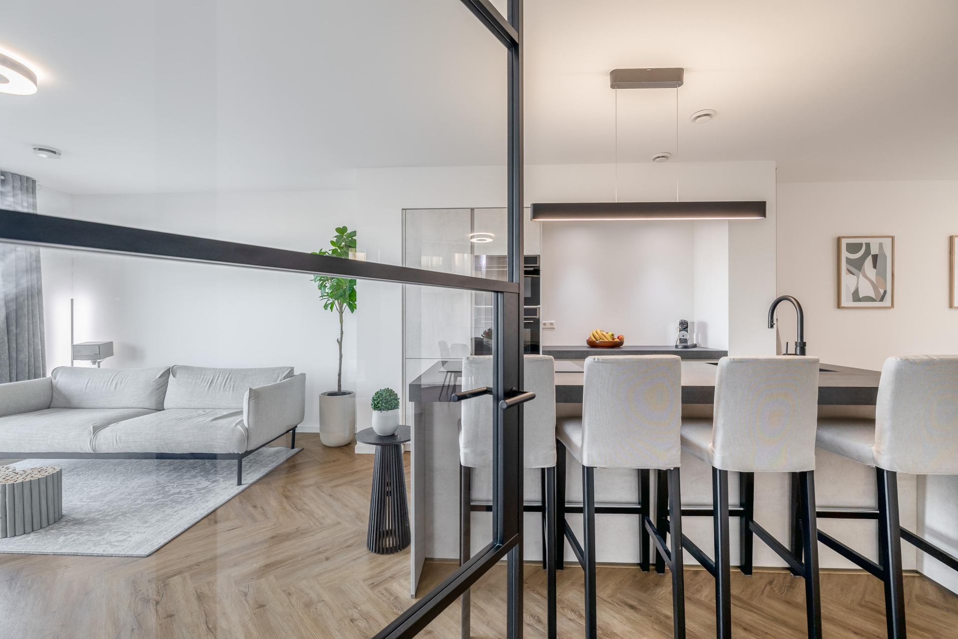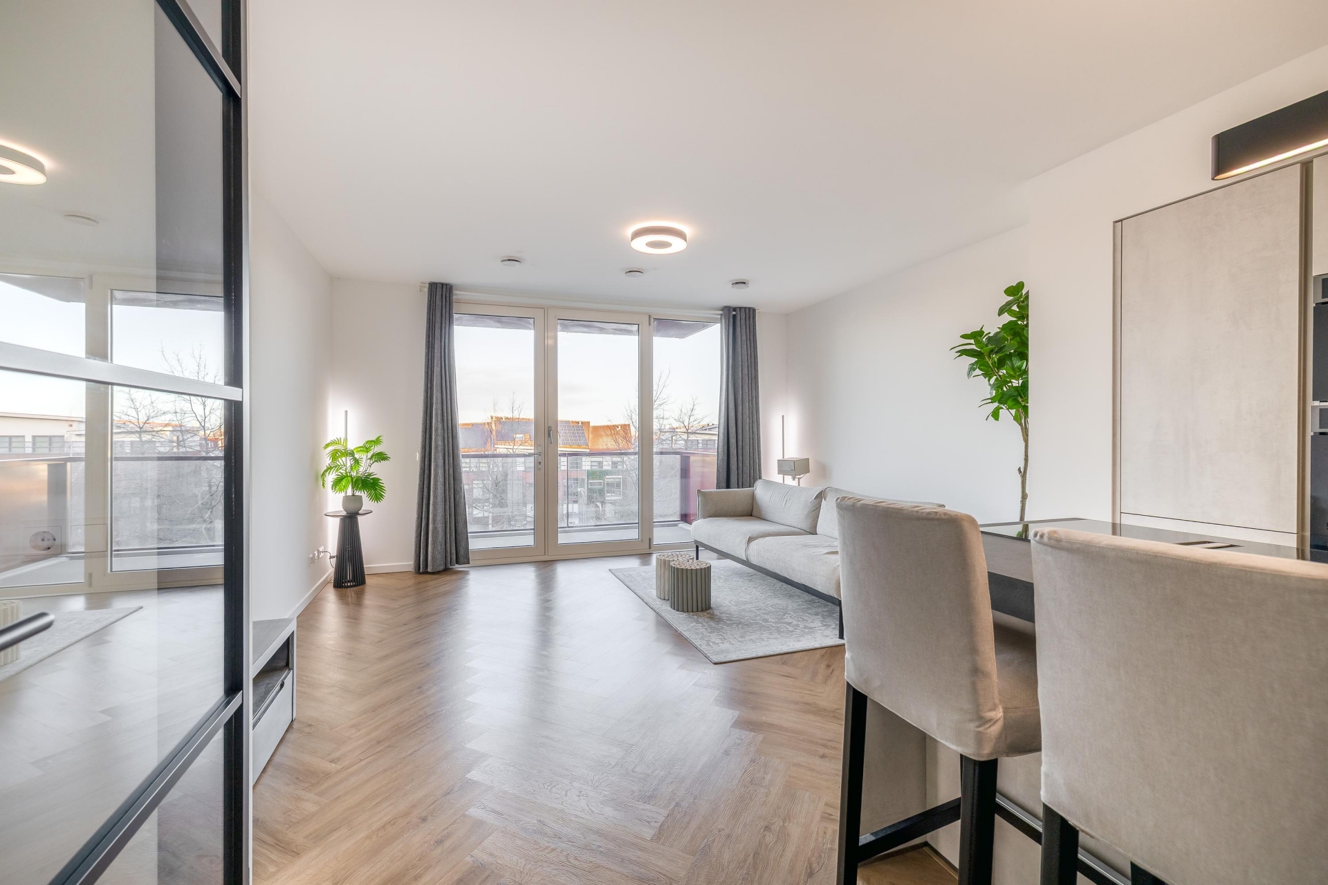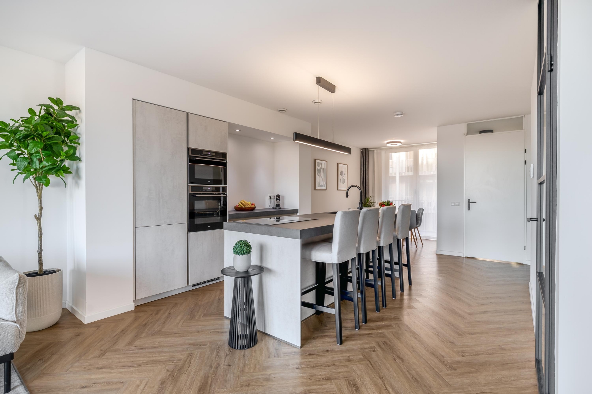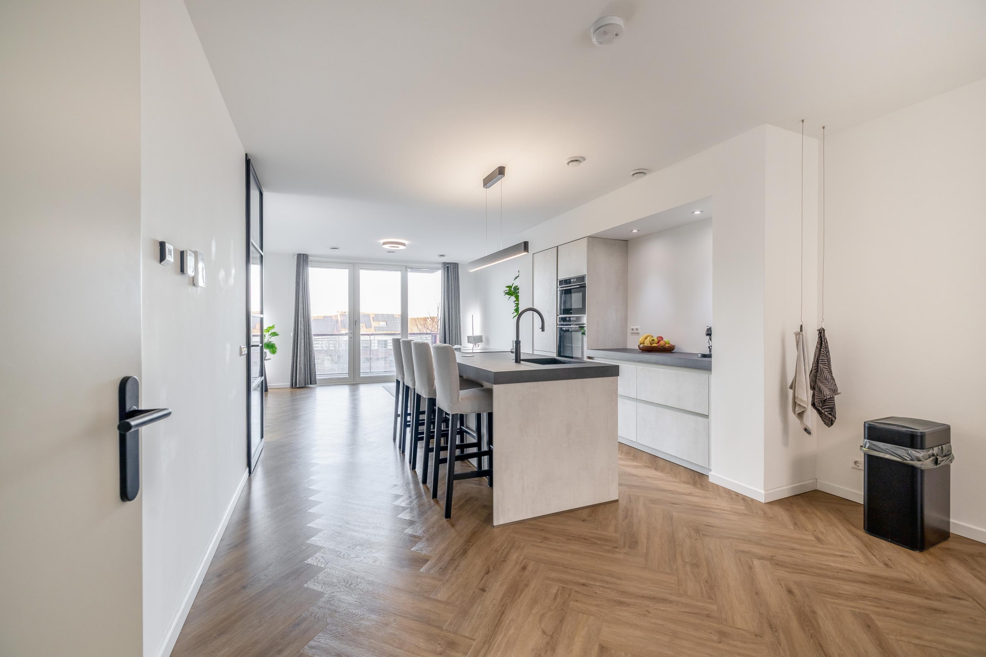 De woning is afgewerkt met een moderne visgraatvloer en dankzij de vele raampartijen valt er aangenaam veel daglicht naar binnen. Bovendien is het gehele appartement voorzien van vloerverwarming, wat zorgt voor optimaal gemak en wooncomfort.