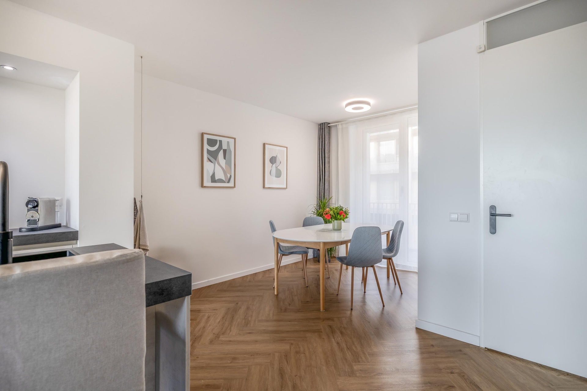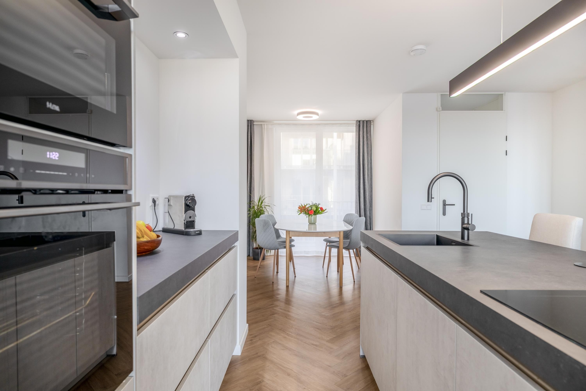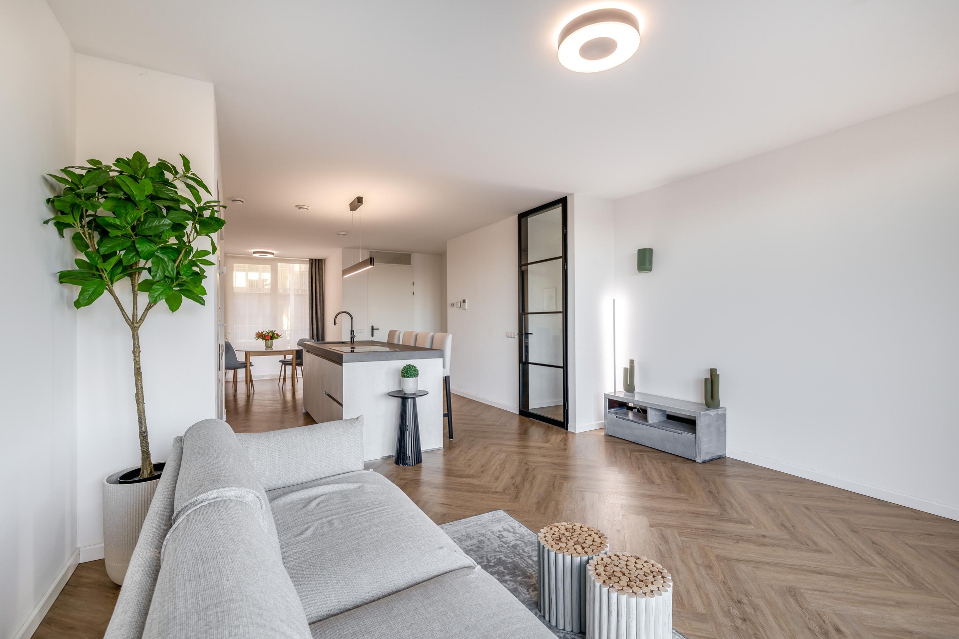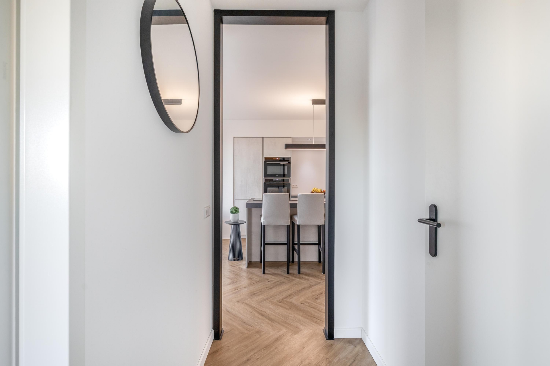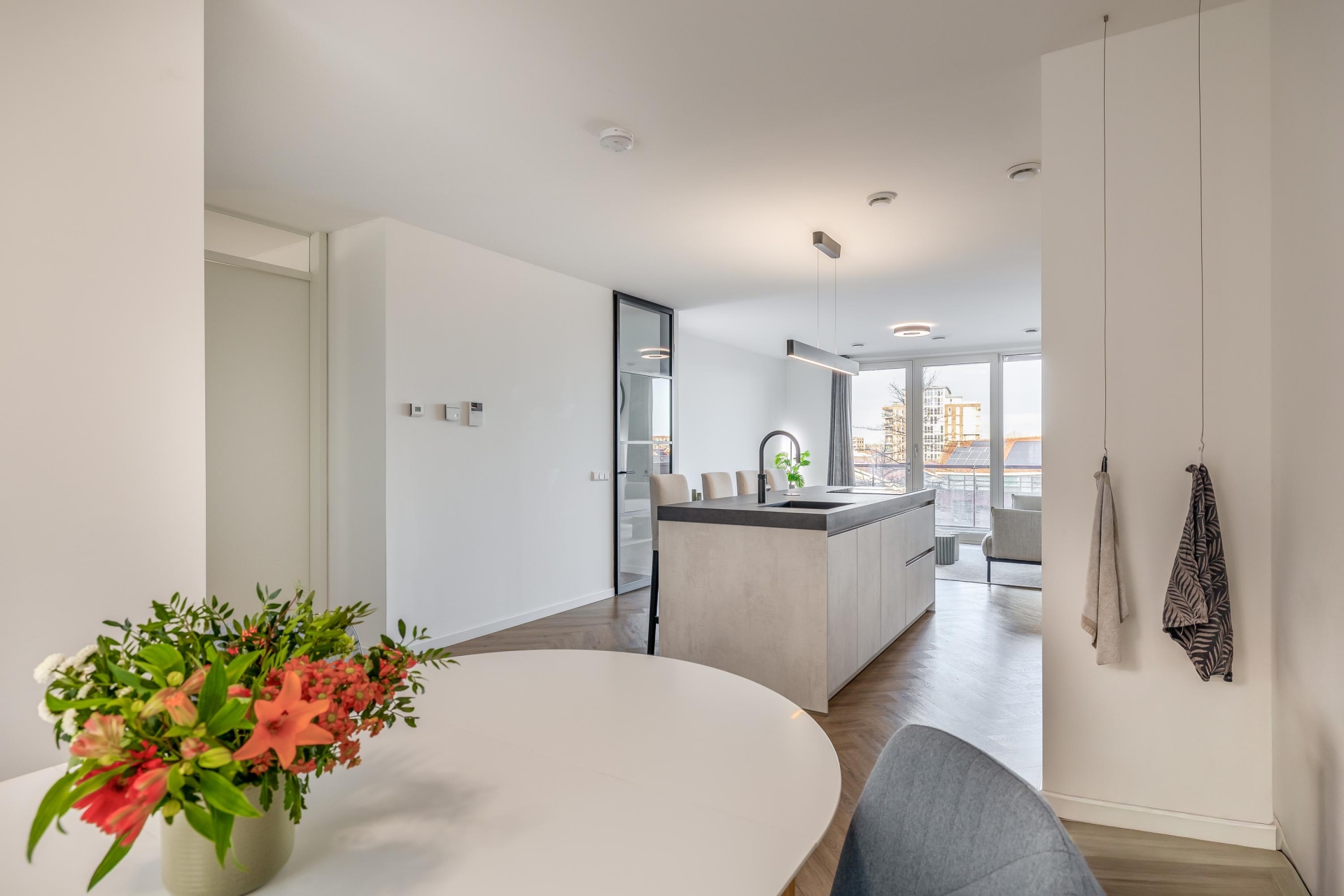 De woning is afgewerkt met een moderne visgraatvloer en dankzij de vele raampartijen valt er aangenaam veel daglicht naar binnen. Bovendien is het gehele appartement voorzien van vloerverwarming, wat zorgt voor optimaal gemak en wooncomfort.