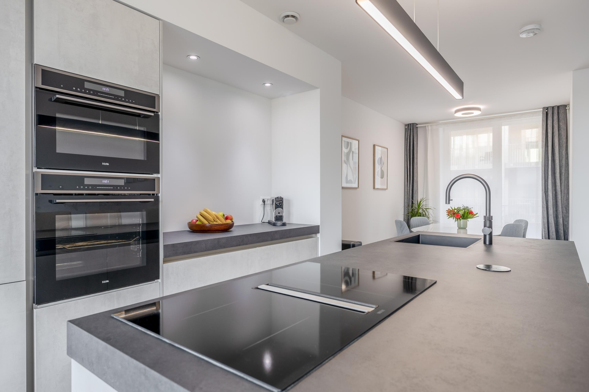 De keuken is zonder twijfel één van de eyecatchers van deze woning. De lichte kleurstelling geeft de keuken een luxe en moderne uitstraling. Uiteraard is de keuken volledig uitgerust met hoogwaardige inbouwapparatuur, waaronder een oven en combi-oven, een inductiekookplaat met geïntegreerd afzuigsysteem, een koel-vriescombinatie en een vaatwasser.